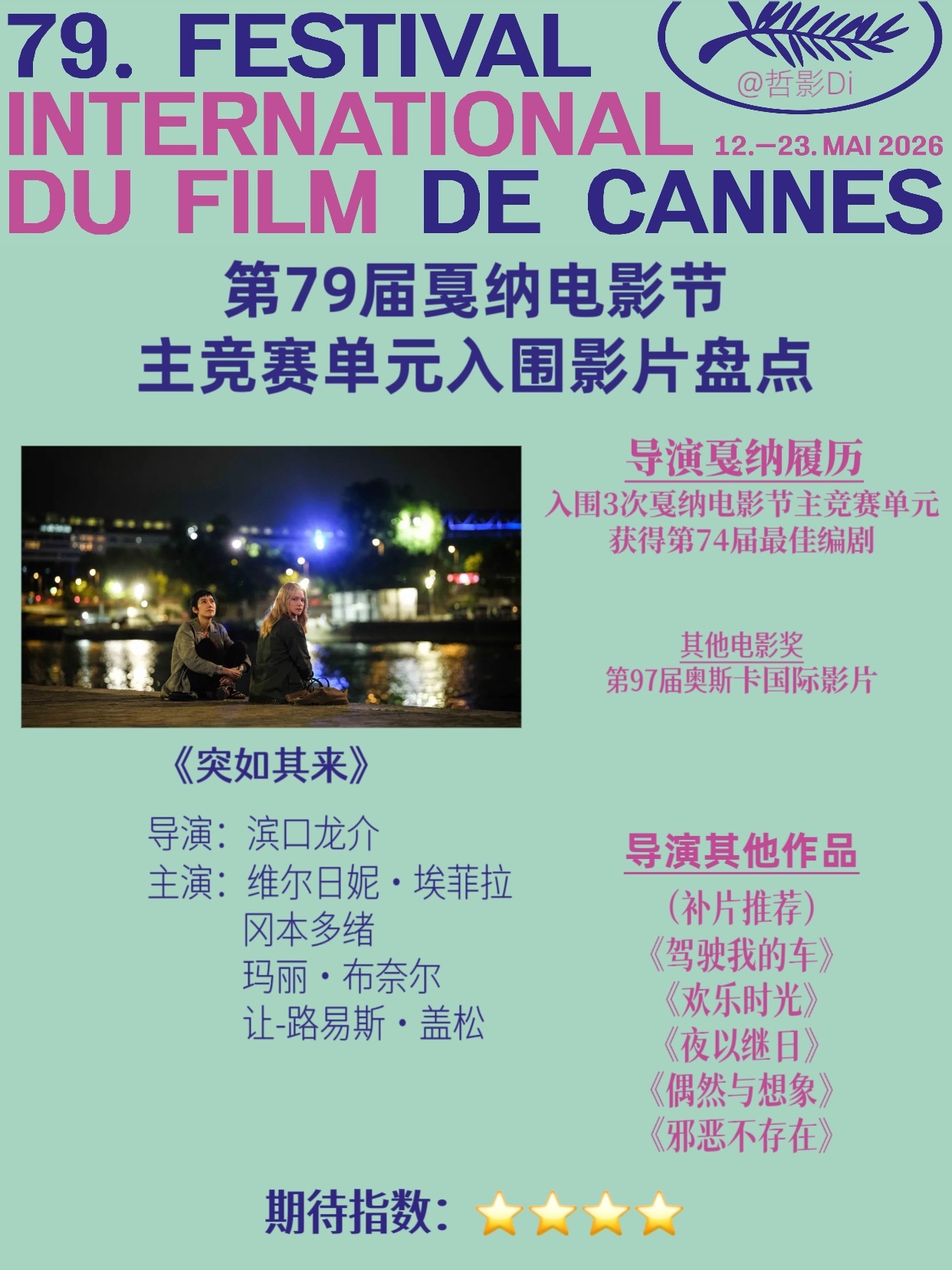 🌿第79届戛纳电影节主竞赛单元入围影片盘点(五)🎬影片:《突如其来》📹导演:滨口龙介🎭主演:维尔日妮·埃菲拉、冈本多绪、玛丽·布奈尔、让-路易斯·盖松等🎞️补片推荐:《驾驶我的车》《欢乐时光》《夜以继日》《偶然与想象》《邪恶不存在》