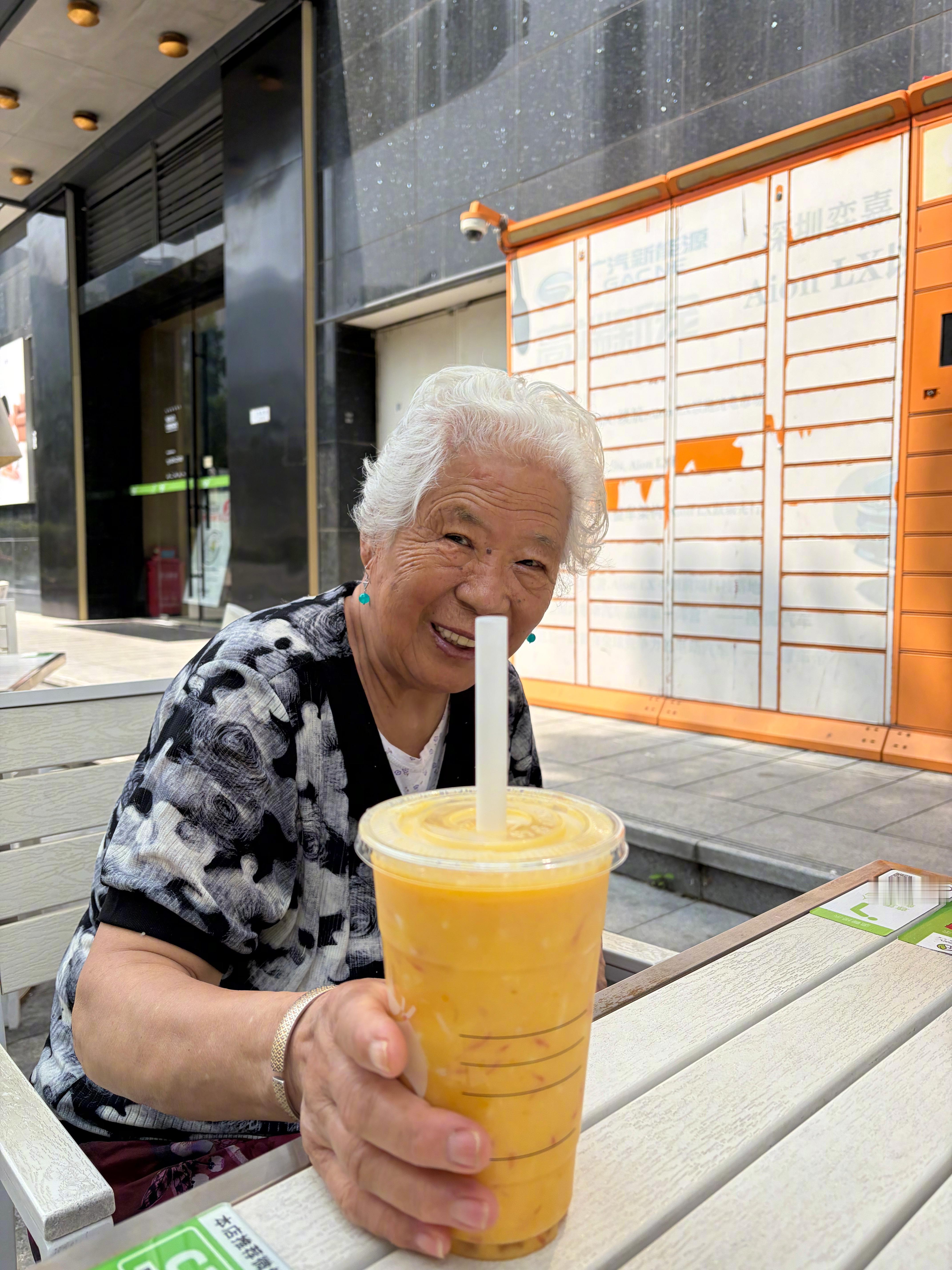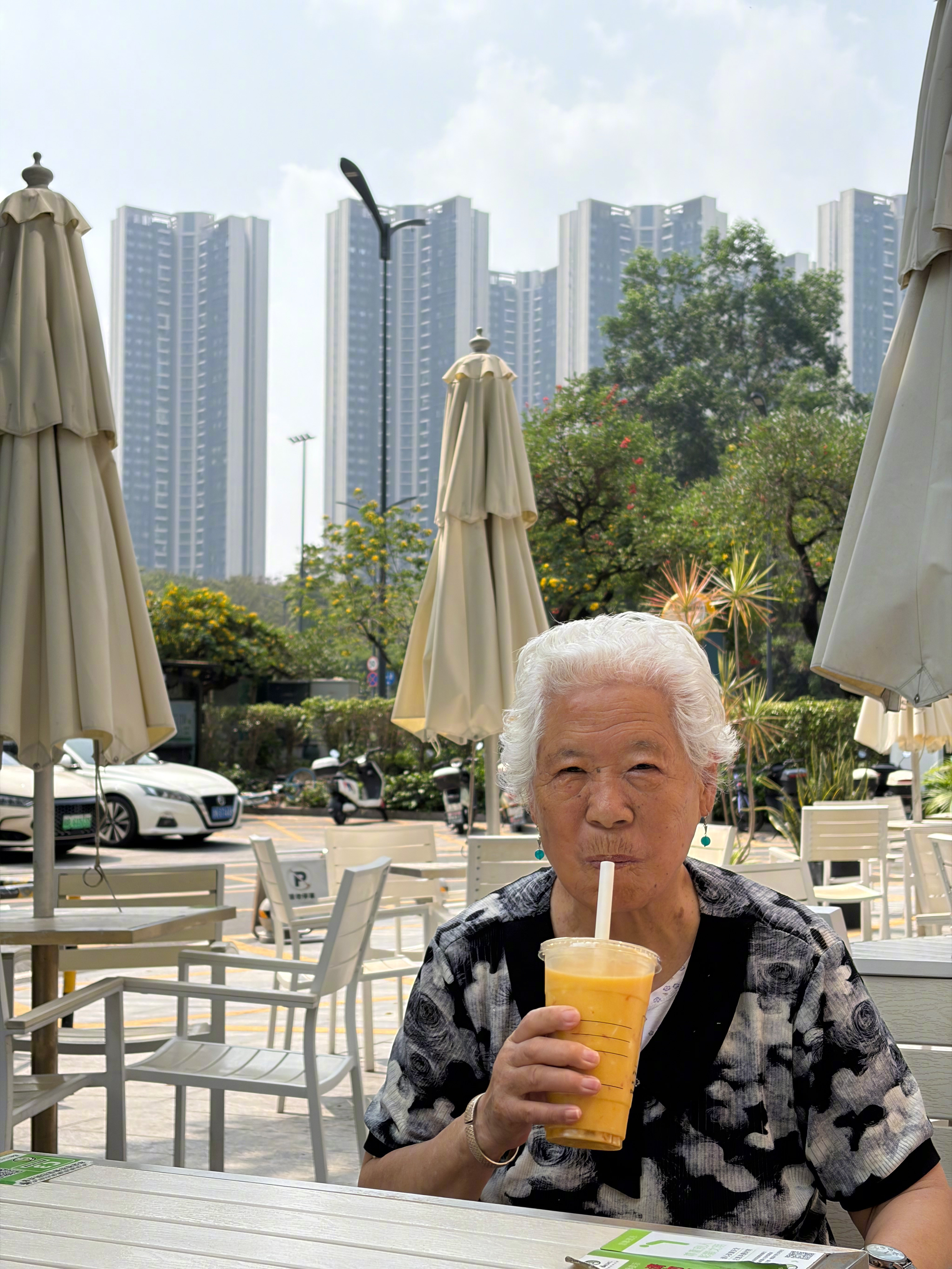 姥姥一听没事,顿时乐开了花。不急着回家,先给车充上电,想着带她尝尝瑞幸咖啡。问了家里人,知道她以前没喝过,还是点了杯果汁稳妥些。我问她好喝不,我姥笑眯眯地说:“你买的,能不好喝吗?”这情商,真是没谁了~ 深圳