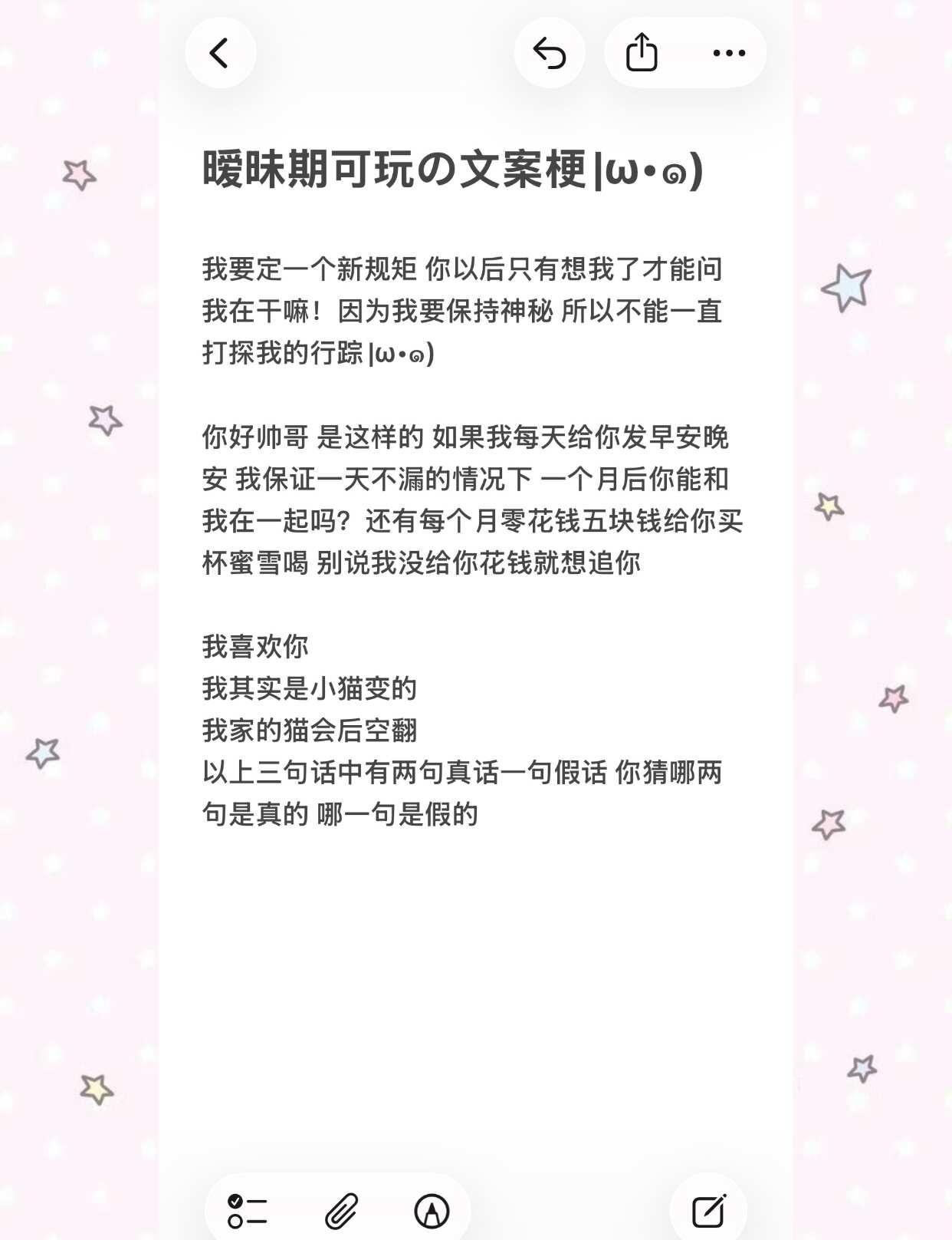 暧昧期可玩の文案梗(´・ω・`) _ ①为什么不找我聊天 我看起来不识字吗ᓀ‸ᓂ ②看你挺会走路的 要不要一起散散步ㅇㅂㅇ ③行吧 你去和别人聊天吧 有不会的字问我 •́‸ก ④在干嘛 想和我聊天请呼吸ᴛ ω ᴛ ⑤我号被盗了 一会如果找你问恋不恋爱 你同意就行了 ⑥你现在和我说话得注意点了 因为你的大头照已经被我开出来了⁃̀⩊⁃́ ⑦我脑子都用来想你了 你还说我笨⸝⸝o̴̶̷᷄ ·̭ o̴̶̷̥᷅⸝⸝ ⑧我要定一个新规矩 你以后只有想我了才能问我在干嘛!因为我要保持神秘 所以不能一直打探我的行踪|ω•๑) ⑨你好帅哥 是这样的 如果我每天给你发早安晚安 我保证一天不漏的情况下 一个月后你能和我在一起吗?还有每个月零花钱五块钱给你买杯蜜雪喝 别说我没给你花钱就想追你 ⑩我喜欢你 我其实是小猫变的 我家的猫会后空翻 以上三句话中有两句真话一句假话 你猜哪两句是真的 哪一句是假的 抽象文案 甜甜的恋爱 有梗文案 crush暧昧期绝杀文案 暧昧钓系文案 可爱文案 萌萌文案 情侣文案 调戏crush