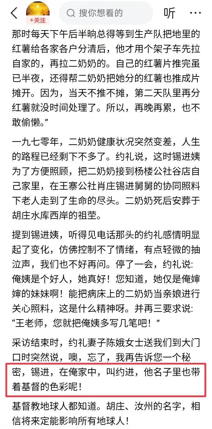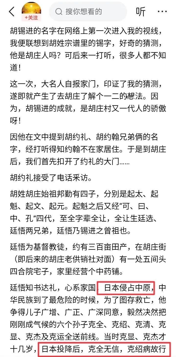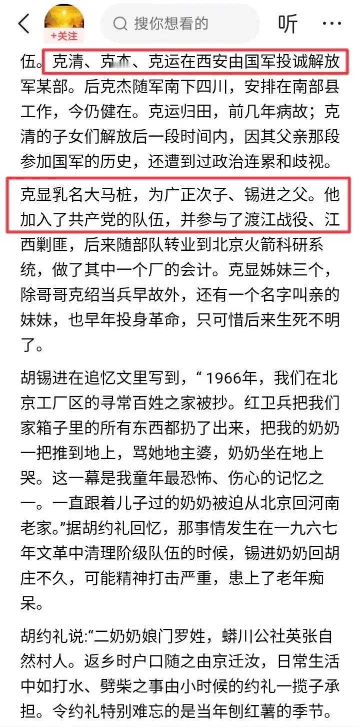 世人皆知胡锡进家族是地主世家和基督世家,却不知胡家还是国军世家,曾为蒋家王朝效力多年,这是怎么回事呢? 根据胡家长辈胡约翰、胡约礼等人在2020年的讲述,胡家五个子弟早在上世纪40年代就参加了国军,时间在“日军侵占中原”之后。 须知河南省大部沦陷于1944年的豫湘桂战役,符合“日军侵占中原”的情形。当时驻扎河南中东部的蒋鼎文部和汤恩伯部都被日军击溃,唯有驻守豫西的胡宗南部较为完整,所以胡家五子弟大概率加入了胡宗南部国军。 胡家长辈提到“日本投降后,克全无信,克绍病故行伍”,可见还没打什么仗,胡克全就失踪了,胡克绍就在军中病故。 剩下的三个胡家子弟“克清、克杰、克运在西安由国军投诚解放军某部”。因为西安在1949年5月20日解放,而南京早在同年4月23日就解放,可见三个胡家子弟随胡宗南部跟西野打了三年多的内战,直到无可挽回才投诚。 至于“克字辈”最小的胡克显(胡锡进父亲),迟至1949年才投奔解放军,随后参加了渡江战役、江西剿匪等。可见胡克显并未参加淮海战役,而是等到三大战役全部结束、天下大势已定之后,才在渡江战役前投奔我军。 那么胡锡进的叔伯辈有五个参加国军,其中三个叔伯几乎打满三年内战,唯有胡父在解放战争末期才投奔共产党,老胡家族算不算国军世家呢?