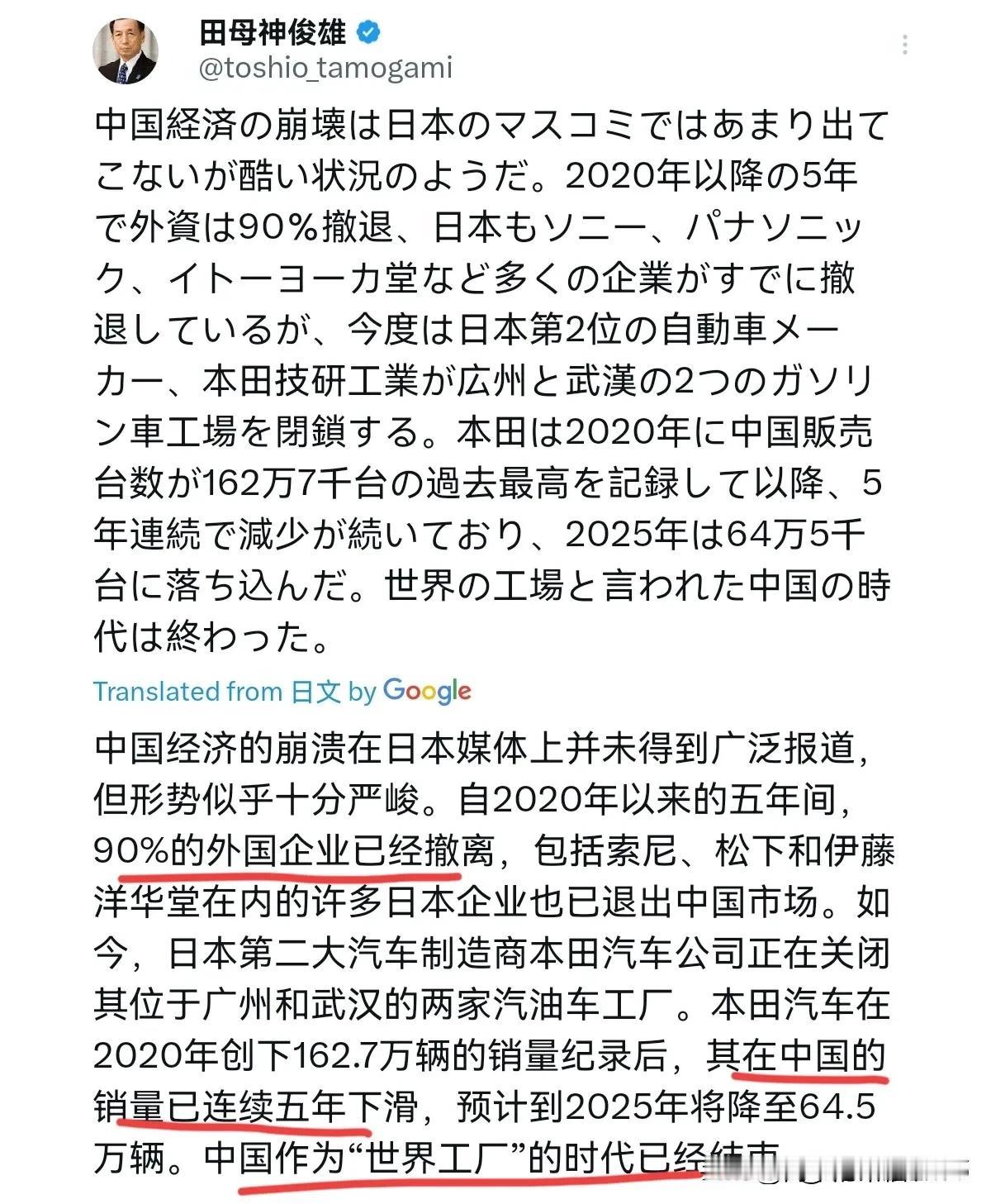 罔顾事实颠倒黑白!4月19日,日本前航空幕僚长田母神俊雄公开发表荒谬言论,公然声称“中国时代已然终结”,还大肆渲染“中国经济濒临崩溃”。 甚至编造出“2020年后五年外资撤离90%”“日企大规模撤出中国”的虚假言论,还拿本田关闭在华部分燃油车工厂说事,妄图以此佐证自己的荒唐观点。 这番言论看似煞有介事,实则通篇都是谎言,完全是罔顾事实、颠倒黑白的无稽之谈,不仅暴露了此人对中国经济、产业发展的一无所知,更将日本右翼分子偏执、狭隘又极度虚弱的内心,展露无遗。 稍有常识的人都能看出,这位日本前高官的发言,根本不是基于客观事实的判断,而是带着极端偏见的政治抹黑,是一场自欺欺人的舆论闹剧。 田母神俊雄为了佐证自己的谎言,特意拿日本在华企业做文章,点名索尼、松下、伊藤洋华堂等企业,声称它们已大规模撤出中国,又将本田关闭广州、武汉两家燃油车工厂,当作“中国经济崩溃”的铁证。 还刻意列出本田销量数据:2020年在华销量162.7万辆达峰值后,连续五年下滑,2025年跌至64.5万辆,以此推导“世界工厂中国时代终结”的结论,逻辑之荒谬、立场之偏颇,简直令人啼笑皆非。 首先,其所谓“2020年后五年外资撤离90%”“日企大规模撤出中国”,完全是信口胡诌,没有任何数据和事实支撑。中国商务部历年数据清晰显示,过去五年,中国实际使用外资始终保持稳定增长。 即便面对全球经济下行、地缘政治冲突等多重压力,中国依旧是全球最具吸引力的外资投资目的地之一。大量外资企业持续加码中国市场,不断扩大在华投资布局,所谓“九成外资撤离”,纯粹是凭空捏造的谎言。 而日企在华发展的真实情况,更是狠狠打了此人的脸。索尼、松下等日本知名企业,从未撤出中国市场,反而持续深耕中国产业链,根据中国市场需求调整业务布局,加大在新能源、智能化、高端制造等领域的投入。 即便是被拿来当“证据”的本田,其在华业务调整,也和“中国经济崩溃”毫无关系,不过是全球汽车产业转型下的正常商业选择。众所周知,当下全球汽车行业正经历新能源化、智能化的颠覆性变革。 中方新能源汽车产业异军突起,自主品牌强势崛起,凭借技术优势、性价比优势和市场适配性,迅速抢占国内市场份额。而日本车企长期沉迷燃油车技术,在新能源转型上步伐缓慢、技术滞后,产品竞争力大幅下滑,才导致本田等日企在华销量连续走低。 本田关闭燃油车工厂,本质是自身转型失败、跟不上中国市场发展节奏的结果,是日本汽车产业整体衰落的缩影,恰恰说明不是中方不行了,而是日本企业落后了。 田母神俊雄故意混淆因果,把日本企业的自身失利,歪曲成中国经济衰退,这种偷换概念、颠倒黑白的伎俩,既无知又可笑,足以见得其为了抹黑中方,已经到了不顾基本事实的地步。 抛开虚假数据和荒谬逻辑,深挖田母神俊雄发表此番言论的根源,不难看出这是日本右翼分子的典型思维在作祟。长久以来,日本右翼势力始终抱着陈旧的偏见和敌意,无法接受我们快速崛起、实现全方位超越的事实。 他们内心深处坚信,只有我们衰落,日本才能摆脱当下的发展困境,才能维持所谓的“优越感”,所以处心积虑寻找、甚至编造我们“衰落”“崩溃”的证据,以此反证自己的正确,寻求自我安慰。 随着我们在经济总量、科技研发、军事国防、国际影响力等领域,全面实现对日本的超越,日本右翼势力的焦虑和恐惧愈发强烈。他们害怕中国日益强大,害怕自身曾经的侵略罪行被彻底清算,害怕日本在东亚乃至全球的地位彻底边缘化。 却又无力改变中国稳步发展的客观事实,只能通过编造谎言、发表极端言论的方式,营造“即将崩溃、日本依然优越”的虚假幻象,靠自欺欺人来填补内心的虚弱和恐慌。 这样的言论,不仅没有任何事实依据,更无法改变中国稳步发展的客观现实。中国作为“世界工厂”的地位,依托的是完整的工业体系、强大的产业链供应链优势、庞大的国内市场和持续升级的科技创新能力,绝非几句谎言就能动摇。 外资用实际行动投票,全球企业持续深耕中国市场,就是对“中国经济崩溃论”最有力的回击。田母神俊雄的这番狂言,说到底只是日本右翼分子的一场自我狂欢。 他们活在自己编织的虚幻梦境里,用谎言掩盖内心的虚弱,用抹黑逃避现实的差距,最终只会沦为国际社会的笑柄。事实胜于雄辩,中国的发展成就有目共睹,时代发展的大势更不会因几句荒谬言论而改变。 日本右翼势力与其编造谎言自我安慰,不如正视中国发展的客观事实,正视自身的问题与差距,放弃偏执的敌对思维,否则只会在自我封闭和自欺欺人中,愈发落后于时代。