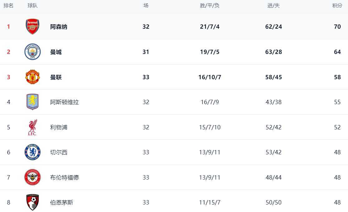在积分榜上,阿森纳以70分高居榜首,战绩是21胜7平4负。曼城排名第2,拿到了64分。曼城落后6分。接下来阿森纳与曼城的直接对决将极大地影响到冠军的归属。曼联赢球之后,总积分达到58分,排名第3。第4的是阿斯顿维拉,拿到55分。利物浦以52分排名第5。切尔西输球之后,依然是48分,排名第6,争五前景有点悲观。热刺只拿到31分,排名倒数第3,陷入降级区。