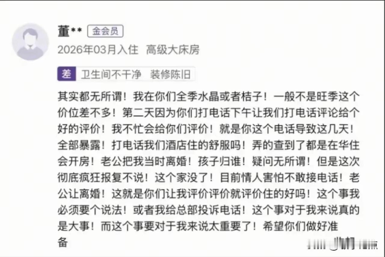 真是笑死,一点遮羞布都不要!山西大同一女子与情人开房,因酒店的回访电话被丈夫发现,结果家庭破碎。于是这女子不仅给酒店差评,称露行程信息,更是找总部要个说法。虽然说酒店回访的确欠妥当,但是只能说促进了该女子离婚的进程,这种外面野草不断的,婚姻又能好到哪去。出轨情人 宾馆开房记录