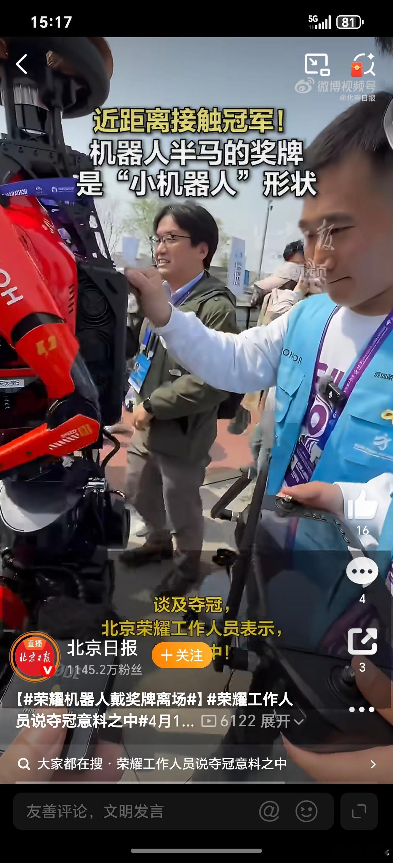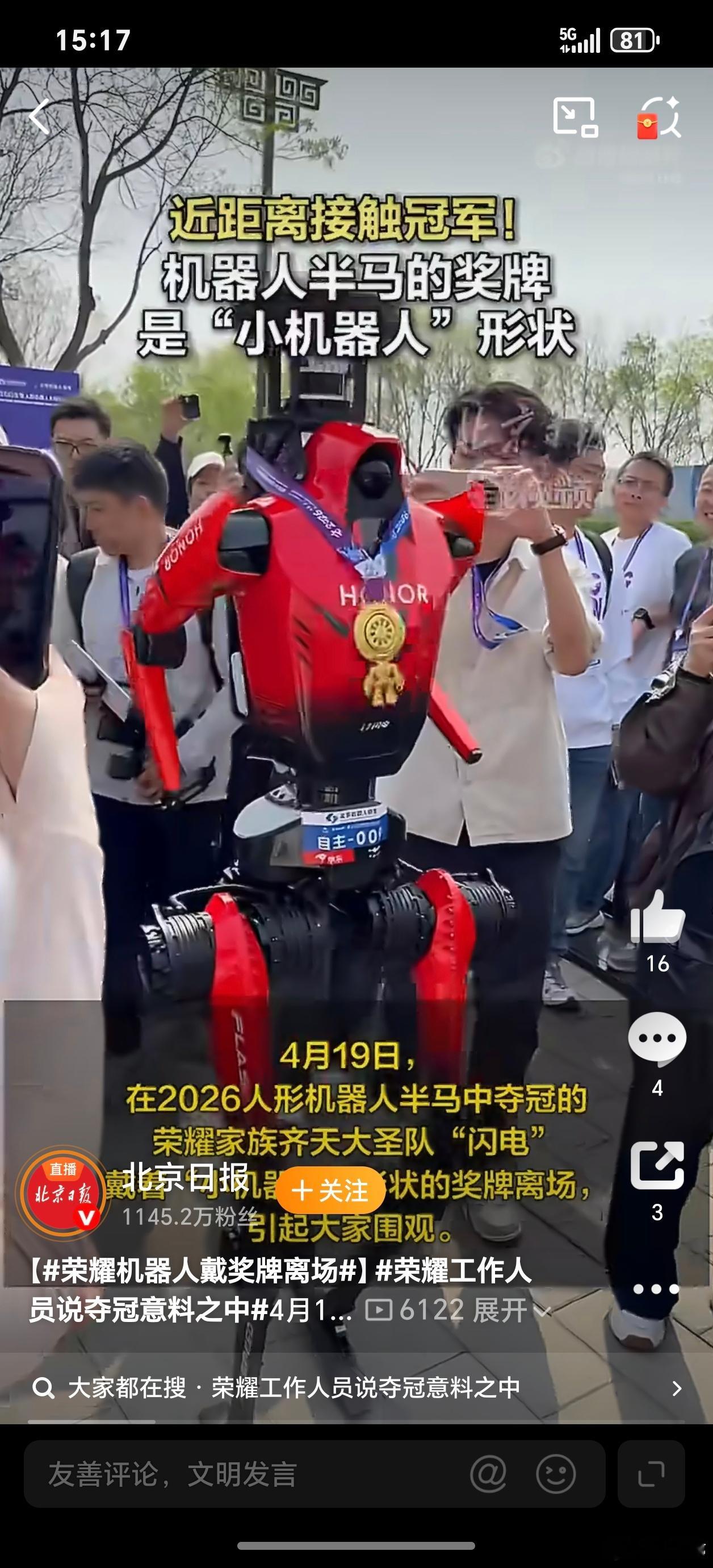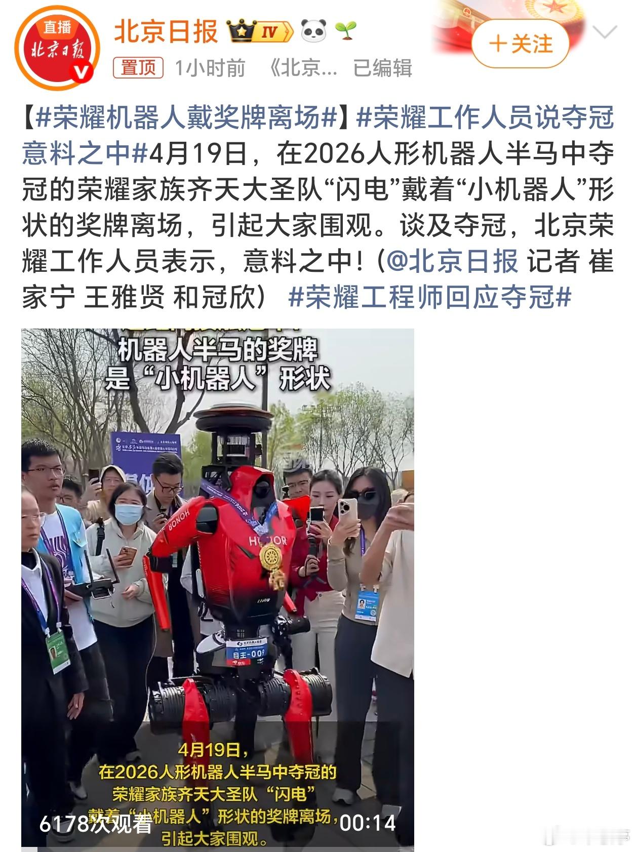 荣耀机器人戴奖牌离场荣耀机器人半马夺冠,人类创造的机器人散步超越了人类,这奖牌🏅一带确实很酷啊!