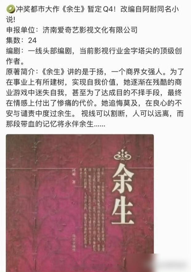 杨紫要演腹黑女强人?别激动,这个S+大饼,连锅都还没买。 你掰着指头数数,《欢乐颂》、《大江大河》、《都挺好》,哪一部不是正午阳光捧出来的?阿耐的本子,侯鸿亮他们捂得比谁都紧。 所谓的女强人三部曲,《风吹半夏》已经播了,但《余生》这本书,05年就出版了,你现在去查,影视版权的章,一个都没盖出去。 所以,现在传的10月底开机,S+班底,听听就行了。没有米,你拿什么锅煮饭?这都是圈里放风试水温的套路。 别让资本的喧嚣,盖过了好故事的呼吸;别让流量的狂欢,耗尽了演员的羽翼。