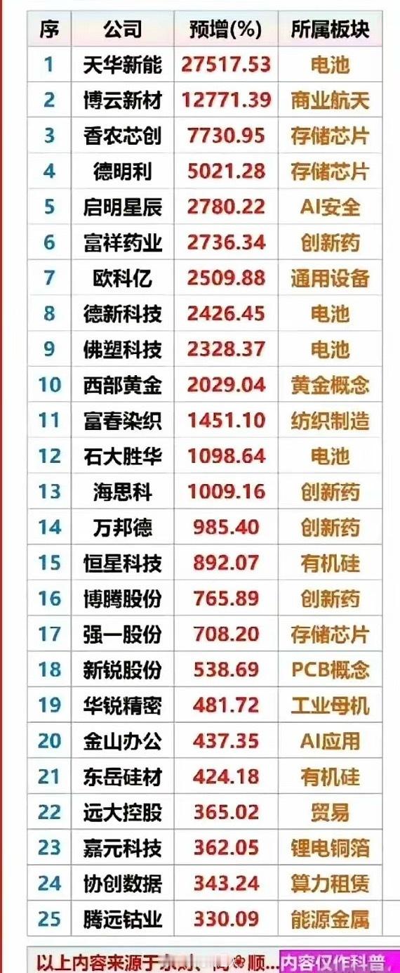 一季报炸裂!最高预增超275倍,这25只高成长龙头全梳理!这份一季报业绩预增标的,预增幅度从330.09%至27517.53%不等,头部标的业绩弹性极高。标的集中于电池、存储芯片、创新药、商业航天等高景气赛道,业绩驱动多为行业回暖、产能释放与产品结构优化,兼具成长与景气度。个股梳理分析1. 天华新能:一季报预增27517.53%,属电池板块。受益锂电材料需求回暖,产能释放带动业绩爆发,为本次榜单预增幅度最高标的。2. 博云新材:一季报预增12771.39%,属商业航天板块。航天材料业务受益行业高景气,订单放量推动业绩大幅增长,预增幅度位居第二。3. 香农芯创:一季报预增7730.95%,属存储芯片板块。受益存储芯片行业周期回暖,分销业务规模大幅增长,带动业绩实现高增。4. 德明利:一季报预增5021.28%,属存储芯片板块。深耕存储芯片控制芯片领域,产品出货量提升,行业景气上行推动业绩大幅增长。5. 启明星辰:一季报预增2780.22%,属AI安全板块。AI安全业务需求释放,订单交付加快,叠加成本优化,业绩实现扭亏高增。6. 富祥药业:一季报预增2736.34%,属创新药板块。原料药及CDMO业务回暖,订单与毛利率同步提升,推动业绩实现大幅增长。7. 欧科亿:一季报预增2509.88%,属通用设备板块。硬质合金刀具业务受益制造业复苏,产品结构优化带动盈利提升,业绩大幅增长。8. 德新科技:一季报预增2426.45%,属电池板块。锂电池材料业务需求回暖,产能利用率提升,叠加资产处置收益,推动业绩高增。9. 佛塑科技:一季报预增2328.37%,属电池板块。锂电隔膜业务受益新能源需求复苏,订单放量带动业绩实现大幅增长。10. 西部黄金:一季报预增2029.04%,属黄金概念板块。金价上行带动盈利提升,黄金业务量价齐升,推动业绩实现大幅增长。11. 富春染织:一季报预增1451.10%,属纺织制造板块。色纺纱业务需求回暖,产品毛利率修复,推动业绩实现大幅增长。12. 石大胜华:一季报预增1098.64%,属电池板块。锂电电解液溶剂业务受益行业回暖,产品价差修复,带动业绩实现大幅增长。13. 海思科:一季报预增1009.16%,属创新药板块。创新药及仿制药业务放量,核心产品销售回暖,推动业绩实现大幅增长。14. 万邦德:一季报预增985.40%,属创新药板块。医药业务产品结构优化,高毛利产品占比提升,叠加成本管控,业绩实现高增。15. 恒星科技:一季报预增892.07%,属有机硅板块。有机硅及金属制品业务需求回暖,产品价格回升带动业绩大幅增长。16. 博腾股份:一季报预增765.89%,属创新药板块。CDMO业务海外订单回暖,产能利用率提升,推动业绩实现大幅增长。17. 强一股份:一季报预增708.20%,属存储芯片板块。存储芯片相关业务受益行业复苏,产品出货量提升,带动业绩实现大幅增长。18. 新锐股份:一季报预增538.69%,属PCB概念板块。PCB相关刀具业务需求回暖,产品结构优化,推动业绩实现大幅增长。19. 华锐精密:一季报预增481.72%,属工业母机板块。数控刀具业务受益制造业复苏,下游需求回暖带动业绩实现大幅增长。20. 金山办公:一季报预增437.35%,属AI应用板块。AI办公产品商业化落地,订阅业务持续增长,推动业绩实现大幅增长。21. 东岳硅材:一季报预增424.18%,属有机硅板块。有机硅产品价格回升,下游需求回暖带动盈利修复,业绩实现大幅增长。22. 远大控股:一季报预增365.02%,属贸易板块。大宗商品贸易业务规模扩大,盈利水平提升,推动业绩实现大幅增长。23. 嘉元科技:一季报预增362.05%,属锂电铜箔板块。锂电铜箔业务受益新能源需求复苏,订单放量带动业绩实现大幅增长。24. 协创数据:一季报预增343.24%,属算力租赁板块。算力相关业务需求释放,订单交付节奏加快,推动业绩实现大幅增长。25. 腾远钴业:一季报预增330.09%,属能源金属板块。钴锂盐业务受益新能源需求回暖,产品价差修复,带动业绩实现大幅增长。总结这些标的集中于新能源、科技、医药等高景气赛道,业绩增长多来自行业复苏、产能释放与产品结构优化,是当前市场具备高成长确定性的标的。投资者可关注其业绩兑现与后续景气度变化,理性看待短期业绩波动。风险提示:以上内容仅为市场信息梳理,不构成任何投资建议,理财有风险,投资需谨慎。