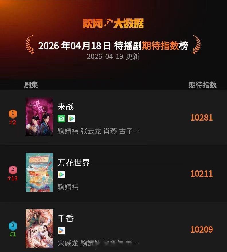 鞠婧祎包揽待播剧期待指数榜前三了呀!期待鞠婧祎三部新剧《千香》《来战》《万花世界》了呀!