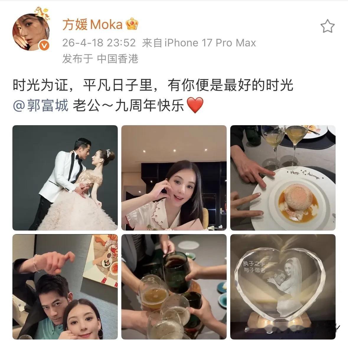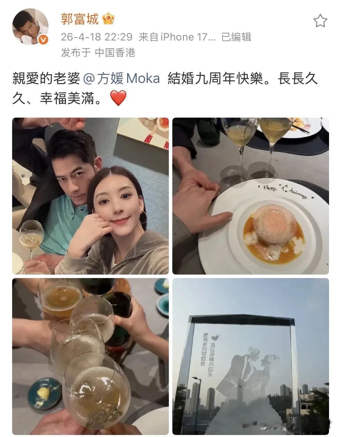 郭富城方媛,深夜同时发文! 4月18日深夜,郭富城在社交平台发文,随后,其妻子方媛也火速发文。双方不仅都艾特了彼此,还留下了对对方的评价和祝福,暴露了夫妻俩的感情现状和未来走向。 这场深夜的甜蜜官宣,藏着两人对婚姻最用心的仪式感。想必是提前做好了准备,郭富城率先更新动态,紧接着方媛便火速跟进,夫妻二人隔空联动,默契十足。 两条动态看似简单,却字字句句都饱含深情,不仅清晰透露了两人的婚姻状态,更藏着对彼此长久的爱意,以及对未来生活的满满期待,三个核心信息点,直接戳中了无数人对美好爱情的向往。 首先最让人惊喜的,便是两人已经携手走过九年婚姻。2017年,郭富城与方媛步入婚姻殿堂,转眼间,时光已经走过整整九个春秋,4月18日正是两人的九周年结婚纪念日。 在节奏飞快、聚少离多的娱乐圈,明星夫妻能坚守九年实属不易,更何况是郭富城这样叱咤娱乐圈数十年的天王级人物。 为了好好庆祝这个特殊的日子,夫妻俩纷纷放下手头忙碌的工作,特意挤出宝贵的独处时间,抛开工作的疲惫与外界的喧嚣,安安静静地团聚在一起,用心度过属于两个人的纪念日。 没有铺张浪费的盛大派对,没有高调奢华的豪华大餐,他们的庆祝方式简单又治愈,却处处透着藏不住的温馨。从两人晒出的合照中能清晰看到,画面里没有多余的背景,只有彼此相伴的温柔瞬间。 郭富城站在妻子方媛身后,一改往日舞台上霸气天王的模样,化身调皮的大男孩,单手在身后比出数字“9”的手势,眼神里满是宠溺与温柔。 方媛则依偎在旁,笑容甜美温婉,两人一同对着镜头比耶,同款姿势默契十足,情侣范儿直接拉满,不经意间就解锁了娱乐圈夫妻秀恩爱的全新模版,平淡又治愈,甜蜜不刻意。 而两人的感情现状,更是让人直呼羡慕。结婚九年,早已过了热恋期的轰轰烈烈,褪去了新婚的新鲜感,成为了旁人眼中的老夫老妻,可他们的感情却依旧甜蜜得如同热恋中的小情侣。 真正的爱情从不需要靠奢华的物质来证明,而是藏在一粥一饭的陪伴里,藏在举手投足的默契中。他们的九周年庆祝,没有繁杂的流程,只是简单的小聚,却有着独属于两人的温馨互动,每一个眼神、每一个小动作,都流露着对彼此的爱意与依赖。 方媛在文案中温柔写道:“时光为证,平凡日子里,有你便是最好的时光”,短短一句话,道尽了婚姻最美好的模样。在方媛心里,无需大富大贵,不必万众瞩目,只要身边有郭富城相伴,再平凡琐碎的日子,都能变得闪闪发光。 这便是爱情最本真的意义,不是轰轰烈烈的誓言,而是日复一日的用心陪伴,是把柴米油盐的平淡生活,过成充满暖意的幸福时光。 而郭富城则直白告白,简单一句祝福,藏着对妻子最深的疼爱,60岁的他,脸上没有岁月的沧桑,反而神采奕奕,状态年轻得像三十岁的人,这份由内而外的年轻与活力,正是被幸福滋养最好的证明。 除此之外,两人同步传递出的感情走向,更让大家看到了他们坚守婚姻的决心。郭富城在文案中明确写下对这段婚姻的期待,简单四个字“长长久久”,承载着对妻子、对家庭最真挚的期许。 而两人晒出的纪念摆件上,更是清晰镌刻着“执子之手,与子偕老”的浪漫誓言,这不是随口一说的情话,而是两人对彼此的承诺,是携手走完一生的坚定决心。 从合照里的细节,到文字里的深情,不难看出郭富城和方媛对这段婚姻的用心,他们的目标始终一致,从不是一时的激情,而是想要携手相伴、细水长流,走完往后余生的每一个春夏秋冬。 九年时光,他们从二人世界变成温馨的四口之家,一起经历风雨,一起陪伴彼此成长,一起守护着小家的幸福,用行动打破了外界所有的质疑与猜测。 两人的甜蜜动态发布后,迅速引发了全网网友的热议,大家纷纷送上祝福,点赞评论区满是羡慕与祝福的声音。有网友暖心留言:“时间是幸福最好的见证者”,短短一句话,道出了这段婚姻最动人的地方。 的确,婚姻从来不是一朝一夕的激情,而是无数个平凡日子里的坚守与陪伴,是把一件件平淡无奇的小事,慢慢编织成属于两个人的幸福回忆。 在娱乐圈这个充满诱惑与变数的圈子里,太多感情经不起时间的考验,而郭富城与方媛,却用九年的陪伴,诠释了爱情最美好的样子。 他们不刻意秀恩爱,不炒作婚姻,只是安安静静地过好自己的小日子,用最朴素的方式守护着彼此的感情。没有豪门的浮夸与张扬,只有普通人般的温暖与踏实,这样低调又真挚的爱情,才最让人动容。 九年时光,是陪伴,是坚守,更是爱的延续。从心动到白首,从热恋到相守,郭富城与方媛用行动证明,真正的幸福从不需要刻意张扬,藏在日常陪伴里,藏在彼此的眼神中。