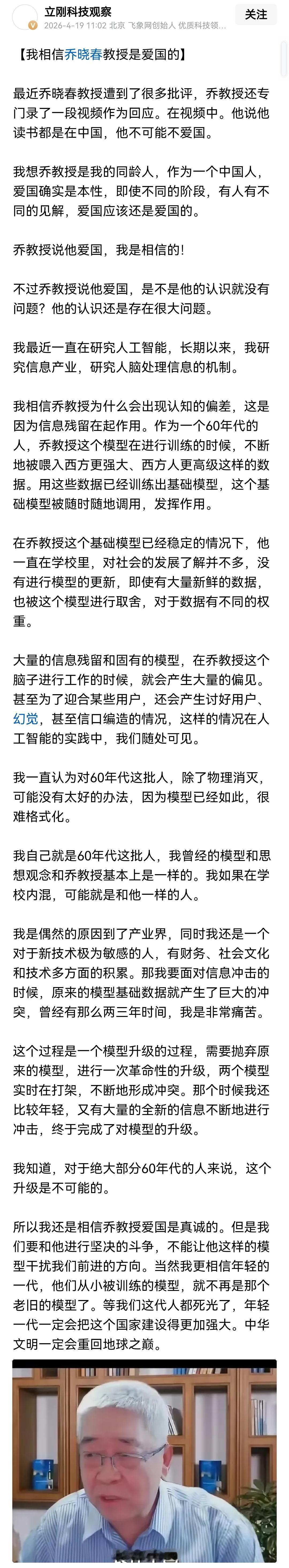 项立刚形容乔春生自认为没问题,其实也并不怪他,因为在他的认知里他就是没问题的,但以他的认知根本就理解不了当下社会,他也没有能力在如今这个时代去教一个合格的下一代,这不是他的问题,是他那个年代接触的信息把他投喂成这样的,他也想爱国,但他的方式让年轻人不能接受,他也想了解这个世界,但他的认知已经固化,再让他接受年轻人对世界的新看法是不可能的。 所以这代人物理毁灭后,这个世界就清净了,本来老一代人已经落伍了,还不愿意主动退出历史舞台,非要凑在舞台中间给现在的年轻人指点江山,教现在年轻人怎么做,但没有他们的指点江山,这个社会会更健康的发展,这点他们是感受不到的,还自己觉得他们自己很重要。