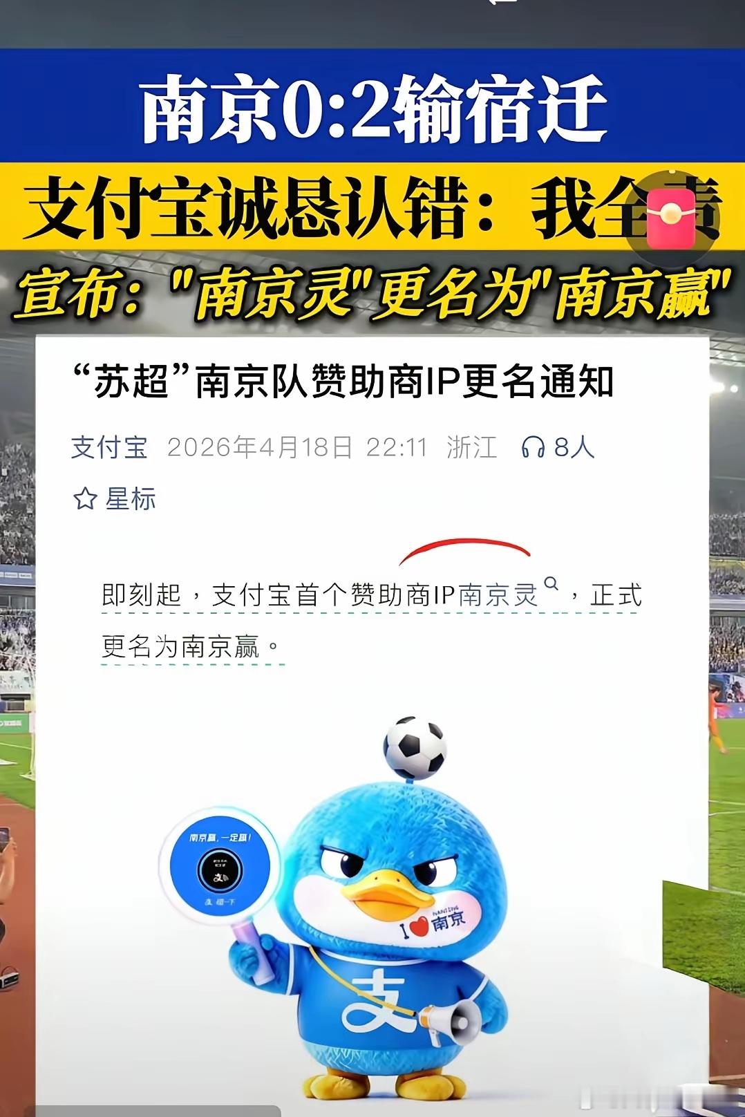 昨天南京队0:2输给宿迁队,有网友指责都赖支付宝,赞助商IP名干嘛叫‘南京灵’,这回南京真0了。支付宝求生欲直接拉满,赶紧认错:我全责。并把赞助商IP名改成‘南京赢’。