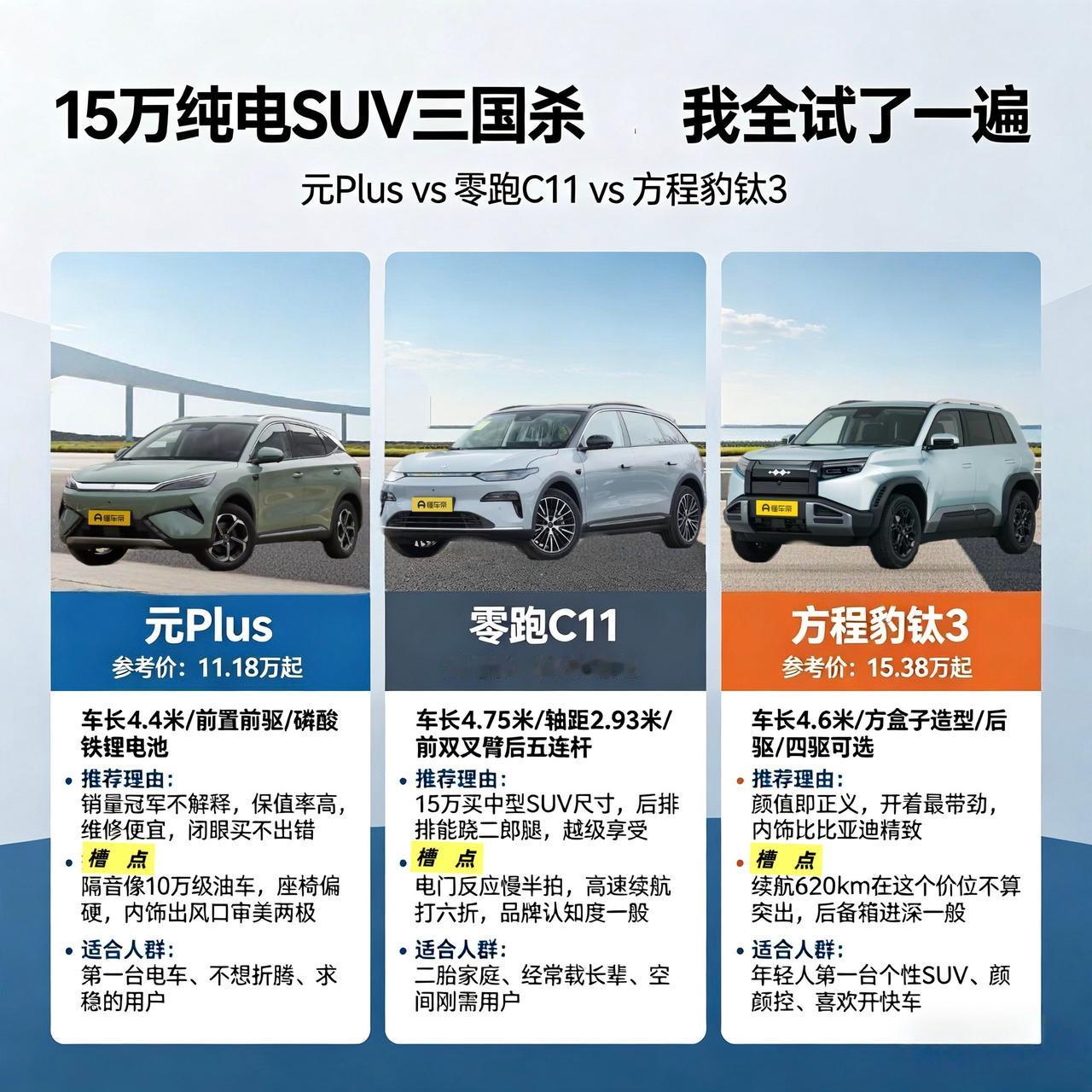 15万买纯电SUV看花眼?元Plus、零跑C11、钛3我全试了一遍,跟你说实话 最近朋友想买台纯电SUV,预算15-18万,让我帮着参谋。我说这个价位选择可太多了,最后锁定了三台:比亚迪元Plus、零跑C11、还有刚出没多久的方程豹钛3。 花了一个周末,三家店跑下来,说说真实感受。 第一站:比亚迪元Plus 这台车算是这个价位的“老面孔”了,街上跑得挺多。进店销售也挺实在,直接说“这车没啥花里胡哨的,就是稳”。 静态体验: 坐进去第一感觉——熟悉。内饰那个哑铃片式的空调出风口,喜欢的人觉得有设计感,我朋友看了一眼说“有点奇怪”。中控屏能旋转,这个倒是比亚迪的特色,用导航的时候竖起来挺方便。 后排空间够用,我175坐进去膝盖有一拳多,头部不顶头。但座椅偏硬,坐垫也短了一点点,大腿支撑不太够。朋友说:“长途坐后排会不会累啊?”我心里也觉得有点悬。 动态试驾: 开起来就是比亚迪那个味儿,电门响应平顺,不会一窜一窜的,对新手友好。底盘过减速带“咚咚”两声,干脆利落,不晃。 槽点来了: 隔音真的一般。速度上到80,胎噪就呼呼往耳朵里灌。销售说是配的轮胎偏硬,耐磨但吵。另外车机反应偶尔会卡一下,不是特别跟手。 朋友评价: “开着挺顺的,就是内饰那个出风口我有点接受不了。” 我的看法: 如果你求稳、不想折腾、图个省心,元Plus不会出大错。但别指望有什么惊喜,它就是那个“老实人”。 第二站:零跑C11 进店看到C11,第一反应是“这车真大”。旁边停了辆C10,C11明显长一截,气场就不一样。 静态体验: 坐进后排,我直接惊了——膝盖离前排靠背有三拳,翘个二郎腿轻轻松松。朋友说:“这空间跟我们家那台老CRV不是一个级别。”后备箱也大,放婴儿车、露营装备都没问题。 内饰三块屏幕,看着挺唬人。但仔细摸,有些地方塑料感还是有的,门板下半部分是硬塑料。座椅倒是很软,坐上去有陷进去的感觉,舒服。 动态试驾: 开起来第一感觉——安静。双层夹胶玻璃确实有用,80以下基本听不到啥风噪。底盘是前双叉臂后五连杆,这个配置在这个价位少见,过颠簸路的时候车身很稳,没有多余的晃动。 槽点: 电门调校偏慵懒,踩下去动力来得慢半拍,想超车得提前踩。朋友说:“感觉不像电车,像开个自吸油车。”另外续航达成率一般,销售说市区能跑八折,高速也就六折多。 朋友评价: “空间太香了,坐着也舒服,就是开起来有点肉。” 我的看法: 如果你家有大高个、或者经常带爸妈孩子出门,C11的空间是同价位最能打的。但对驾驶感有要求的,可能会觉得它“没灵魂”。 第三站:方程豹钛3 这台车是这三款里最新出的,店里人也不少。外观方方正正,有点硬派越野那味儿,但不是那种特别夸张的,城市里开也不违和。 静态体验: 坐进去,内饰比我想象的精致。中控台是那种硬朗的设计,但摸上去手感不错,缝线也挺工整。座椅偏硬,支撑性好,但柔软度不如C11。 后排空间中规中矩,我坐进去膝盖一拳半,比元Plus大一点,比C11小不少。头部空间倒是不错,因为车顶平直,不压抑。 动态试驾: 开起来是这三台里最有“劲”的。电门响应快,踩多少给多少,红绿灯起步能把另外两台甩在后面。底盘偏硬,路感清晰,过减速带“砰砰”两声,屁股能感觉到,但不颠得难受。 槽点: 续航是短板。全系只有510km一个版本,实际跑下来可能也就400出头。同价位元Plus有510km,C11有580km,钛3的续航确实不够看。朋友说:“这要是跑个长途,充电次数比别人多。” 另外后备箱空间一般,方正的造型看着大,但因为下面有电机,实际进深不算深,放个大箱子得侧着塞。 朋友评价: “开着最爽,长得也帅,就是续航有点虚。” 我的看法: 如果你是个性派,想要一台开着有乐趣、长得不随大流的车,钛3值得考虑。但如果你经常跑长途,或者家里没充电桩,续航可能会让你焦虑。 --- 最后总结 三台车三种性格: 👉元Plus 求稳派、不想折腾 老实人,不惊艳但不出错 👉零跑C11 家用党、空间控 后排能跷二郎腿,舒服但肉 👉方程豹钛3 个性派、驾驶控 开着爽、长得帅、续航短 朋友最后纠结元Plus和钛3,我说你回去想想:你是更在意省心,还是更在意开着爽? 这个答案只有你自己知道。 最后还是那句老话: 别看参数了,花半天去试驾,烂路走一走、后排坐一坐,比看一百篇测评都有用。【来自懂车帝车友圈】