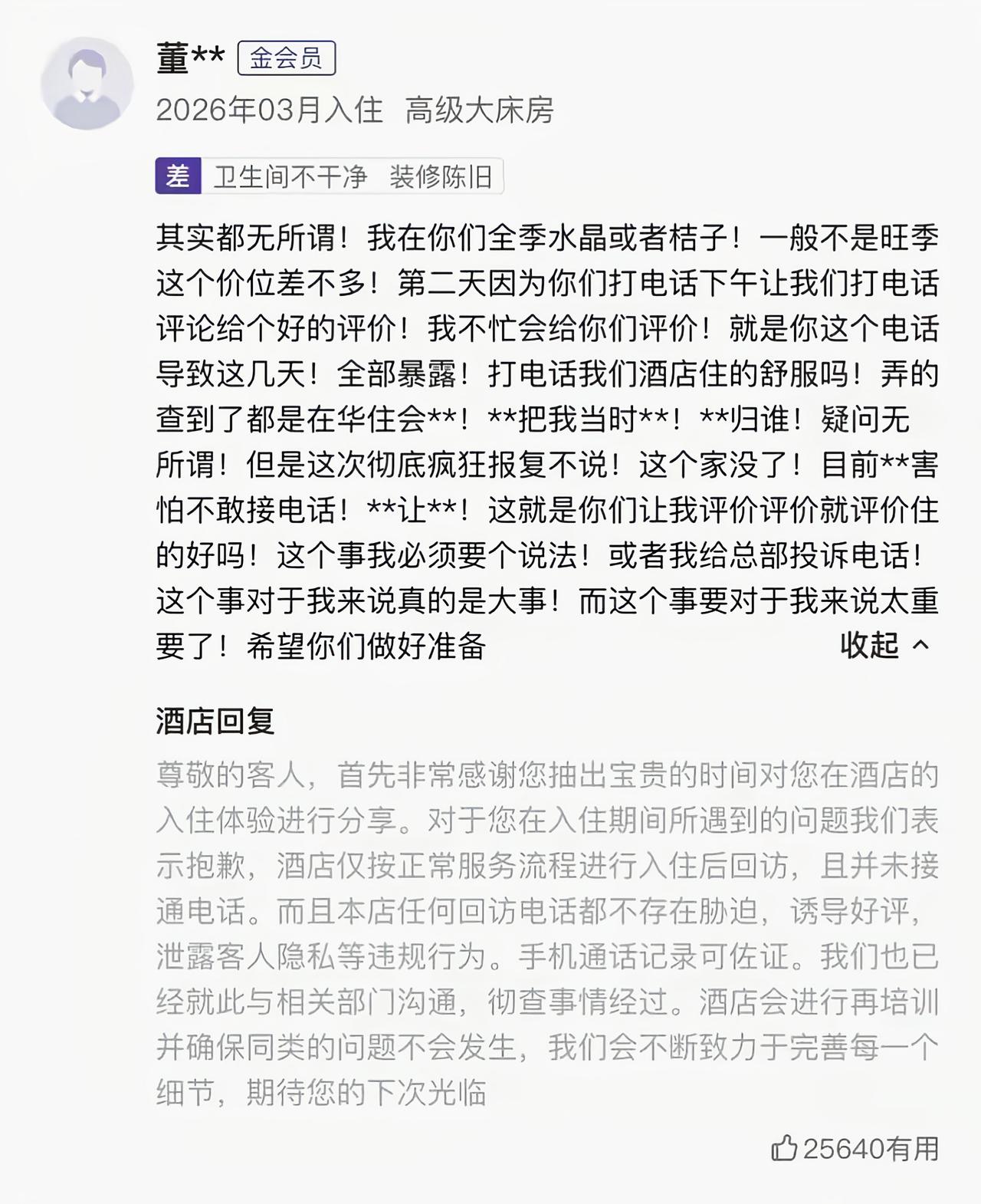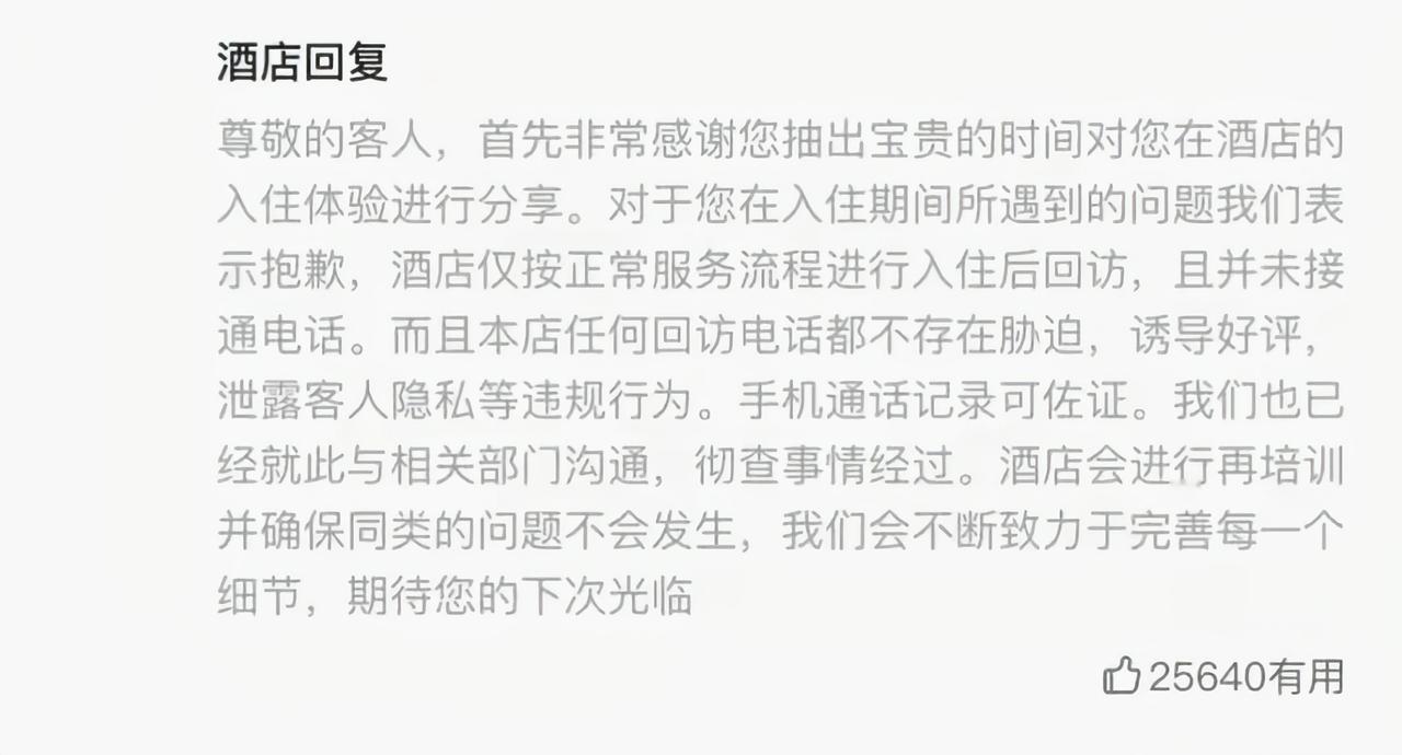 “这个事我必须要个说法!”山西大同,董姓女子差评酒店内容被曝光,差评原因更奇葩,并要投诉到酒店总部,扬言让酒店做好准备。 近日,山西大同那位董姓女子的事,大家都看过了吧? 瞒着丈夫,和情人到酒店开房间,结果因为酒店的一个电话回访,让丈夫察觉出不对,弄得丈夫提出离婚,孩子也不给她抚养,就连情人也不接她电话了!现在的她,自我感觉“家没了”、“天塌了”。 于是,她给了酒店一个大大的“差评”后,又写了一段关于“差评”原因的小作文。 在这段小作文中,她没有反思自己的行为,反而把“锅”甩给了酒店。表示由于第二天酒店打电话让她给个“好评”,导致自己那几天的事情全部暴露了,让丈夫查到了她那几天所做的“好事”,并且声称事情让丈夫知道后,不但向她提出了离婚,孩子也不让她抚养,就连那个和她开房的人也不敢接电话了! 小作文的结尾,她表示“这个事我必须要个说法”,称这个事对她来说真的是大事,对她太重要了,并声称让酒店“做好准备”。 对于董姓女子的“差评”,酒店也做出了回复。先是对女子所遇到的问题表示抱歉,接着表示酒店的回访属于正常服务流程,并且当时也没打通女子的电话,在回访中也不存在胁迫、引导“好评”、泄露客人隐私等行为。 当然,也有人觉得酒店方,在这件事上也有一定的过错,不应该在董姓女子离开后再进行电话回访,导致她的隐私被泄露,秘密被丈夫知道。 然而,这件事的重点在酒店的回访吗?是因为酒店的回访,导致女子开房的秘密被丈夫知道吗? 当然并不是!重点是她做出了对不起家庭,对不起婚姻,对不起丈夫的事后,还不承认自己的错误,去甩锅给酒店的回访。 以她的感觉和思维,如果酒店不回访,如果丈夫不知情,如果事情没曝光,她还可以在外面继续和情人去开房,她还可以回到家后继续做一好妻子、好母亲,一切仿佛都是酒店回访的错。 要想人不知,除非己莫为!这次你可以甩锅给酒店,并且必须让酒店给你一个说法,下次你会怪在谁头上?不去检讨自己的行为,反而责怪别人的正常回访,真是三观尽毁的奇葩想法。 事情走到这一步,以后她是不是就可以“光明正大”的和情人在一起,不用隐瞒的去开房了? 就怕那个连电话都不敢接的情人,早已对她避而远之了吧! 作品声明:信息来源“大河报”2026-4-19 16:00发布