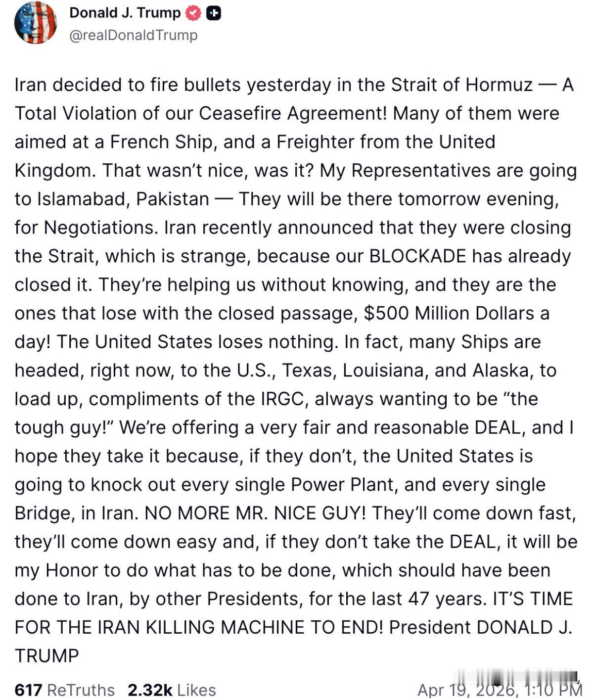 特朗普最后通牒:美代表团明晚抵巴,伊朗不签协议就炸光电厂+桥梁!伊朗会妥协吗? 4月19晚间快讯, 大家好,这里是专注国际局势动态的 【煋星论长风】,美伊的谈判到了现在一波三折,现在老特放出了最后的谈判通牒!伊朗会妥协吗?以下是特朗普最新的表态! 据特朗普发文表示, 伊朗昨天在霍尔木兹海峡开火——完全违反了我们的停火协议! 许多子弹射向一艘法国船只和一艘英国货轮。 我的代表将前往巴基斯坦伊斯兰堡——他们将于明天晚上抵达那里进行谈判。 伊朗宣布关闭海峡,但我们的封锁已经将其封锁。 他们每天损失5亿美元,而美国毫发无损。 我们提供了一个公平的协议——如果他们不接受,美国将摧毁伊朗的所有发电厂和桥梁。 不再做老好人!是时候结束伊朗的杀戮机器了! 综合观察来看【煋星观察】,老特再次拿出了自己的拿手好戏,采用极限施压的手段。然而特朗普的这一套手段,现在的伊朗可以说已经是轻车熟路了。现在老特表现出强势的态度,无非是想以胜利者的姿态体面的退出这场战争。这次谈判美国会让步呢?还是伊朗妥协呢?大概率可能美国会答应伊朗的条件,同时老特也会提一个让美国有面子的要求。 关注 【煋星论长风】,每日为你穿透烟幕,看清每一步棋局!