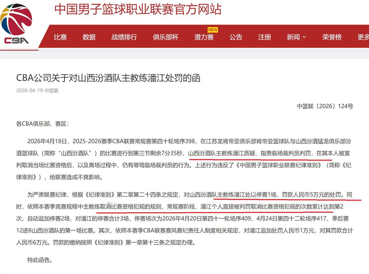 潘江措手不及! 谁能料到,CBA常规赛收官关键阶段,山西队主帅潘江竟自乱阵脚,给自己和球队惹来了大麻烦!CBA官方一纸罚单猝然落地,潘江因辱骂裁判员,被合计停赛3场、罚款6万元,这波操作不仅让他本人措手不及,更给山西队的季后赛征程蒙上了一层挥之不去的阴霾,简直是得不偿失、悔不当初。 事情的来龙去脉其实很简单,在CBA常规赛第四十轮山西对阵江苏的比赛中,潘江因不满临场裁判员的判罚,当场质疑、指责裁判,情绪失控之下被驱逐出场。可他非但没有收敛,反而在离场过程中变本加厉,公然辱骂裁判员,这般目无规矩、我行我素的行为,无疑是顶风作案,也彻底触怒了CBA官方。 据悉,这张罚单并非凭空而来,而是多重处罚叠加的结果,潘江本赛季已是第二次被判取消比赛资格犯规,自动追加停赛,再加上辱骂裁判的违规行为和赛风赛纪责任人的连带责任,最终落得停赛3场、罚款6万的下场,可谓咎由自取。要知道,这3场停赛里,还包含了季后赛12进8的首场关键战,对本就岌岌可危的山西队来说,无疑是雪上加霜。 如今的山西队,战绩起伏不定,正处在季后赛边缘苦苦挣扎,潘江作为球队的战术核心和临场指挥官,他的缺席无疑是釜底抽薪。没有主帅坐镇,球队的战术部署、临场调整、情绪调动都将大打折扣,助理教练临时接手,能否稳住军心、力挽狂澜,还是个未知数。 潘江此番冲动之举,真是因小失大、追悔莫及,不仅自己身败名裂,还拖累了整个球队。CBA近年来一直严抓赛风赛纪,零容忍违规行为,潘江显然是明知故犯、执迷不悟。希望他能痛定思痛、引以为戒,也希望山西队能临危不乱,尽快调整状态,别让一场不该有的风波,毁掉整个赛季的努力。