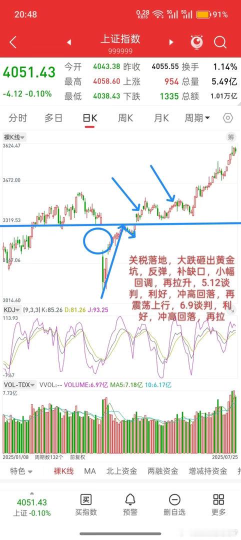 去年4.7关税战,大盘砸出黄金坑,然后直接V上来,先补掉缺口3319,当时反弹最高点3313,差几个点,然后小幅回落,再拉起来,一直到5.12号中美谈判,降税,行情冲高两天,开始回落,再震荡上行,然后6.9号谈判,延期,行情冲高回落,再震荡上行。(这就是前几天一直说的,市场都是买预期,卖事实,利好落地,冲高回落)