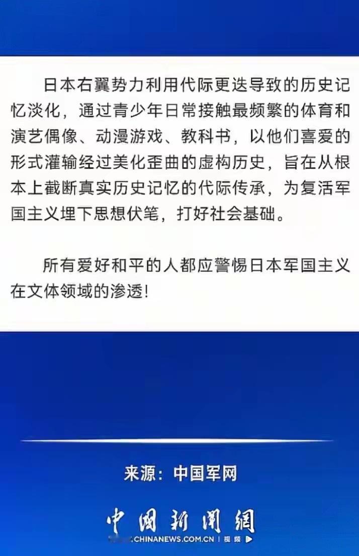 中国军号正式发声:高度警惕日本军国主义在文化、体育领域的渗透。这一声明,标志着国家终于把话挑明,那些长期揣着明白装糊涂、立场歪到境外的人,这下该真正心慌发抖了。 近些年来,许多不正常现象早已引起全民警觉。 教材问题频频曝光:本该弘扬家国情怀的内容被悄悄删减,英雄人物形象遭到恶意丑化,课本插画怪异刺眼,内容导向令人极度不适。社会上,为国争光的运动健儿遭无端网暴,部分媒体发表背离优良传统的错误言论,法学等人文领域“白左化”倾向日益明显。不少孩子已经不知道雷锋是谁、不懂家国历史,课本里充斥着大量外国名人,这一切绝非偶然,更不是简单的“审美偏差”。 法学界人士陈枫曾一针见血地指出:西方国家一边疯狂制裁我们的工科强校,比如哈工大、西北工业大学等,生怕中国科技实力赶超;一边却对我们部分高校的人文社科类专业格外“慷慨”,法律、传媒等领域源源不断获得境外研究资金。之所以不便点名,不过是怕被污蔑制造对立,但背后用意路人皆知:他们怕中国科技太强,更怕中国人思想清醒、立场坚定。 科技上卡脖子,思想上搞渗透,这就是西方势力长期运作的双重套路。 而日本军国主义残余势力,也借着文化、体育、娱乐等软性渠道,悄悄进行历史美化与价值观输出,试图模糊历史罪责、消解民族记忆,为其军国主义招魂铺路。很多人看似只是哈日、追日流、追捧日式审美,实则在不知不觉中被潜移默化地洗脑,对历史伤痛变得麻木不仁。 更让人警惕的是,国内一批“屁股坐歪”的人,吃着中国的饭,却受着境外的影响,拿着相关资助,不断在舆论场带节奏、扭曲历史、贬低本土价值,甚至为侵略历史洗白。他们自以为隐蔽,以为可以长期浑水摸鱼,在文化阵地兴风作浪。 如今中国军号公开点名警示,意味着国家早已看清全盘,正在系统性收网、逐步清算。 不少人应该已经察觉到:此前在法学圈、舆论圈蹦跶得异常嚣张的几个人,最近突然销声匿迹;那些长期发表奇葩言论、跪舔西方的公知,也变得噤若寒蝉。不是他们突然收敛,而是心里有鬼、屁股有屎,深知清算将至,不敢再露头。 所谓“与国际接轨”,不过是某些“精神殖人”的遮羞布。 军号一响,就是明确信号:文化阵地不容失守,历史真相不容歪曲,军国主义渗透绝不允许。国家不会再放任错误思想侵蚀下一代,不会再让英雄被抹黑、历史被虚无、价值观被扭曲。 从教材整改到舆论清理,从高校风气整治到隐性渗透排查,一场自上而下、全民参与的思想净化已经拉开大幕。 那些立场歪、心思邪、长期搞渗透与美化的人,终将无处遁形。 历史不容背叛,家国不容抹黑,正义的清算,才刚刚开始。