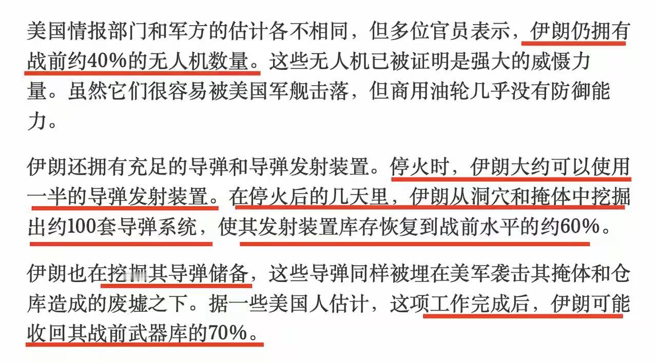美以联军喊着已摧毁伊朗大部分武器库,现实却狠狠反转:伊朗武器越打越多,简直像在沙漠里直接“种”出导弹。《纽约时报》最新披露的数据,更是直接戳破这场战争最大的谎言。 报道显示,伊朗目前仍保有战前约40%的无人机库存。停火期间,伊朗并未放松战备,而是全力挖掘地下掩体,抢救被掩埋的导弹发射器与弹药。如今发射器数量已恢复至战前60%,导弹武库更有望回升到战前70%。这番地下“回血”能力,让美以连日空袭成果大打折扣。 不少人直呼神奇,伊朗仿佛掌握了“种植回收”黑科技,从沙漠地下不断掏出导弹与无人机。这背后是伊朗深耕多年的地下军工体系,提前将大量装备深埋掩体,即便遭遇打击,也能快速抢修回收,实现战力快速回血。 《纽约时报》同时点明,伊朗无人机已成强悍威慑力量。虽然面对美军军舰容易被拦截,但对缺乏防御的商用油轮堪称致命威胁。按照这个逻辑,美军福特号、布什号、林肯号三艘航母,加上的黎波里号两栖攻击舰,岂不都成了毫无还手之力的“商船”?这番讽刺堪称辛辣。 美此前大肆宣扬重创伊朗军工,如今数据却赤裸裸打脸。伊朗凭借地下掩体与快速抢修能力,在停火窗口期持续恢复战力,弹药与发射器不断回流。所谓“摧毁大部分武器”,更像是一场自欺欺人的宣传。 这场较量早已说明,伊朗的军工韧性远超预期。地下藏兵、边打边补的模式,让其在高强度打击下依然保有反击底气。美以看似声势浩大,却没能真正打垮伊朗的战争潜力。 从无人机威慑到导弹快速恢复,伊朗用实力证明:在自家地盘上,即便面对强敌,也能保持持续反击能力。那些宣称伊朗武器耗尽的言论,在冰冷的数据面前,早已站不住脚。