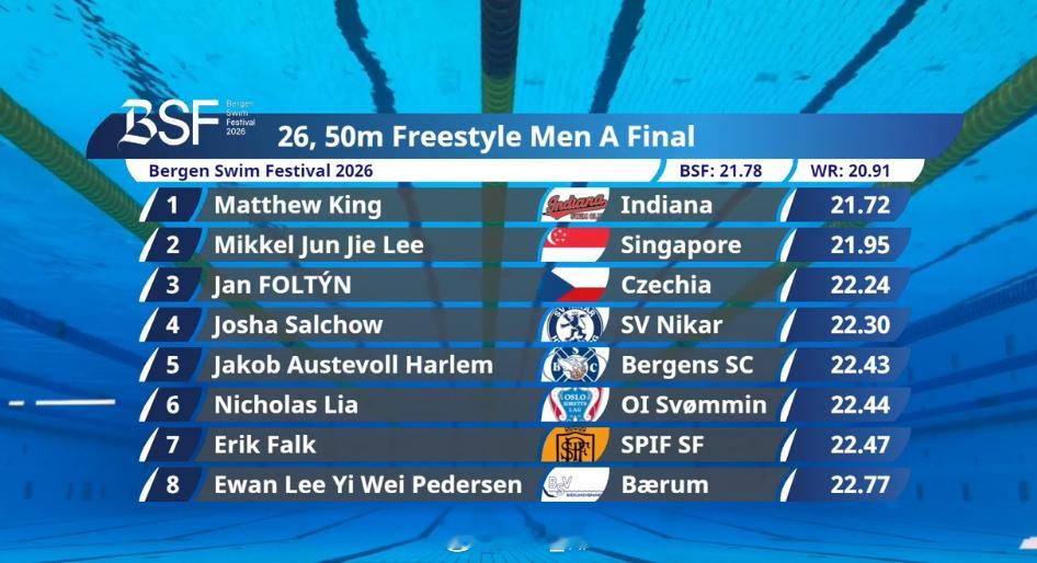 俄罗斯游泳杯总决赛 男50自决赛🇺🇸Matt King 21.72🇸🇬李君杰 21.95
