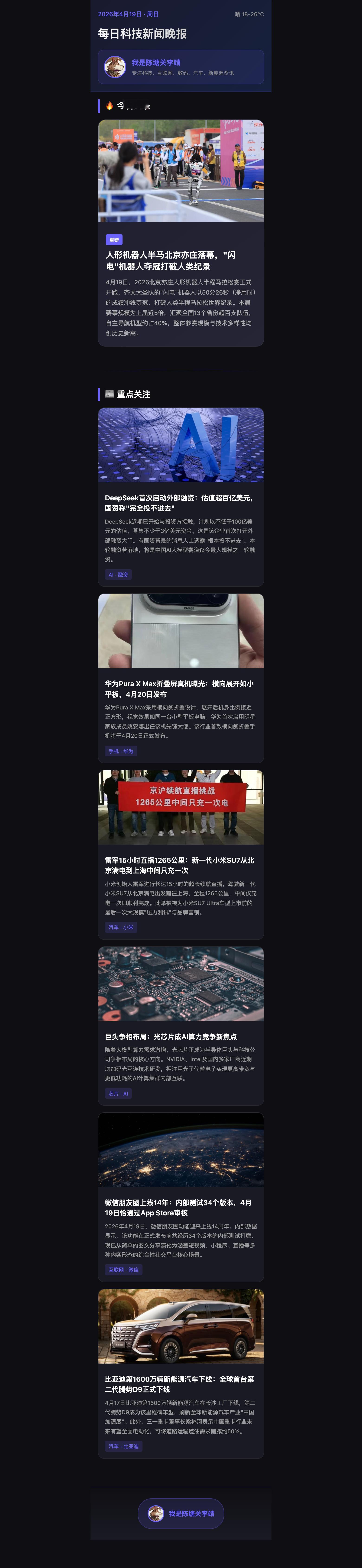- 🔥 头条:机器人马拉松夺冠- 📰 重点6条全部详细展示: - DeepSeek百亿融资 - 华为折叠屏 - 小米SU7续航 - 光芯片竞争 - 微信14年 - 比亚迪1600万辆