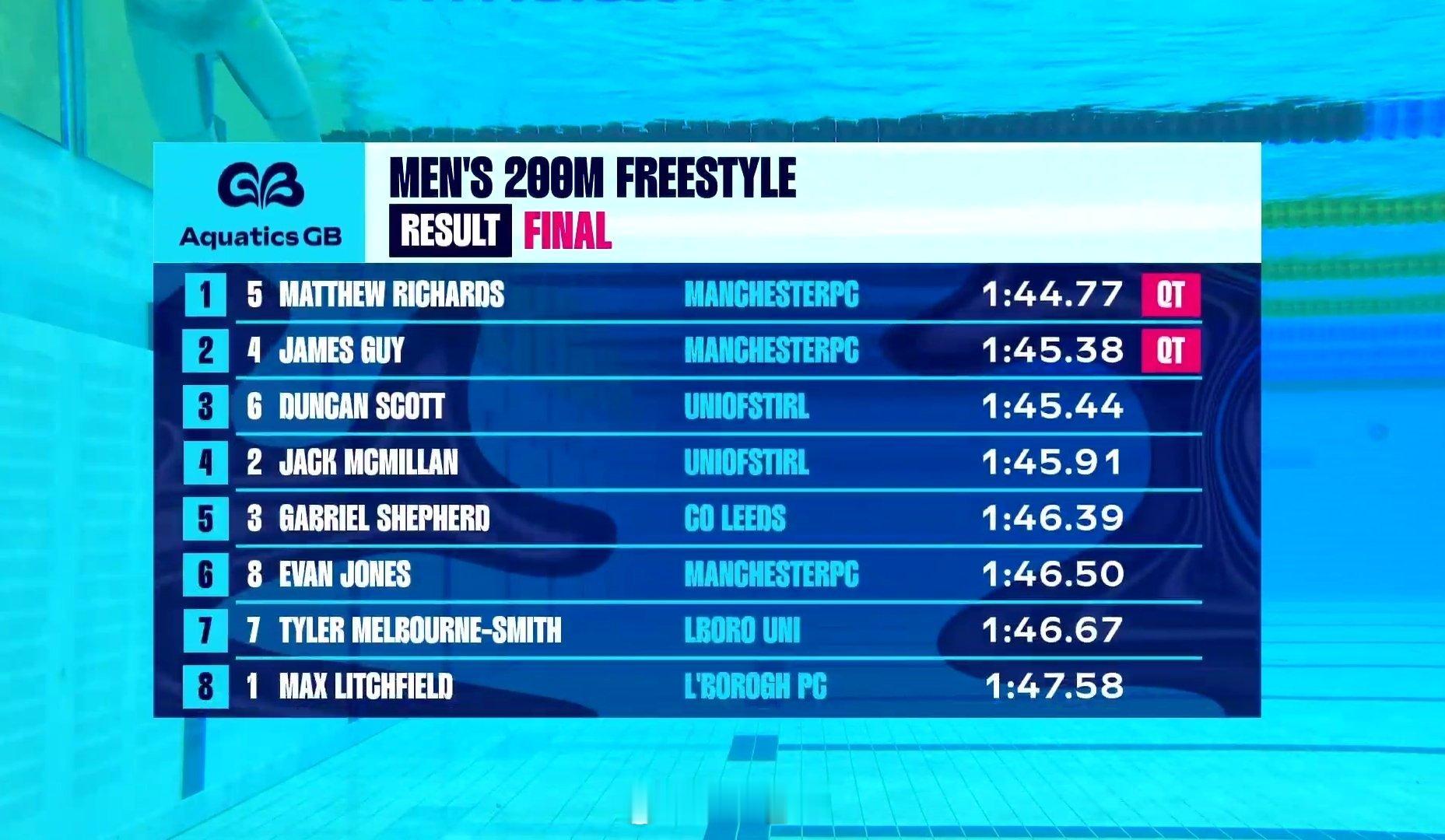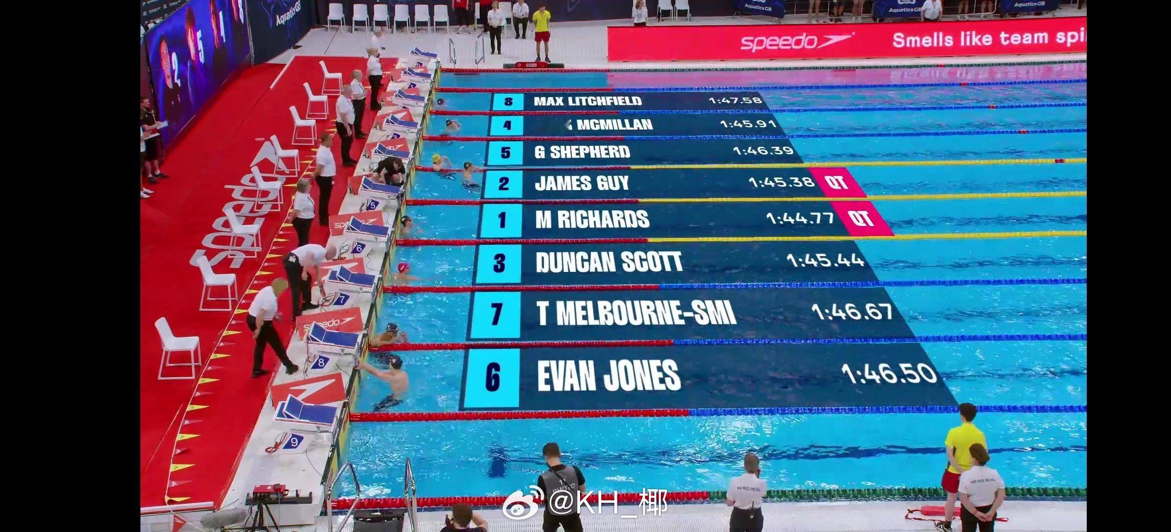 英国游泳锦标赛 男200自决赛威村弟 1:44.77舞娘 1:45.38邓姐 1:45.44McMillan 1:45.91