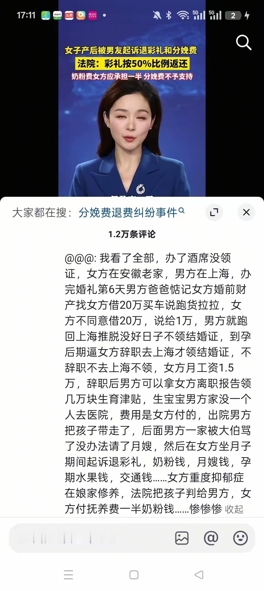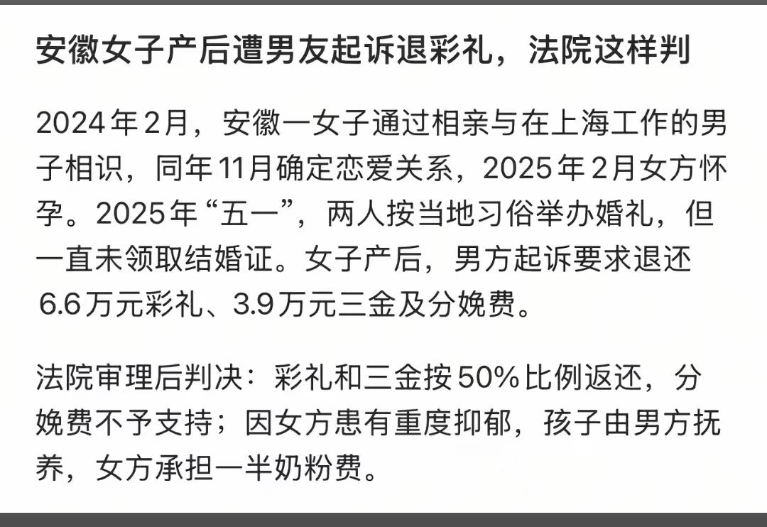 婚礼后第六天就出幺蛾子,居然还不把孩子打掉。这是有预谋的骗孕骗子案,交换了聘礼嫁妆,是民间约定俗成的婚约,男方单方面毁约造成的一切伤害都要赔偿。 我觉得男方态度太奇怪了,哪有月子期间就起诉女方的?不理解这么点彩礼还判退还一半,一年共同生活10万够吗? 法官是依据什么把孩子判给男方的,没有结婚证孩子不应该是女方的吗,男方应付抚养费呀。 孩子没生前,孕期的一切费用法官也说是女的个人消费。郁抑症是男的气的,这个也得告。 这男的白嫖还能几万得一个儿子,代孕最少要80万吧,简直像完美诈骗生孩子的。 遇到这样的法官,不是变相让骗代孕合法化吗?五万块钱代孕一个孩子,还可以陪睡一年。