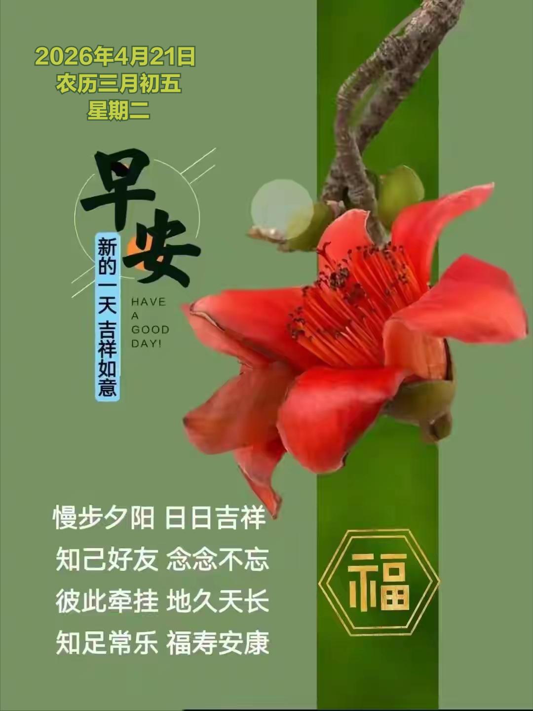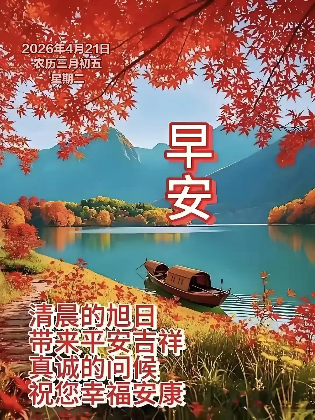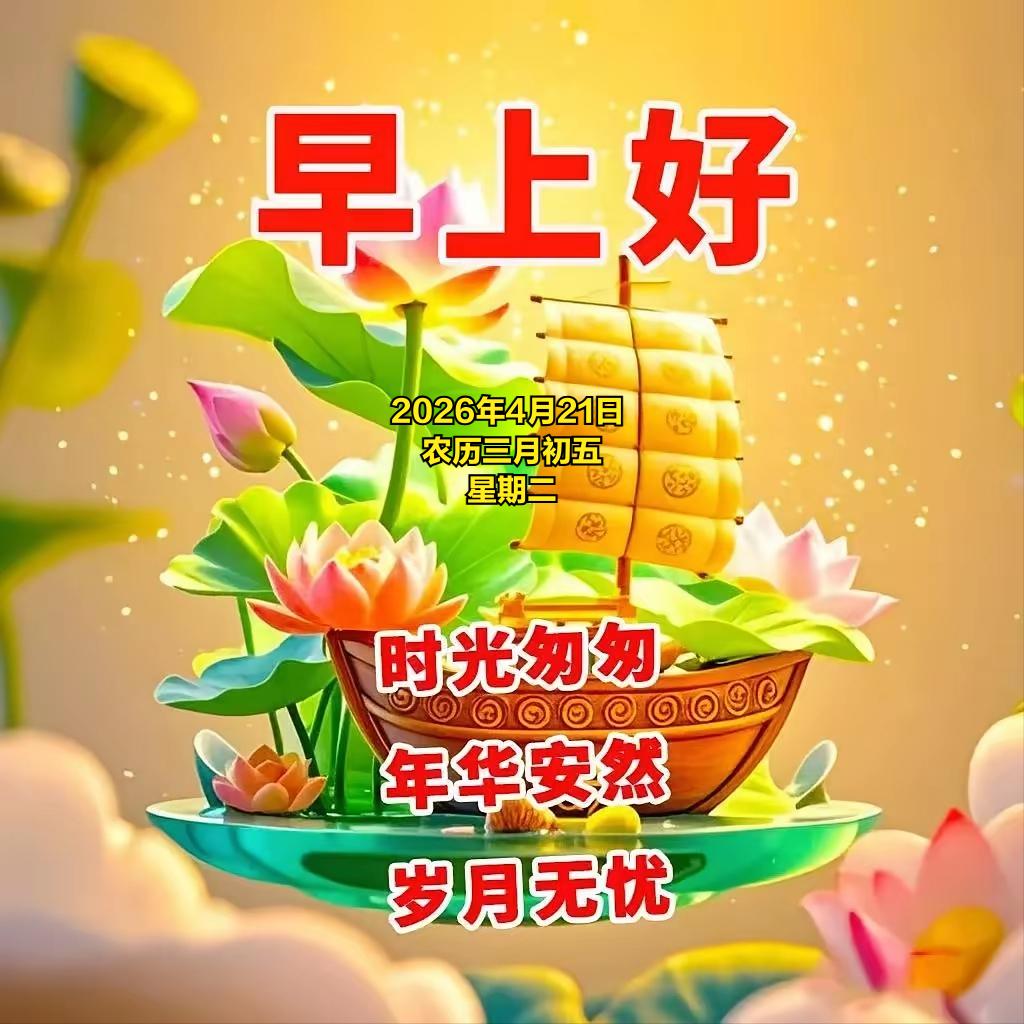 2026年4月21日 农历三月初五 星期二 4 月21日,农历三月初五,暮春渐深、万物丰盈。民间在三月初五素有踏青祈福、护苗祈丰、焚香祈安的习俗,不少地方会祭拜土地神灵,祈求风调雨顺、田禾茂盛;也有采春草、煮春茶、净宅除尘的传统,寓意扫除晦气、纳福迎祥,为一整月的顺遂打下好根基。 值此良辰,送上满满祝福,愿你身体康健、平安常伴,家人和睦无忧、笑语盈门。 愿心中所愿皆能稳步实现,事业顺风顺水、付出皆有收获;希望前路光明坦荡,烦恼随风消散,日子步步向好,所行皆坦途,所念皆如愿。 望点击“关注”,得闲在评论区互道一声“早安”。