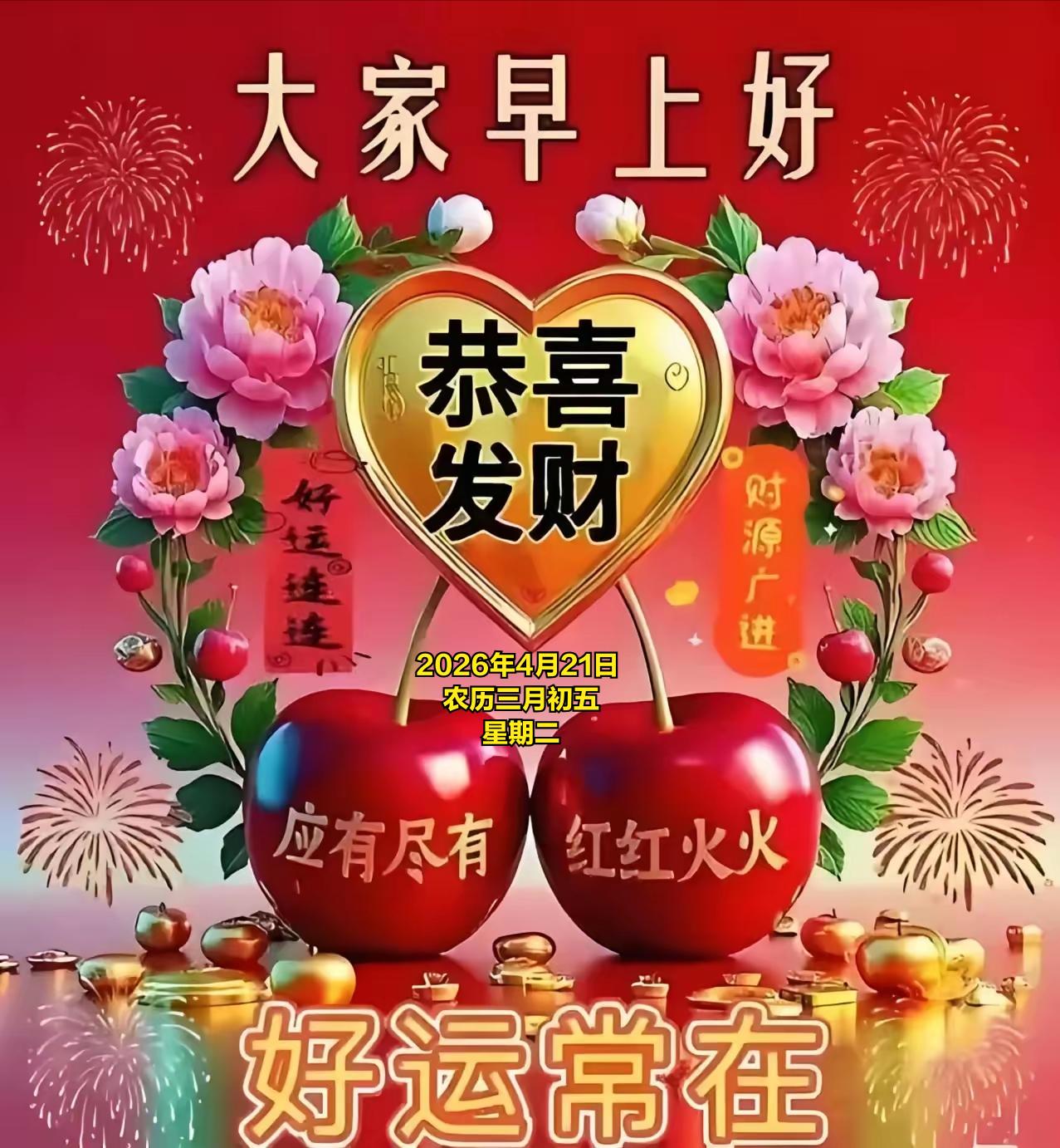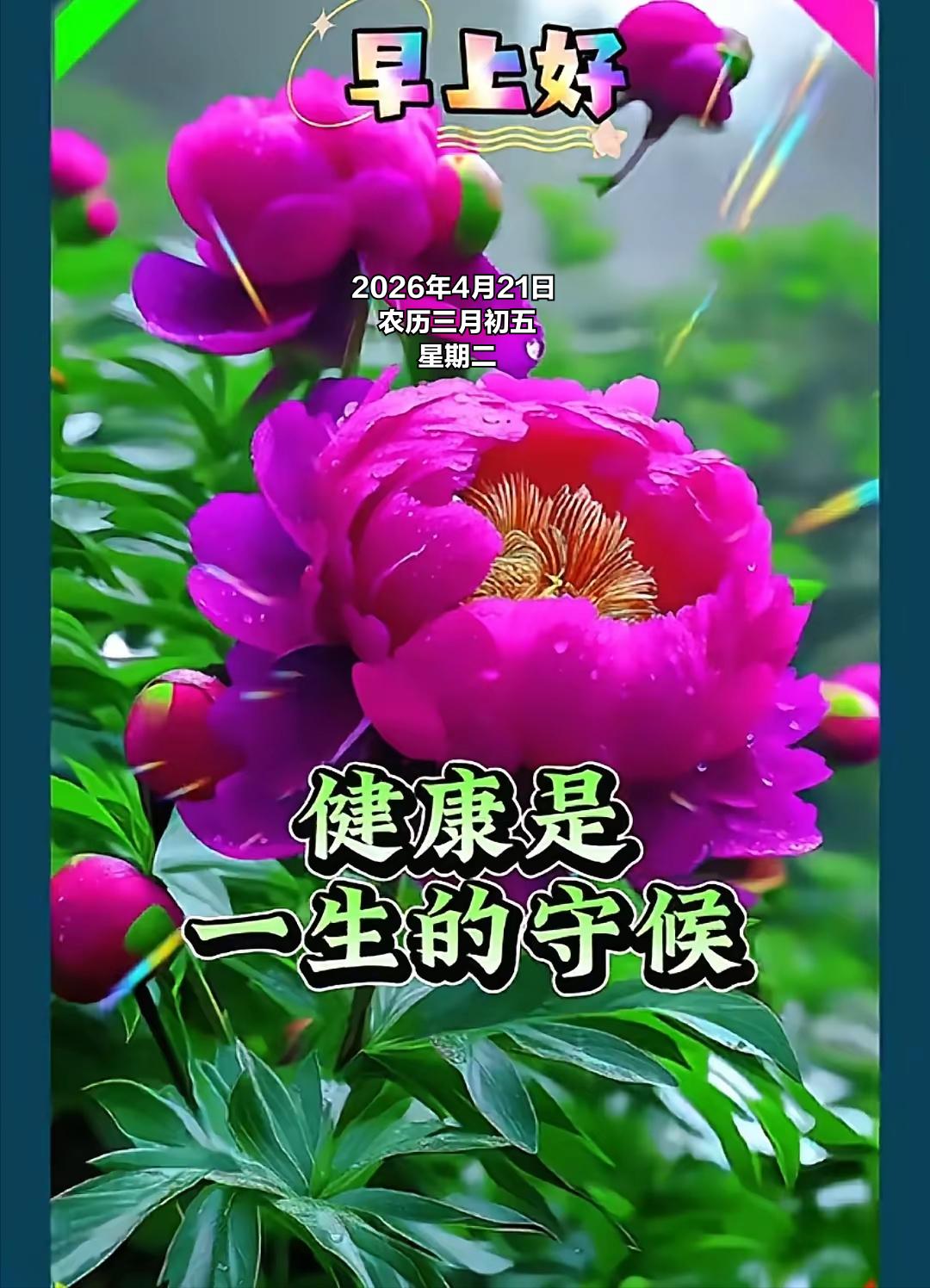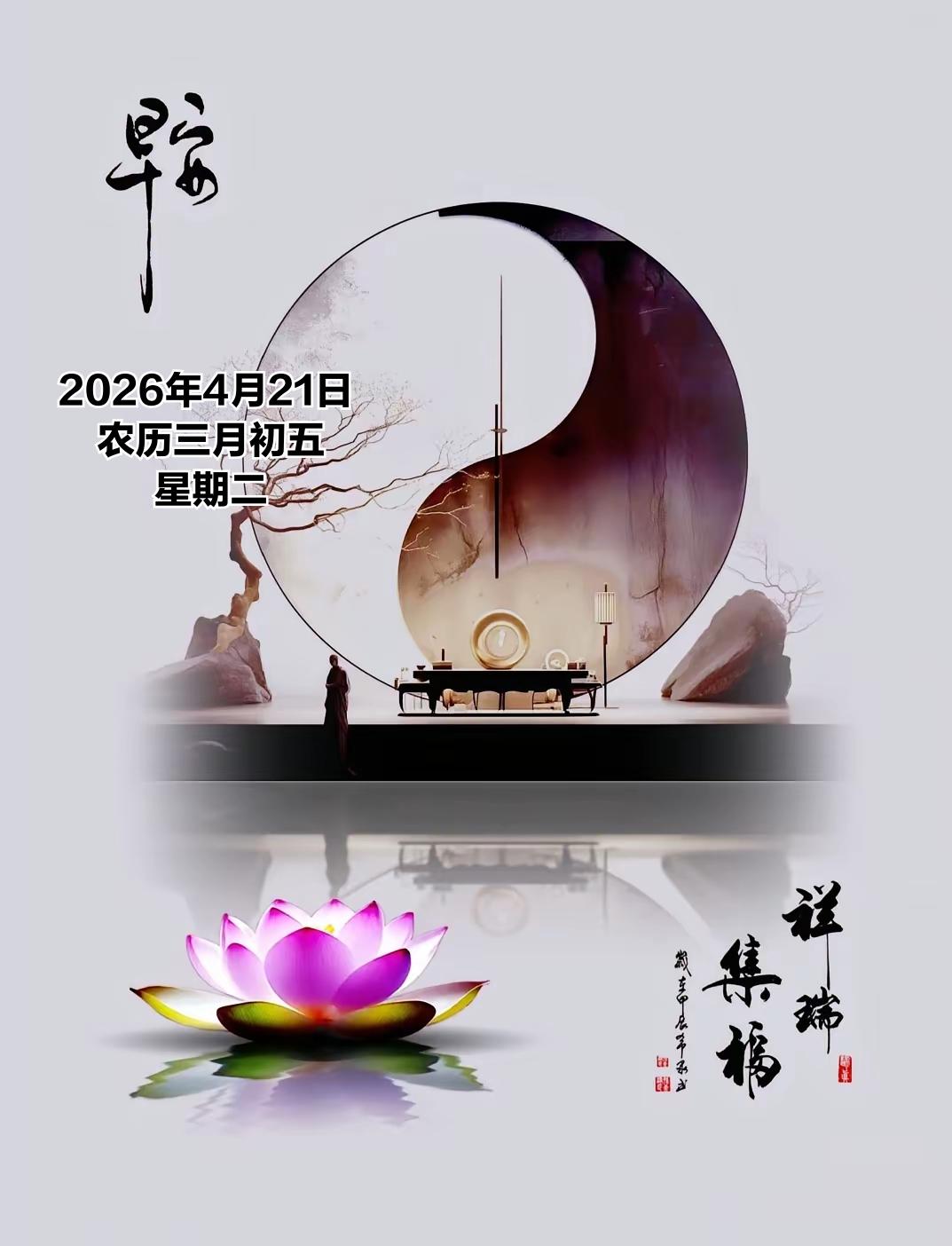 2026年4月21日 农历三月初五 星期二 4 月21日,农历三月初五,暮春渐深、万物丰盈。民间在三月初五素有踏青祈福、护苗祈丰、焚香祈安的习俗,不少地方会祭拜土地神灵,祈求风调雨顺、田禾茂盛;也有采春草、煮春茶、净宅除尘的传统,寓意扫除晦气、纳福迎祥,为一整月的顺遂打下好根基。 值此良辰,送上满满祝福,愿你身体康健、平安常伴,家人和睦无忧、笑语盈门。 愿心中所愿皆能稳步实现,事业顺风顺水、付出皆有收获;希望前路光明坦荡,烦恼随风消散,日子步步向好,所行皆坦途,所念皆如愿。 望点击“关注”,得闲在评论区互道一声“早安”。