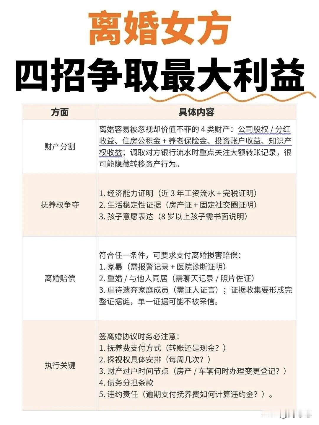 离婚女方四招争取最大利益。[祈祷]离婚对女人来说,不光是感情上伤筋动骨,经济上也得扒层皮。想争取最大利益,别光顾着伤心,下面这几条得牢牢抓住。↓ 第一,财产分割,关键是摸清家底。很多女人离婚时觉得“钱都在他手里,我没办法”。你错了,法律规定,工资,奖金,劳务报酬,还有结婚后买的房子,车子,理财,股票等等,甚至你俩开的公司股权,都属于夫妻共同财产。 你要做的第一件事,就是收集线索。别觉得难为情,这是法律给你的权利。 另外,也别忘了家务补偿。如果你在家里带孩子,照顾老人好多年,离婚时可以主张一笔补偿费,别不好意思开口。 第二,争抚养权,讲的不是爱,是证据。法院判孩子跟谁,最核心的原则是:对孩子成长有利。 日常照顾的证据最重要,别怕自己赚的少,法官看的是你能不能给孩子基本生活保障。如果孩子8岁以上,法官会征求孩子意见。 第三,离婚赔偿,千万别白白便宜了他。法律规定,对方如果有重婚,与他人同居,家暴,虐待等行为,你有权要求损害赔偿。 但这些需要实打实的证据。报警记录,伤情鉴定,聊天记录,转账记录等等。 第四,执行是关键,别赢了官司输了钱。最担心的是判决下来了,对方把财产转移的一干二净。让法院提前查封,冻结他的存款和房产。一定要多留个心眼。 离婚官司,证据就是最重要的武器。平时多留意,出了事也别一个人硬扛,找个懂婚姻家事的律师。花点钱咨询一下,可能帮你多拿回来几十万。 希望能帮到大家。 对此,评论区各位朋友怎么看?离婚思路 离婚财产追回