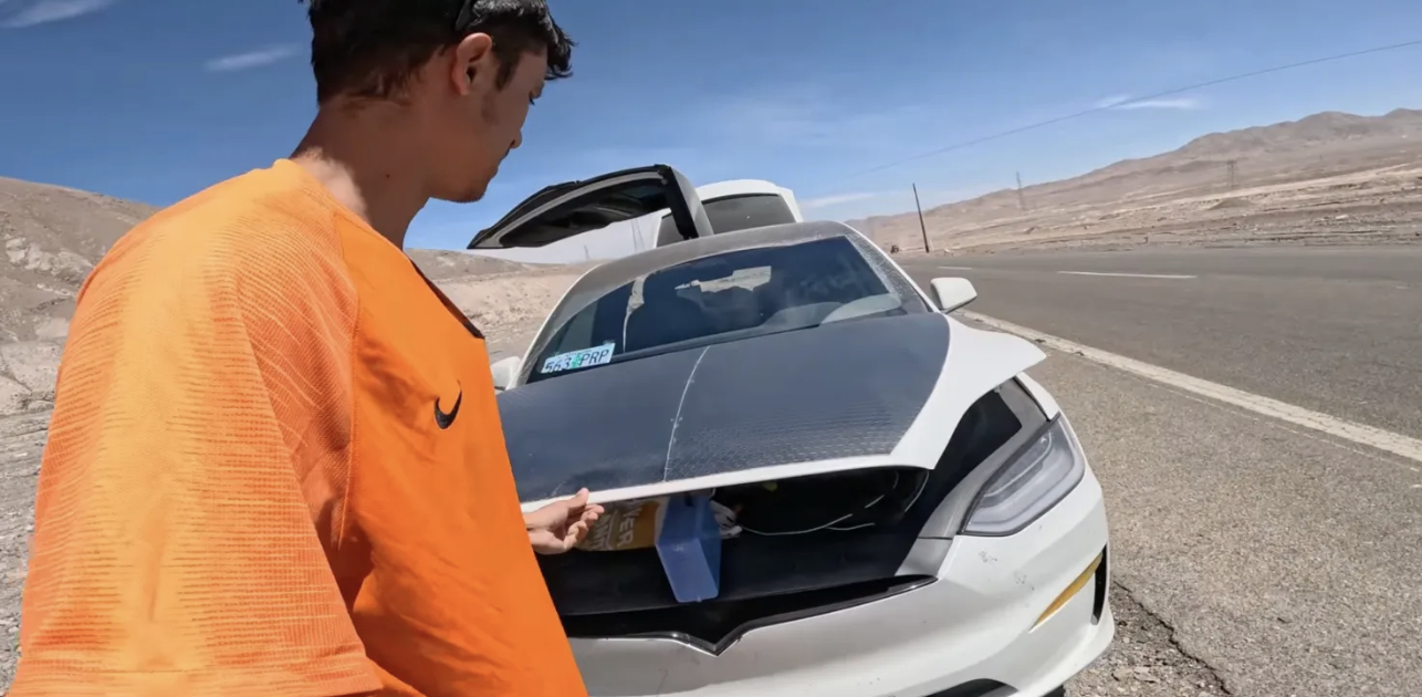 一位油管博主驾驶特斯拉Model X穿越整个美洲大陆,在地球上最干燥的智利阿塔卡马沙漠中电池耗尽,不得不在高速公路旁架设应急太阳能板充电。