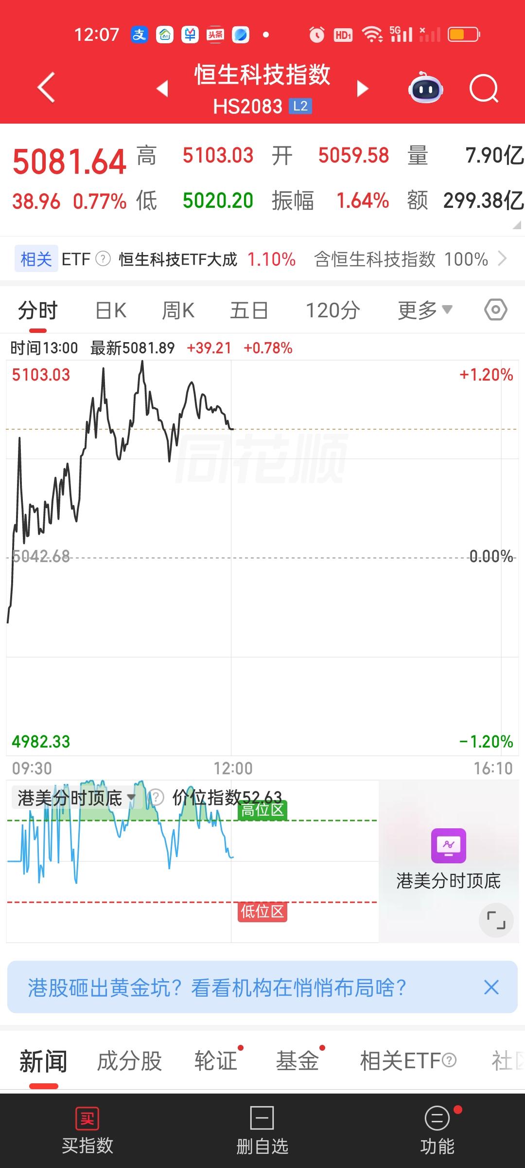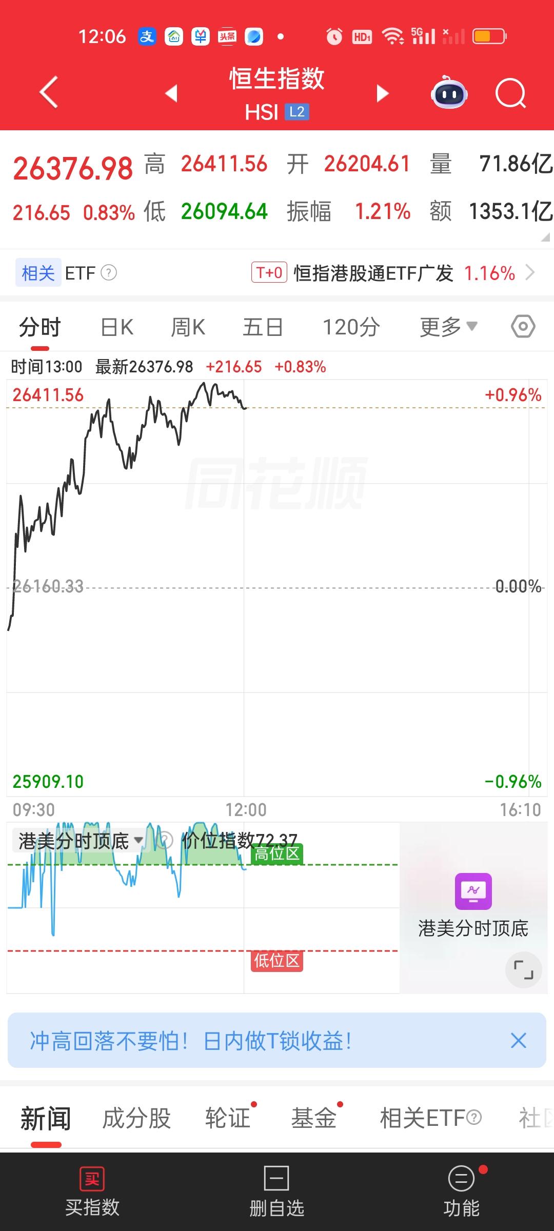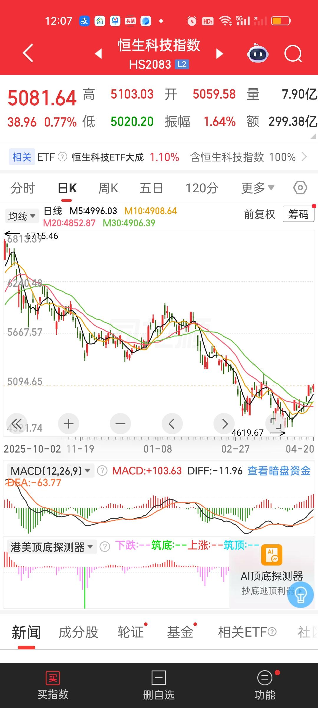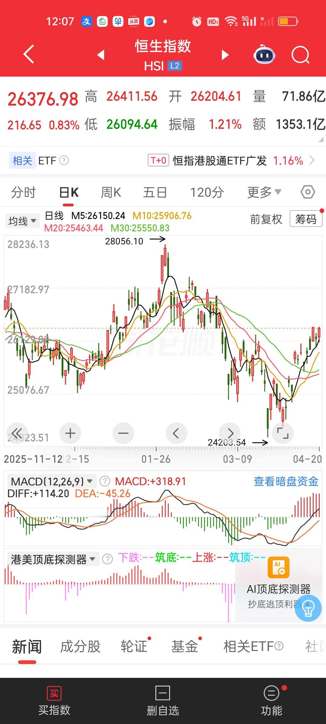 港股中午收盘两大指数依旧稳稳收在了所有均线的上方。只要还在均线上方就不用过于担心。最起码反弹就不会那么早结束。但现如今的港股已经今非昔比,吸引外资的能力也在大大降低。你指望它能有破新高的表现那也不现实。看着别的指数每天都在创新高,港股只能小涨慢涨缓涨,这种心理落差是巨大的。港股当前所处的位置,用不着太担心,继续稳稳拿住就行。