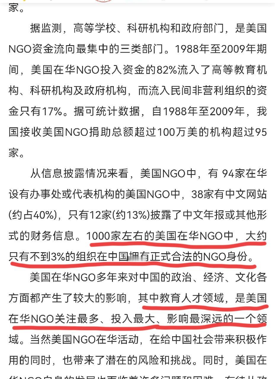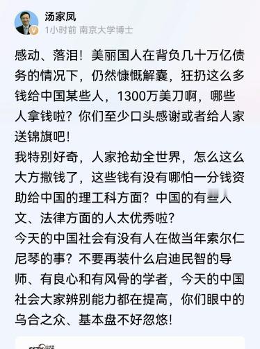 汤教授质疑谁拿走了这1300刀? 虽说老特砍了许多项目,但美国会掌握的民主基金会发给我们的1300刀,折算人民币也是上亿呀,加上小本子外务省打的狗粮款,一年下来,这样的钱少说也有几亿吧。 记得看过一个官方慈善机构发布的报告,美国的NGO在华组织有1000多个,主要资助对象是高等院校,研究机构等,就像汤教授所说,这些钱绝不会给理工科搞科技研发的。 有时不免联想到网上是不是也有人拿到了这些钱?不然他们为什么那么卖力鼓吹或带节奏?拿人钱财替人说话。 NGO打钱的方式绝对很隐秘,比如学术研讨会呀、项目合作呀、慈善救助呀,奖项没置呀等形式,有人就悄咪咪的就把这些钱揣进了自己兜里,然后义正辞严地搞启迪民智什么的。 出小钱办大事,美丽国和小本子这些套路是不会放弃的,我们必须警惕!