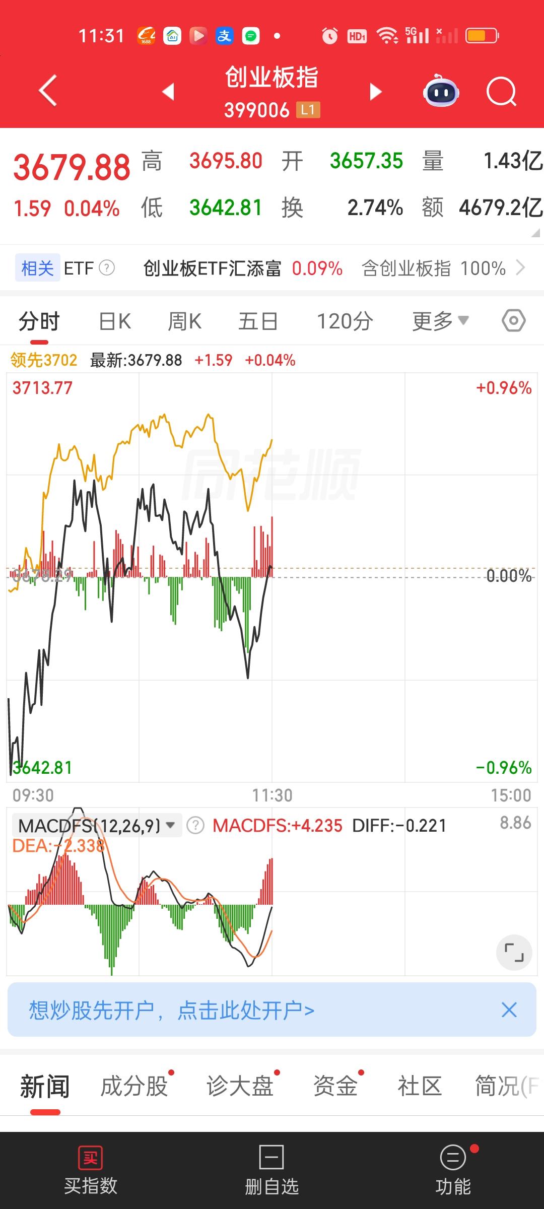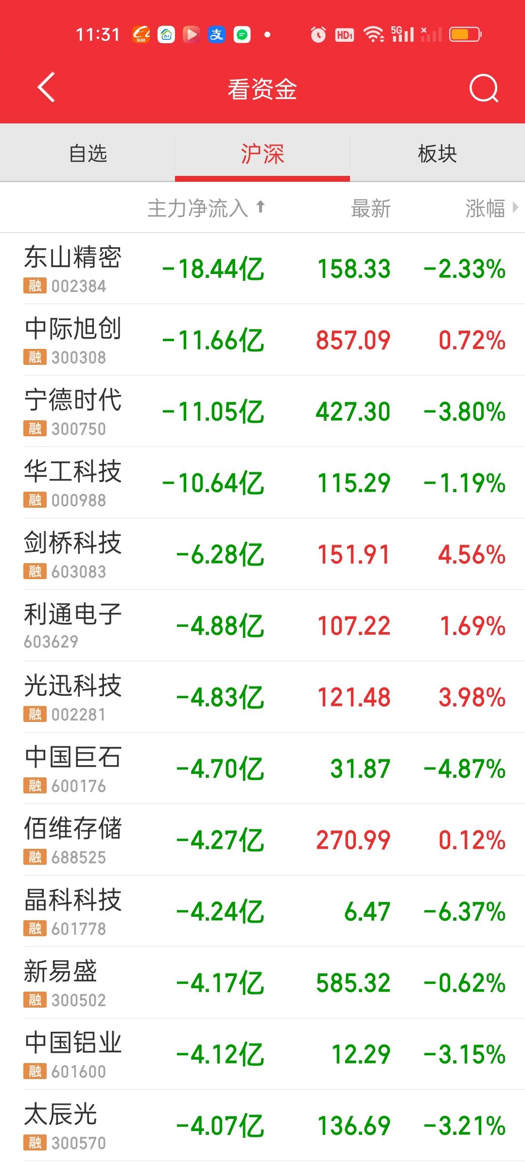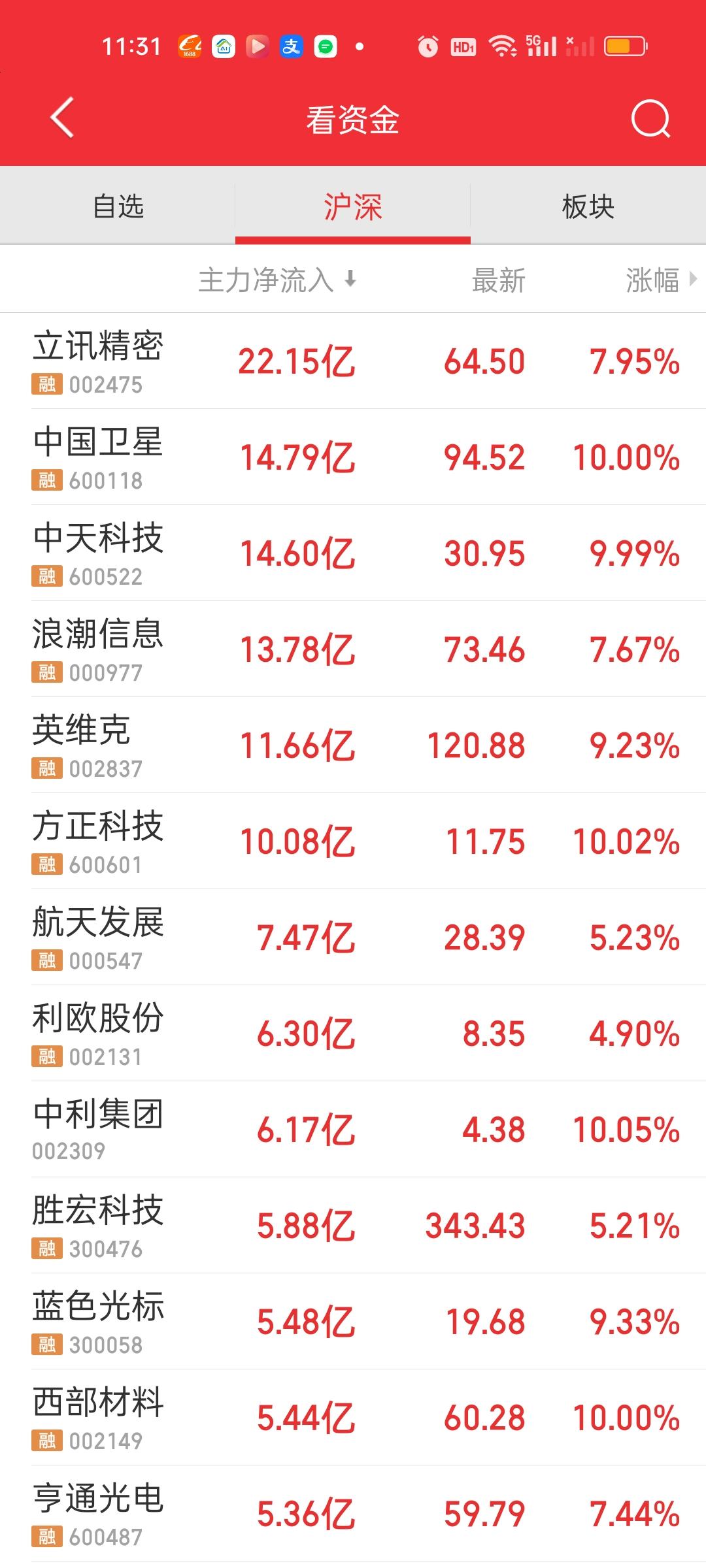 中午收盘了,成交量在继续放量,涨停家数也还在增加。大盘资金净流出变化不大,盘面走势来看,上证指数不明显,但深指和创业板指有一个很明显的跳水动作。但很快就被拉起来了。创业板指前面那几个巨头占比实在太高了,对指数的影响是巨大的。 主力资金净流入超10亿的个股,新增了立讯精密,中国卫星和方正科技。净流出资金超10亿的个股增加了中际旭创,宁德时代和华工科技。