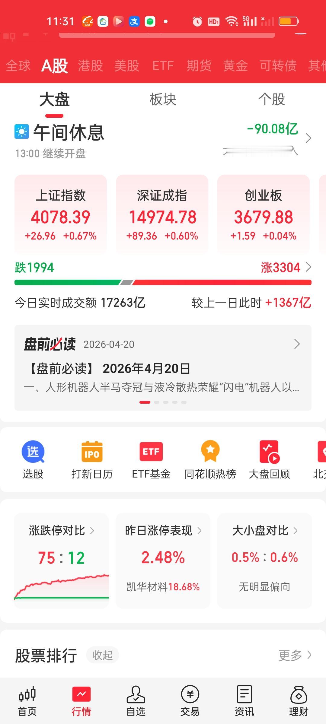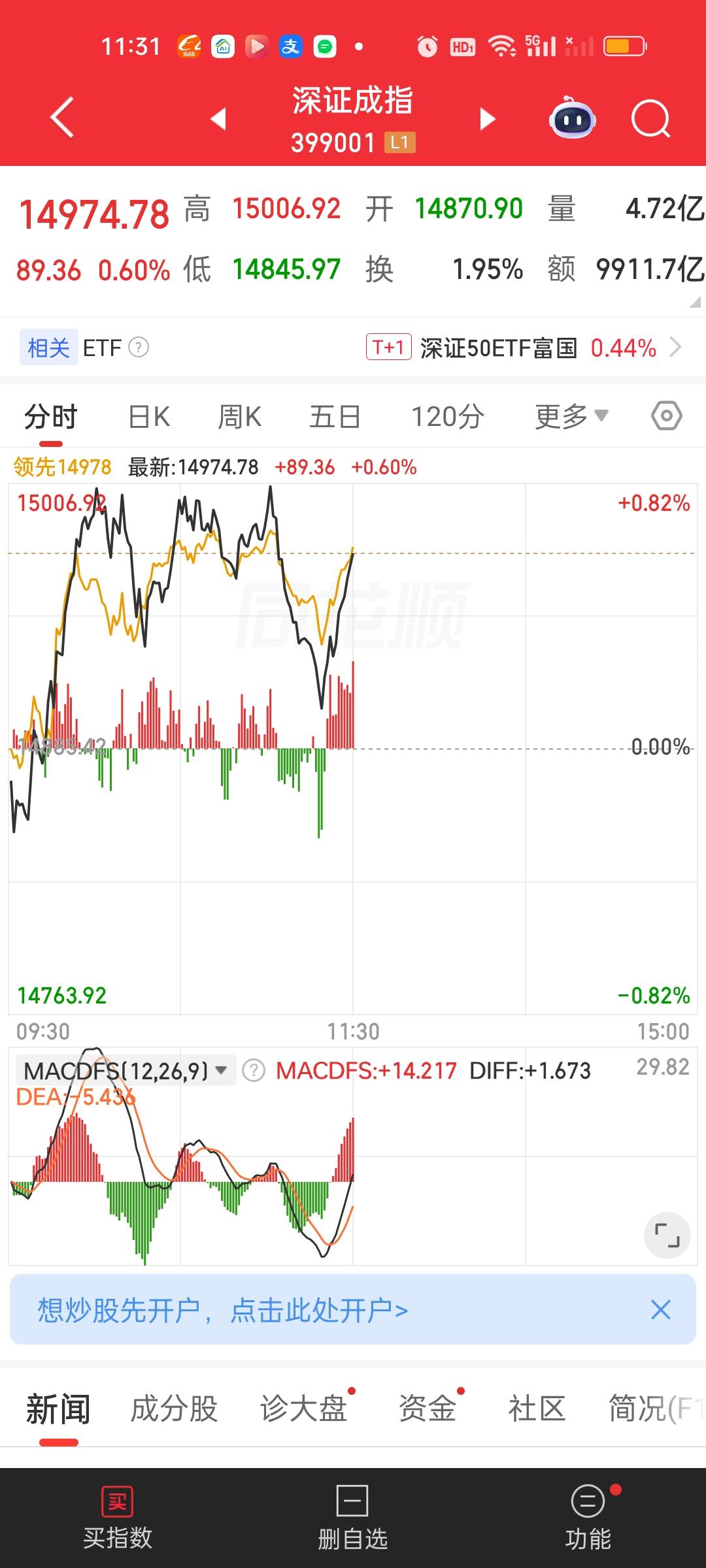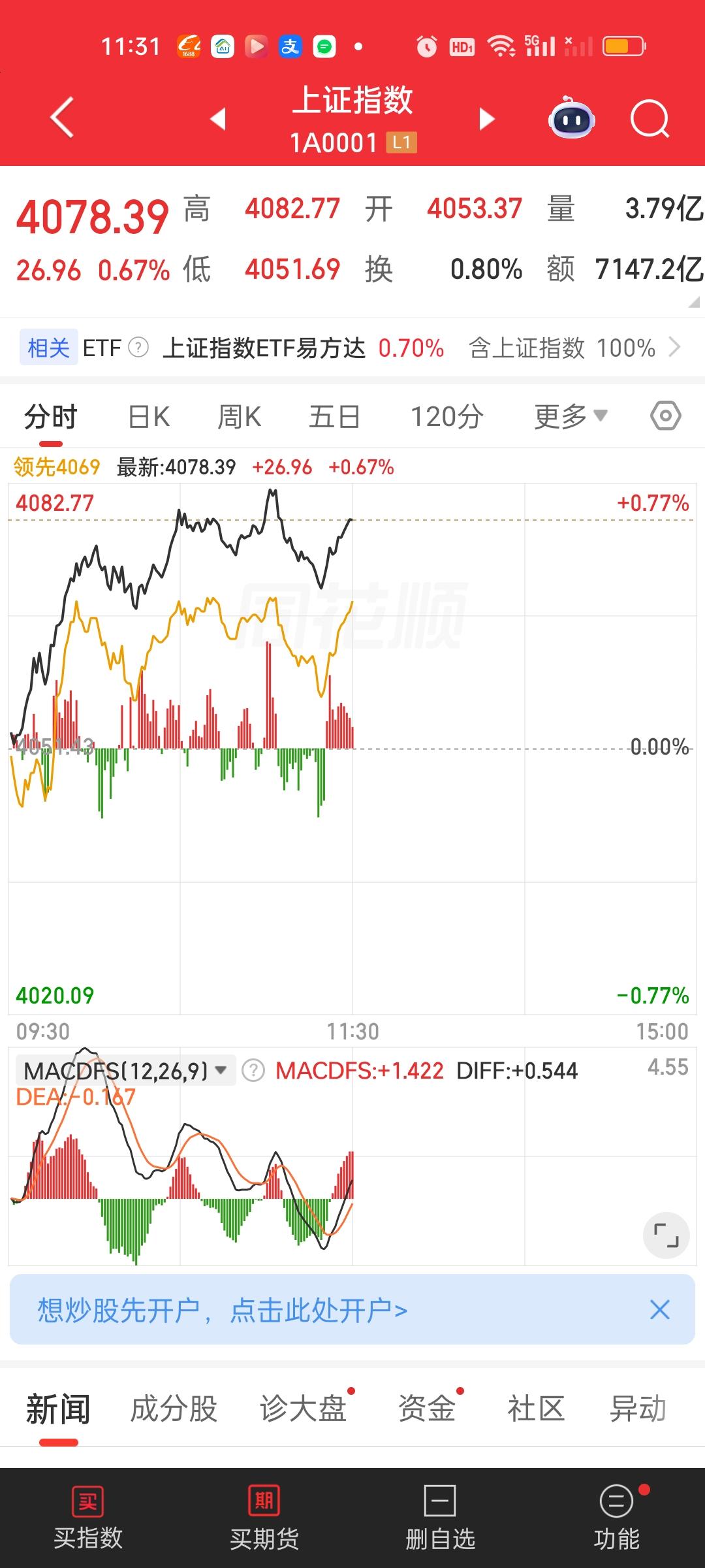 中午收盘了,成交量在继续放量,涨停家数也还在增加。大盘资金净流出变化不大,盘面走势来看,上证指数不明显,但深指和创业板指有一个很明显的跳水动作。但很快就被拉起来了。创业板指前面那几个巨头占比实在太高了,对指数的影响是巨大的。 主力资金净流入超10亿的个股,新增了立讯精密,中国卫星和方正科技。净流出资金超10亿的个股增加了中际旭创,宁德时代和华工科技。