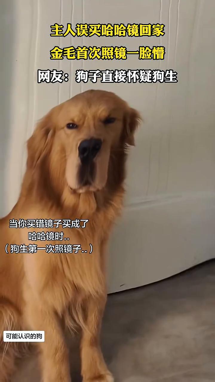 主人误买哈哈镜回家,金毛首次照镜一脸懵。 网友:狗子直接怀疑狗生。当你买错镜子买成了哈哈镜时,狗生第一次照镜子。可能认识的狗,车轮巨狗,令狗头大,苏格兰牧羊犬。