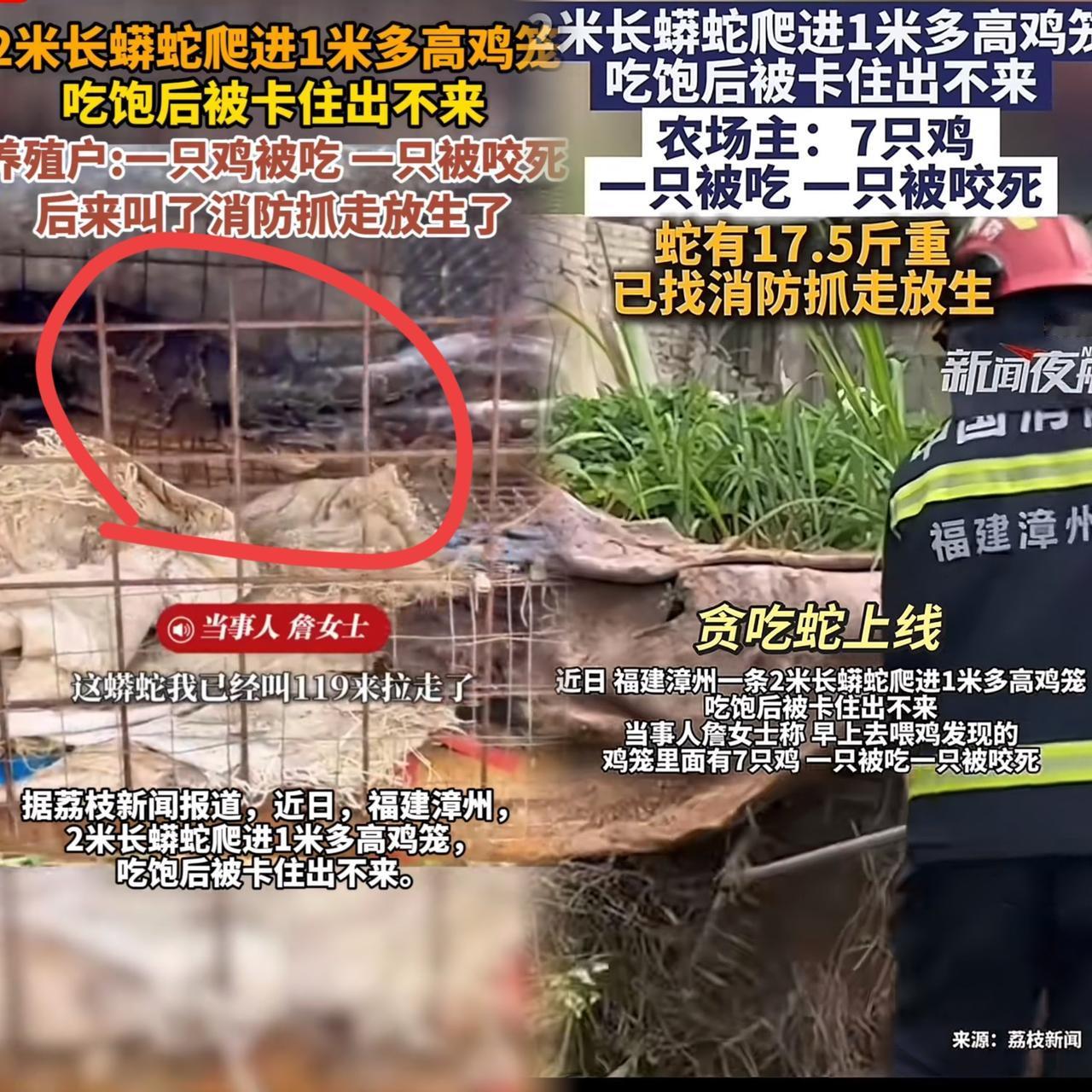 太可怕了!福建,一女子在上山搞养殖,早上来喂鸡时,一到地方就发现地上躺着一只鸡,已经被咬死了。顺着鸡笼一看,只见一条大蟒蛇盘在里头,肚子鼓鼓囊囊的,明显刚吞了一只鸡。 詹女士冷静避险,立刻联系消防,既没冲动动手也没伤害保护动物,处理方式堪称教科书。 这条国家二级保护动物最终被安全放生,既守住了生态底线,也避免了人蛇冲突。 春暖蛇出没,山区朋友务必提高警惕,遇蛇别慌别硬刚,及时求助专业人员才是上策。 贪吃丢了自由,遇事稳住心态,你们遇到蛇会第一时间报警吗?