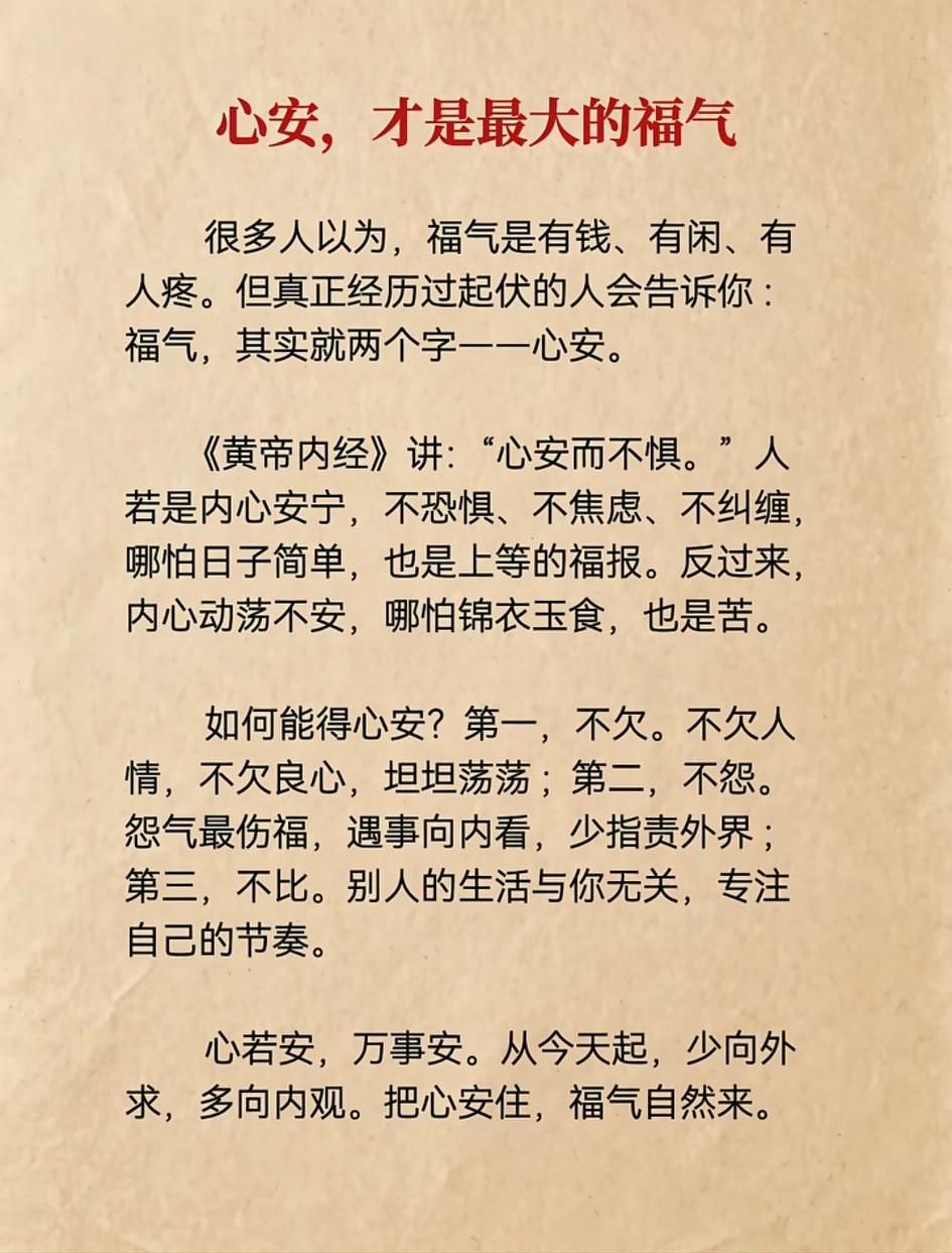 人生本无完美,不必苛求圆满,不贪富贵荣华,不盼人人称好。守得住本心,行得正坐得端,活得心安理得,便是人间好时节。 心安,是这辈子最实在的福。钱再多,心有牵绊,食不知味;名再盛,亏了良心,夜不能寐。心不安,金屋银宅也如牢笼;心若安,粗茶淡饭也有回甘。 心安,才是人间最踏实、最长久的幸福。它藏在三餐四季的寻常里,落在历经千帆后的从容中,是我们一生最珍贵的财富。