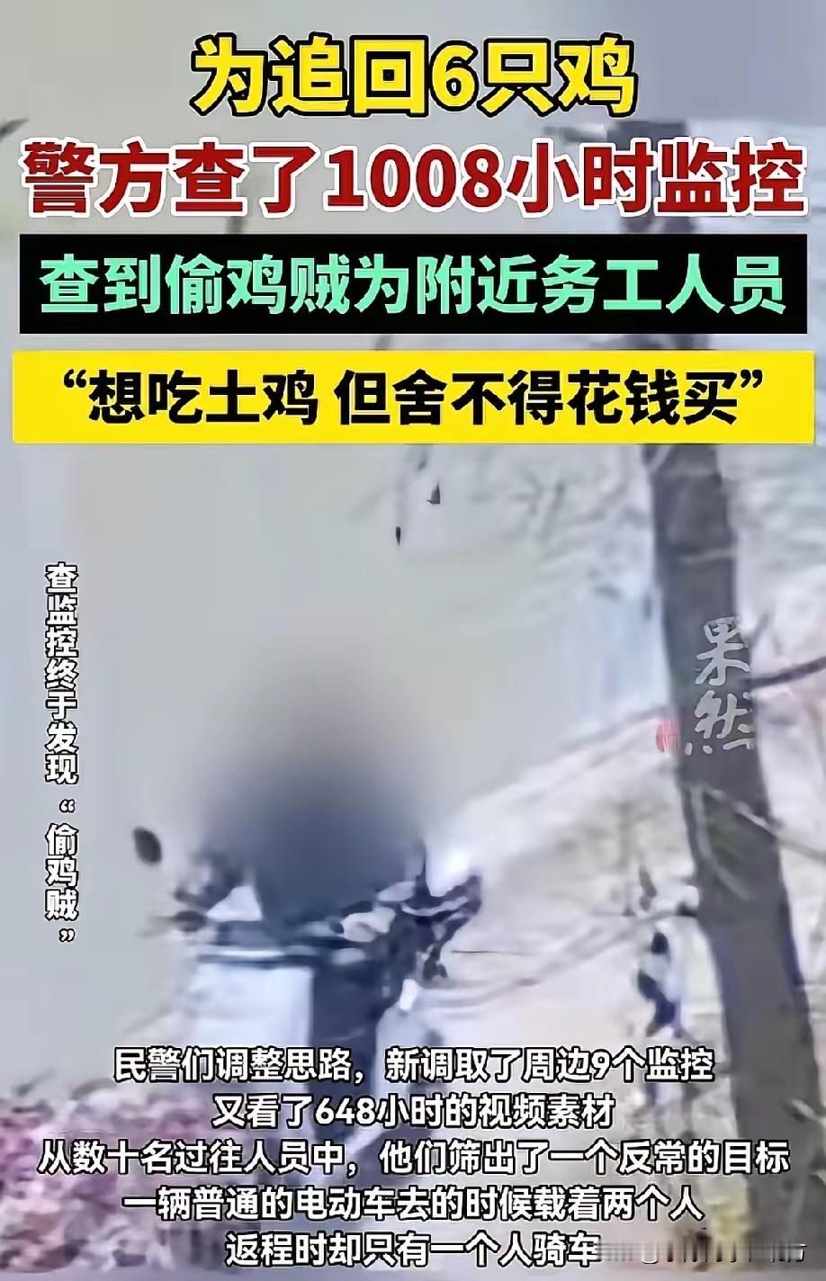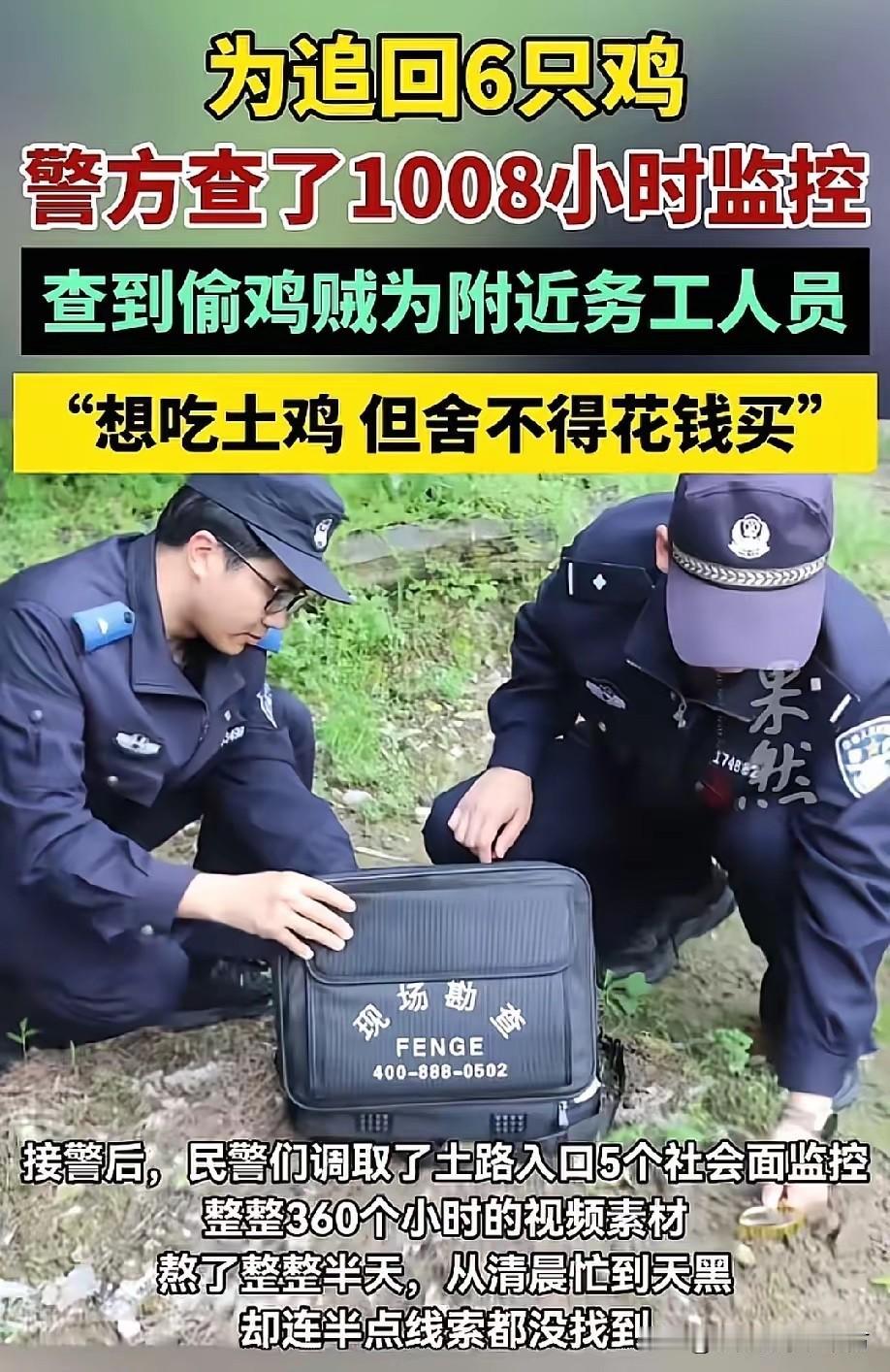 这才是人民的好公仆!近日,浙江台州,一老人丢了6只鸡,为了找回这6只丢失的鸡,当地民警整整42天的坚守,看完1008个小时的监控,帮老人找回了被盗的6只土鸡,民警的行为瞬间暖遍了全网。 事情发生在今年4月2日清晨,台州临海贺家村的蒋大爷,像往常一样早早起床,准备去自家鸡舍喂鸡。 可当他走到田边的鸡舍旁时,整个人都懵了,原本热闹的鸡舍空空荡荡,养了三年的6只老土鸡,一只都不见了,只在地上留下几根凌乱的鸡毛。 看着空荡荡的鸡舍,蒋大爷又急又心疼,差点急哭出来,周围的村民闻讯赶来,都劝他:“大爷,不就几只鸡嘛不值钱,报警也没用,警察哪有功夫管这点小事。” 可蒋大爷实在不甘心,抱着最后一丝希望,颤抖着双手拨通了报警电话。电话里,老人带着哭腔一遍遍跟民警诉说着自己的焦急,他没想到这个看似微不足道的报警电话,真的被民警放在了心上。 接到报警后,临海江南派出所的民警丝毫没有怠慢,短短10分钟就集结警力,火速赶往蒋大爷家的案发现场。 一开始,民警先调取了土路入口的5个监控,足足360个小时的视频素材。 面对海量的监控画面,民辅警们轮番上阵,盯着屏幕逐帧查看,不敢放过任何一个可疑的身影和车辆。 他们渴了就喝一口凉水,眼睛酸了就揉一揉,困了就用凉水洗把脸,从清晨查到深夜,眼睛都熬得通红,可依旧没有找到有用的线索。 案件一下子陷入了僵局,可民警们没有丝毫放弃的念头,他们心里清楚,对老人来说这6只鸡或许不值多少钱,但却是老人实打实的财产,是老人的心头肉,群众的事再小,也是大事,绝不能让老人白白受损失。 随后,民警再次赶往现场,进行地毯式排查,不放过任何一个角落,在拨开鸡舍旁半人高的杂草时,民警发现了泥地上一串浅浅的脚印,顺着脚印一路查找,找到了一条隐藏在草丛和河边的偏僻小路,这条路平时很少有人走,正好避开了主干道的监控。 找到突破口后,民警立刻扩大监控范围,又调取了周边9个监控探头,新增648小时的视频素材,前后累计查看的监控时长,达到了惊人的1008小时!。 为了尽快找到线索,民警们放弃休息时间,轮番值守在监控室,一遍遍回看视频,逐一排除无关的行人和车辆,重点排查深夜经过这条偏僻小路的可疑人员。 功夫不负有心人,经过连日来的不懈努力,民警从数十个过往人员中,锁定了两名可疑男子。 两人深夜骑着电动车进入偏僻小路,去的时候车上两人,返程时只剩一人,且其中一名男子行踪鬼祟,从鸡舍方向匆匆离开,时不时回头张望,形迹十分可疑。 顺着这条线索,民警一路追踪,最终在一处偏僻的出租房内,找到了被偷走的6只土鸡,当场抓获了两名偷鸡嫌疑人。 经审讯,两人都是附近的务工人员,因为嘴馋又舍不得花钱买鸡,便盯上了蒋大爷散养的土鸡,趁着深夜无人绕小路偷走了鸡,本想着偷偷养起来再食用,没想到民警会为了几只鸡,下这么大的功夫追查。 当天傍晚,民警亲自开车把6只土鸡完好无损地送回了蒋大爷家中。 看到失而复得的土鸡,蒋大爷激动得说不出话,紧紧握着民警的手,眼眶瞬间红了,泪水在眼眶里打转,他哽咽着说:“我本来都彻底放弃了,没想到你们真的把鸡找回来了,太谢谢你们了,这么点小事让你们费了这么大的心!” 看着老人开心的笑容,听着土鸡清脆的叫声,在场的民警再辛苦也觉得值得。 很多网友看完这件事,纷纷留言点赞:“这才是人民公安为人民!” 也有的网友表示:“小事不小办,温暖老百姓的心”“民警太负责了,必须点赞”。 确实,1008小时的监控,看似是耗费大量精力的小事,却守护了老人的财产,温暖了整个乡村。 民警没有因为事情小就敷衍了事,而是用耐心和坚守兑现了为民服务的承诺,这份用心远比找回几只鸡更有意义。 在我们身边,正是有这样一群默默付出的民警,把群众的鸡毛蒜皮当成大事,用心解决每一个小诉求,才让我们的生活充满安全感和温暖。 为台州民警点赞,也正是这样一件件暖心的小事汇聚成了最动人的人间温情,让平凡的日子多了满满的感动与安心。 群众事无小事,细微之处见真情,民警用1008小时的坚守,换来了老人的安心与笑容,这份担当值得我们所有人致敬,也让我们真切感受到,最暖心的守护一直都在身边。
