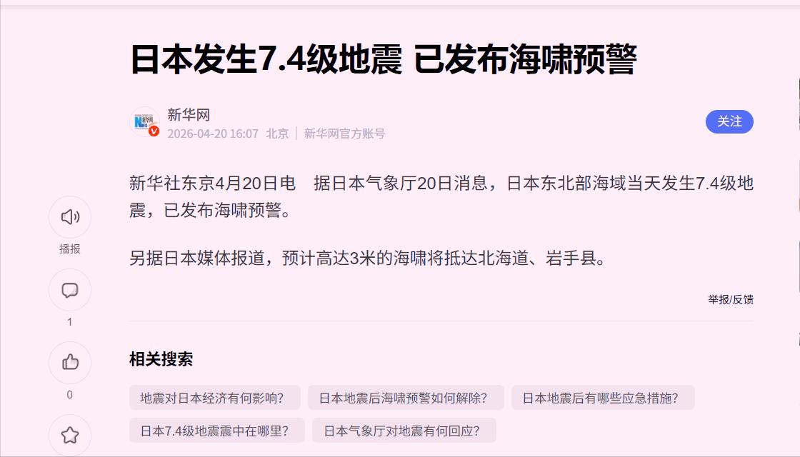 突发!日本发生7.4级地震,东京震感明显! 日本当地时间 4 月 20 日 16 时 53 分,日本东北部沿海直接爆出7.4 级强震,最大震度达到 5 强,连东京都震感明显,全屋晃动那种。 日本气象厅紧急拉响海啸警报,预测岩手、北海道沿岸海啸最高能到 3 米,青森、宫城也有 1 米左右,情况挺危急。日本本身就在地震带上,这种级别的强震不算罕见,但每次都够吓人的。 这次震中在东北沿海,离福岛、宫城很近,这一带之前就多次遭强震和海啸重创,还引发过核泄漏,风险本就高。现在又来 7.4 级地震,还触发海啸预警,当地民众肯定人心惶惶。 希望当地能做好防灾避险,尽量减少伤亡和损失。也提醒在日华人注意安全,远离沿海区域,听从官方指引。 对此,你怎么看?欢迎留言讨论! 我是谭天道地,欢迎关注我。