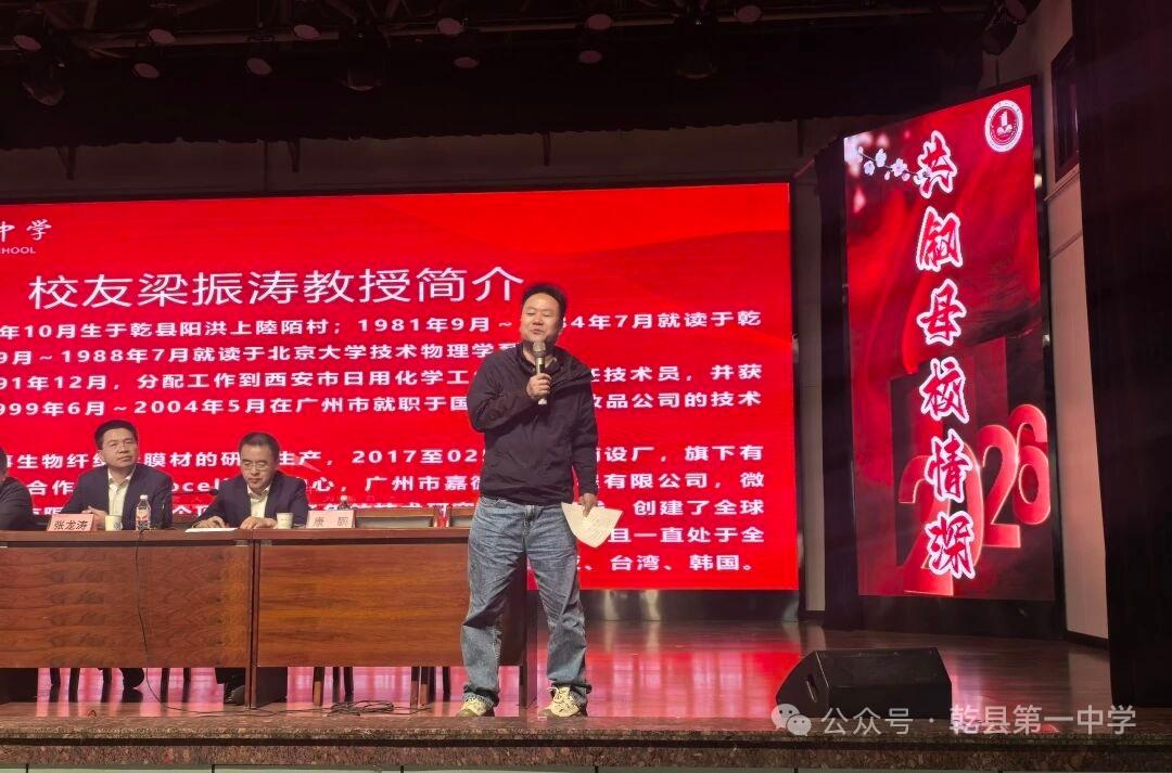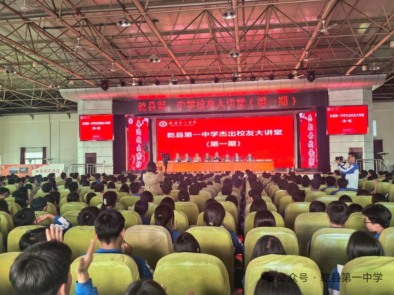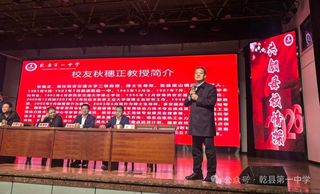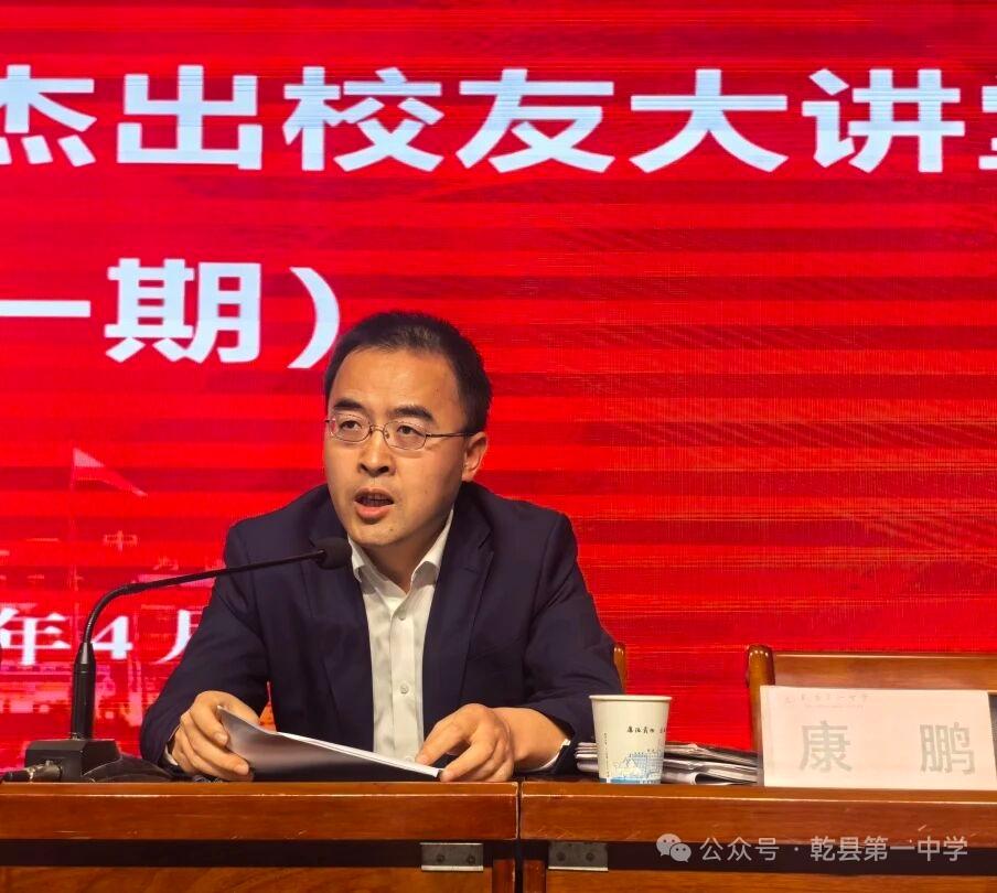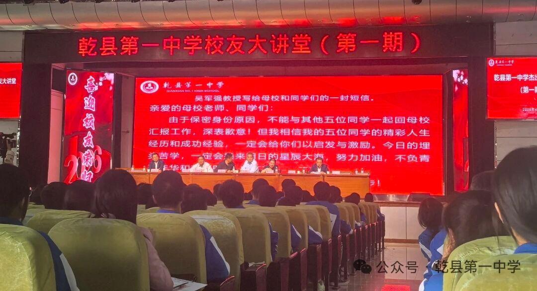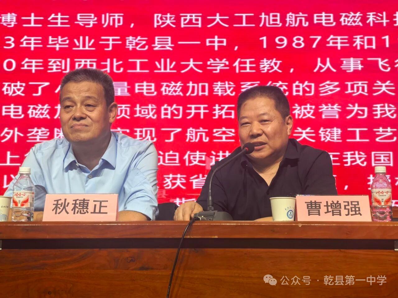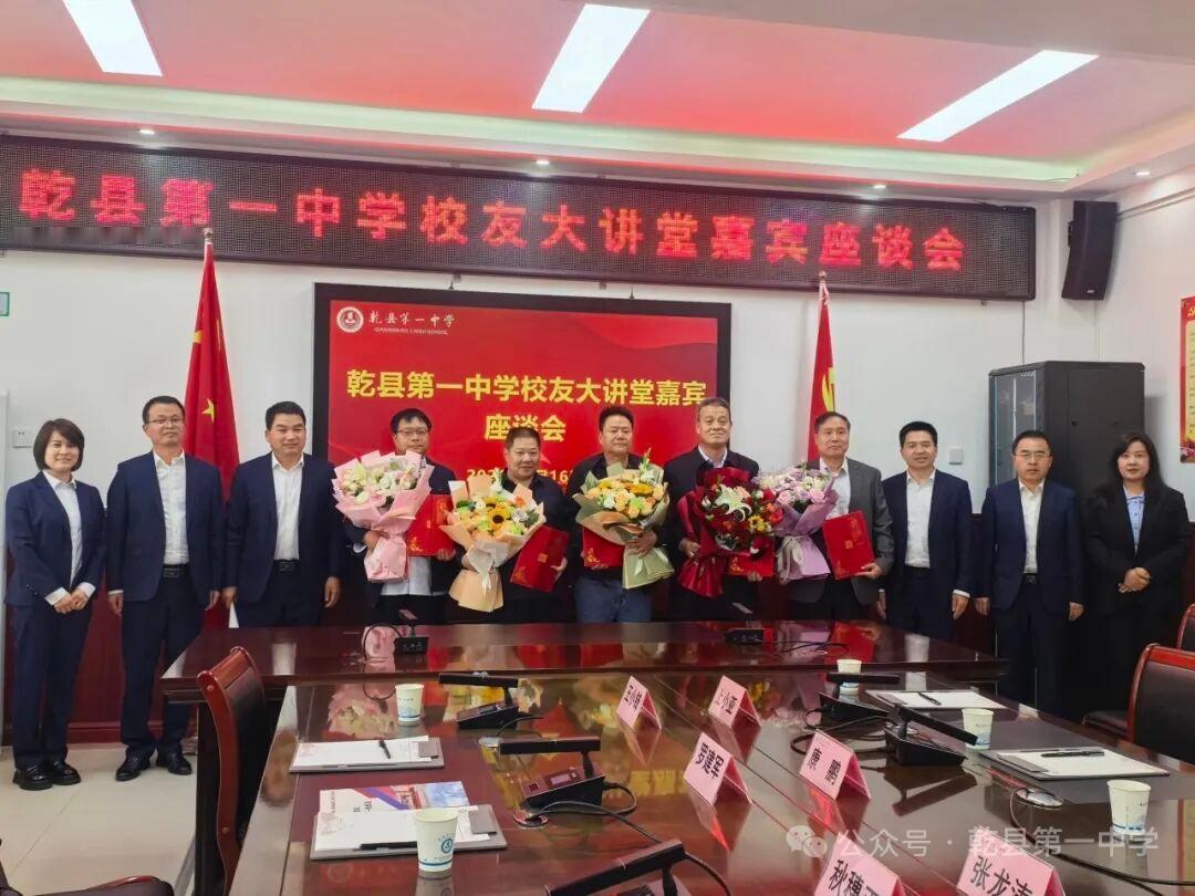 乾县第一中学“优秀校友大讲堂”启动仪式暨第一期校友报告会 4月16日,“乾县一中校友大讲堂启动仪式”由李显著副校长主持,书记、校长张龙涛老师致欢迎辞并向秋穗正教授、梁振涛教授、罗建军教授、曹增强教授四位杰出校友颁发聘书、赠送鲜花,书记、局长侯佼讲话。校友报告会,副书记康鹏总结讲话。