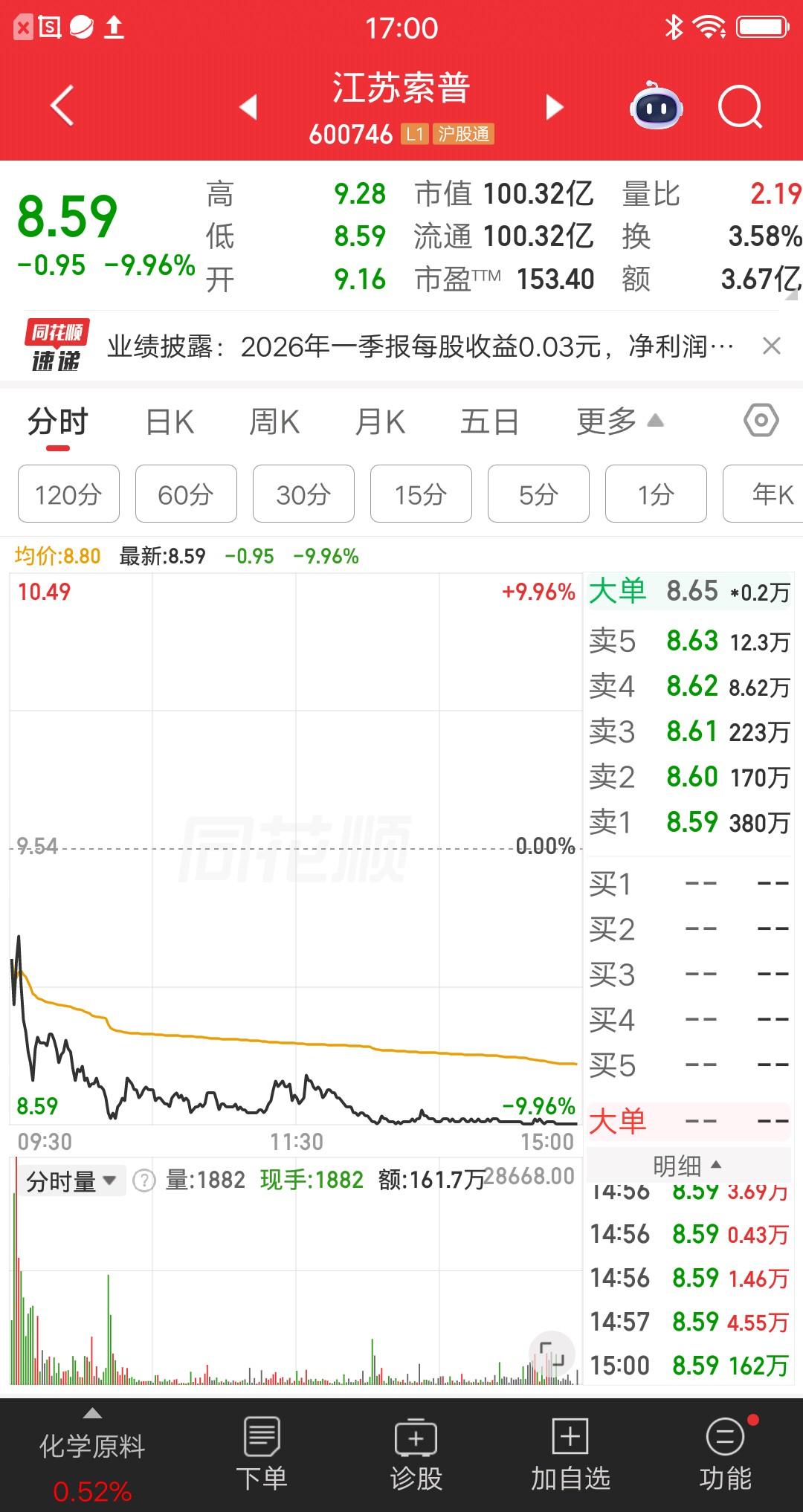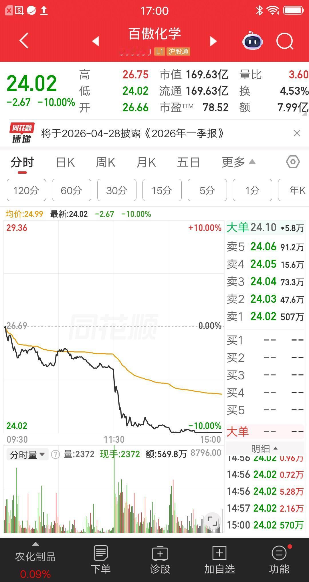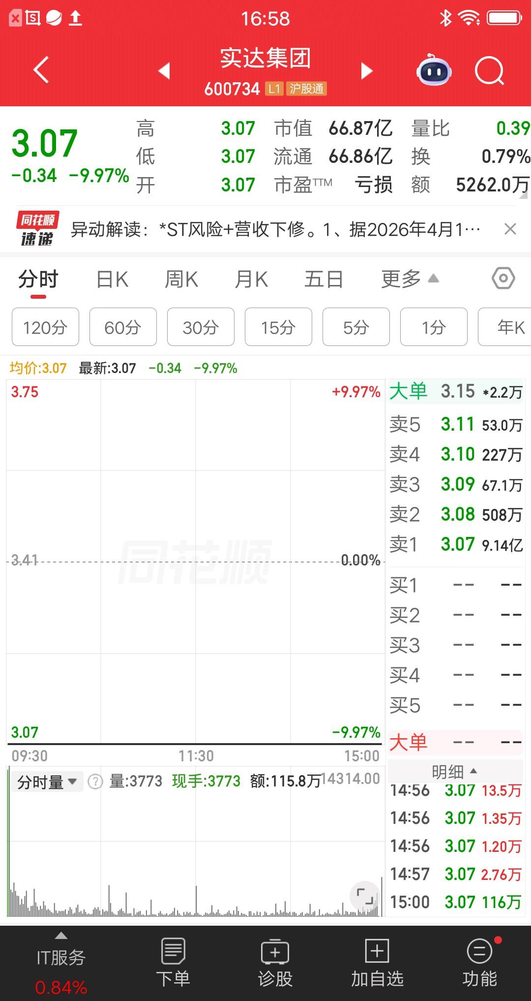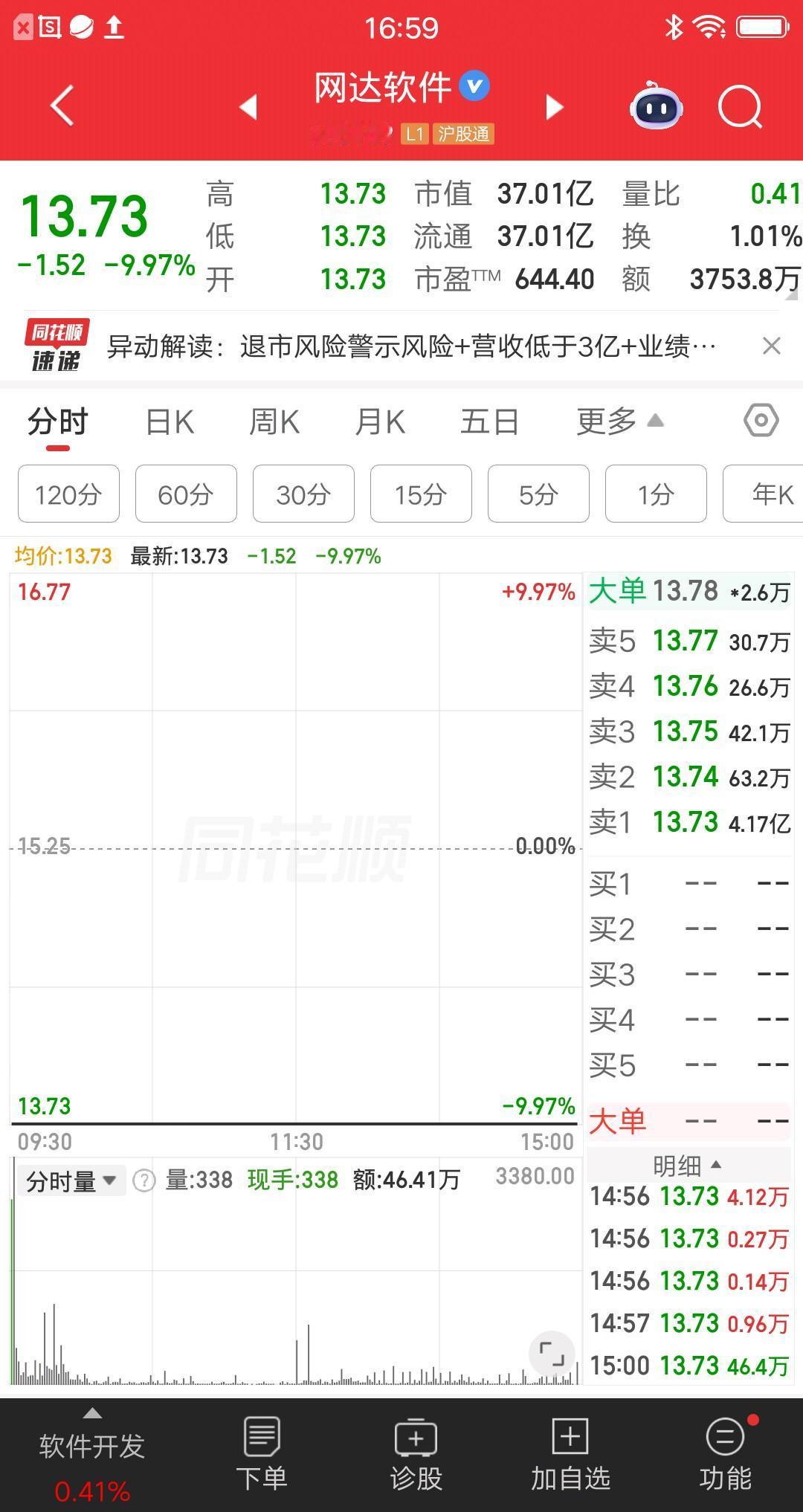 A股今天最惨的票诞生了,公司业绩暴雷了,要被披星戴帽,数万散户账户大亏,估计想销户的心都有了。 该票集合竞价一字跌停,全天成交额1099.1万,割肉出局的人是有纪律的,碰上大利空果断割肉,不能有丝毫的侥幸心理。当然也不是所有人都能跑掉,板上还有2.54亿资金在排队。 大家以后选股,一定要慎之又慎,有暴雷风险的票别碰。 今天还有五只跌停的票:实达集团,也是业绩不达标要被*ST;网达软件,也是业绩不达标要被*ST;时空科技,百傲化学,江苏索普,超涨回调。