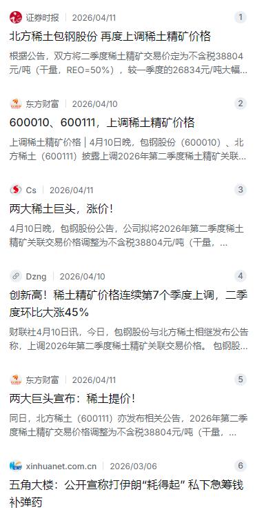 美军正急着补充武器库存,中方突然宣布了一个大消息,这下白宫彻底傻眼了! 4月10号晚上,北方稀土和包钢股份两家大公司一起发了公告,要上调第二季度稀土精矿的价格。 麻烦看官老爷们右上角点击一下“关注”,既方便您进行讨论和分享,又能给您带来不一样的参与感,感谢您的支持! 4月10号晚上,北方稀土和包钢股份发了个重磅公告,宣布把第二季度稀土精矿的价格上调到不含税38804元一吨。这个价格是什么概念呢?跟第一季度的26834元比起来,一口气涨了将近45%,也就是涨了11970元。这已经是这两家公司连续第七个季度提价了,而且这次涨幅创下了2023年定价机制改革以来的最高纪录。 别看只是涨了这么一档价格,背后的信号可不简单。要知道这两家都是包钢集团旗下的核心企业,包钢股份守着全世界最大的稀土共生矿白云鄂博,而北方稀土是它精矿产品的唯一客户,两家公司从2023年就建立了固定的季度调价机制,市场跟着氧化物价格走,消息一出很快就传导到整个产业链。 有意思的是,这波涨价刚好撞上了五角大楼焦头烂额的时候。2026年初美军对伊朗发动大规模军事行动,打击力度前所未有。根据《华尔街日报》和路透社的报道,光打击行动前4天,美军的成本就已经接近110亿美元。更让五角大楼头疼的是,精确制导武器的库存正在以惊人的速度消耗。《华盛顿邮报》引述知情人士说,先进导弹库存“正在迅速消耗”,如果再这么打下去,可能再过几天就不得不考虑优先拦截哪些目标了。 五角大楼这下彻底急了,正在准备申请追加500亿美元的补充预算,用来替换和补充消耗掉的武器弹药。同时,白宫也没闲着,紧急召集洛克希德·马丁、雷神这些军工巨头的高管,施压要求加速生产,甚至放话要制裁那些“怠慢”的企业。更夸张的是,五角大楼还找上了通用汽车和福特,希望这些车企能帮忙造武器。 不过问题来了,军工巨头们面对白宫的压力也很无奈。不是他们不想增产,而是巧妇难为无米之炊。现代高精尖武器根本离不开稀土,从天上飞的F-35隐形战机到深海潜行的核潜艇,从精确制导的导弹到复杂的雷达系统,稀土都是核心原材料。据美国国会研究服务处的报告,造一架F-35需要920磅稀土材料,造一艘“伯克”级驱逐舰需要5200磅,一艘“弗吉尼亚”级核潜艇更是要9200磅。具体来看,F-35的发动机热障涂层靠的是钇,雷达磁体要用钐钴,隐身涂层少不了铽;而战斧巡航导弹每枚消耗2.5公斤稀土来实现精确制导。 可这些稀土材料从哪里来呢?国际能源署的报告说得清清楚楚,中国掌控着全球超过90%的稀土冶炼分离产能,全球大约95%的永磁材料生产也集中在中国。也就是说,不管是美国想造导弹还是造飞机,中间的核心材料基本都得经过中国。 美国这些年不是不知道这个短板。特朗普上台后就搞了一套所谓的“关键矿产新战略”,又是拉50多个国家开会签协议,又是搞120亿美元的“金库计划”搞战略储备,还直接给美国唯一的稀土矿商MP Materials投了4亿美元,试图打通本土的“采矿—分离—磁材”产业链。但现实是残酷的。美国本土矿山产出的多是轻稀土,而且大部分还是要送到中国加工。重稀土更是短板中的短板,本土缺乏规模化精炼能力,MP Materials的分离项目还需要长期补贴。专家评估,美国要想重建一套完整的稀土加工体系,至少需要5到10年。 更要命的是时间窗口。据行业分析,五角大楼的战略储备中,镝和铽这些重稀土元素存量仅能维持42天,普通稀土储备也就能撑4到6个月。而五角大楼正在申请的500亿补充预算,面对稀土价格飙涨,实际能买到的东西就大打折扣了。 这一幕充满了讽刺意味。美国过去这些年在全球到处搞“脱钩断链”,动不动就对中国加关税、卡技术,恨不得在所有领域都把中国排除在外。结果等到自己最需要的战略物资上,发现绕来绕去根本绕不开中国的加工体系。说白了,这就是“去工业化”和“产业空心化”带来的苦果。直到上世纪80年代,美国还是全球稀土产业的霸主,后来在去工业化浪潮中,大量美国企业把开采的矿石运到中国加工,本土加工厂一家接一家关掉,技术团队和工程师也流失得七七八八。如今想吃回头草,发现人才断了、技术丢了、产业链散了,想补上这课起码十年起步。 就在五角大楼忙着筹钱补库存、白宫忙着给军工企业施压的时候,中国这边不声不响地就把价格抬上来了,而且动作合情合理——人家是按照公开透明的定价机制,基于市场供需和氧化物价格做的调整,完全合规合法。但就是这一下,精准击中了美国军工产业链最薄弱的地方,补库成本直接飙升,五角大楼的那点预算在涨价面前瞬间缩水。白宫傻眼的背后,其实是整个战略布局的全面落空。那些年费尽心思搞的围堵和封锁,到头来发现根本伤不了别人,反而把自己的软肋暴露得一干二净。