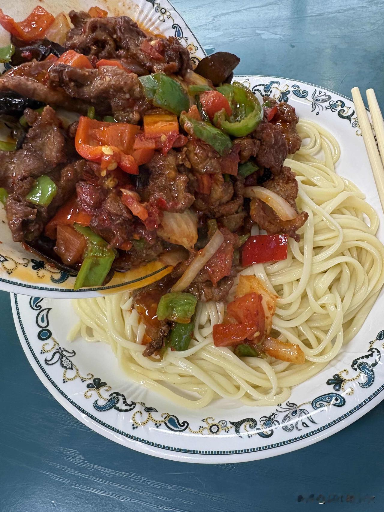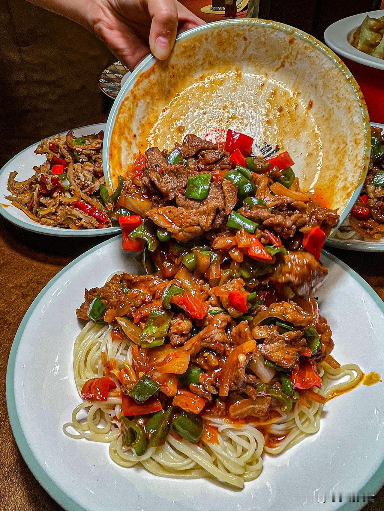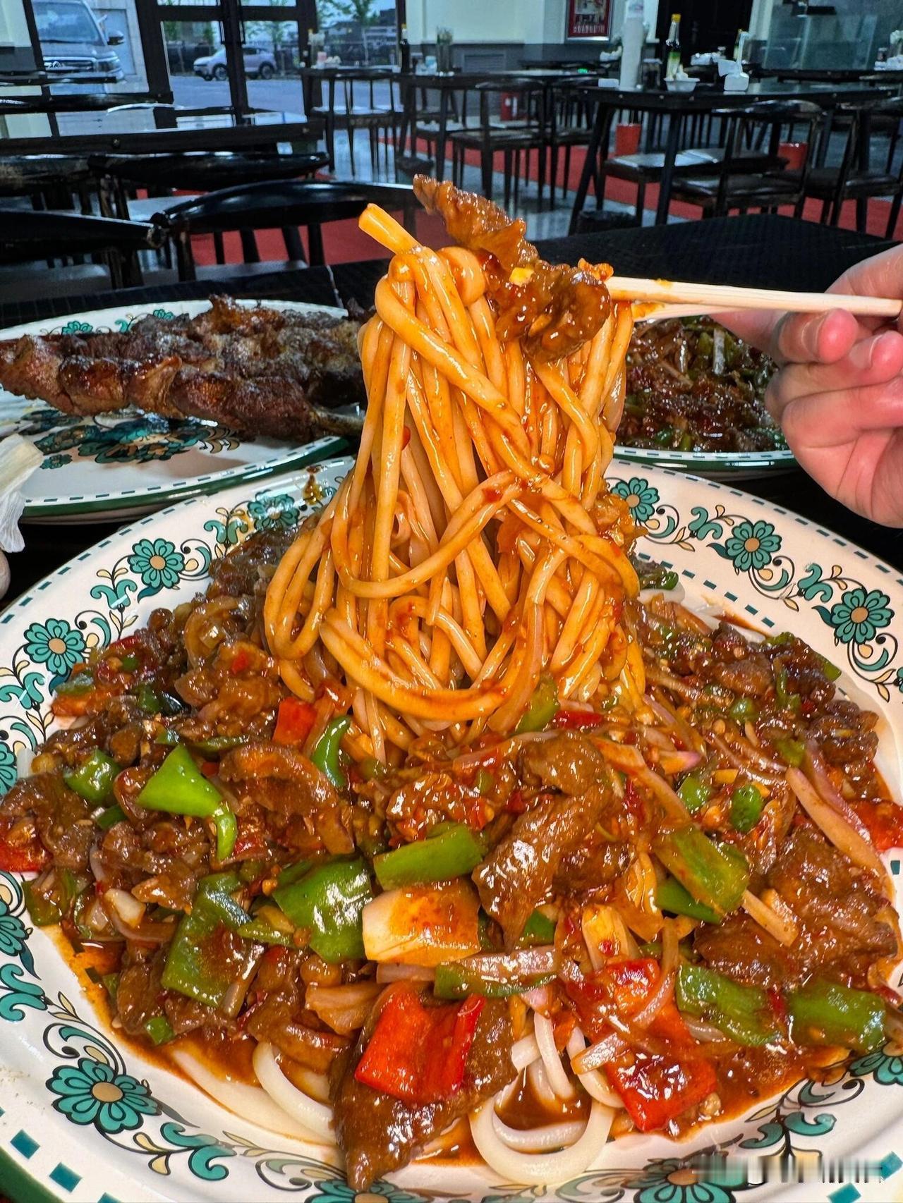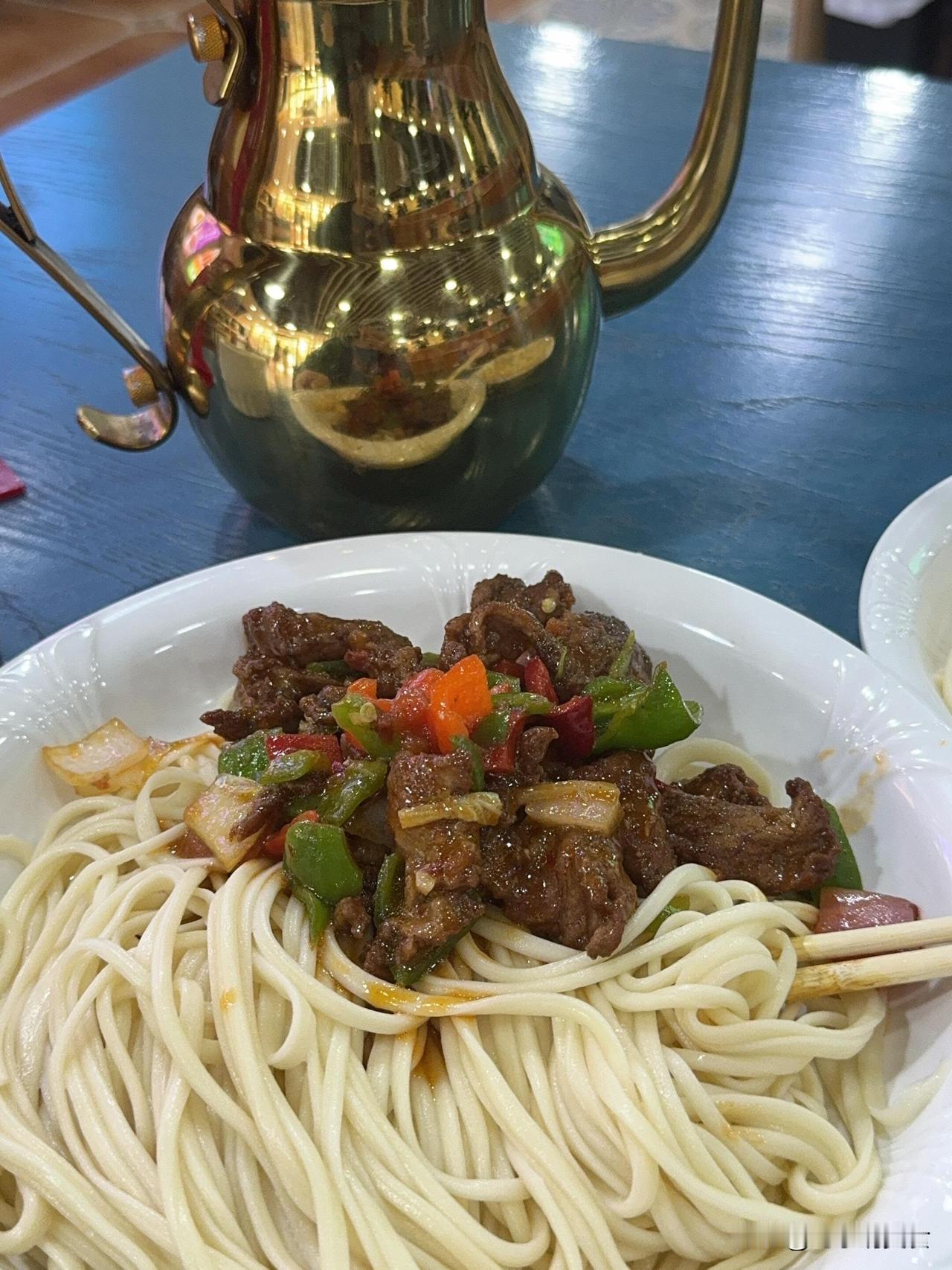 新疆的过油面好像25吧,厚片的牛肉炒青红椒一大盘,要不是怕浪费硬撑至少剩一小半,这牛肉的量放在兰州拉面能做出10碗来!