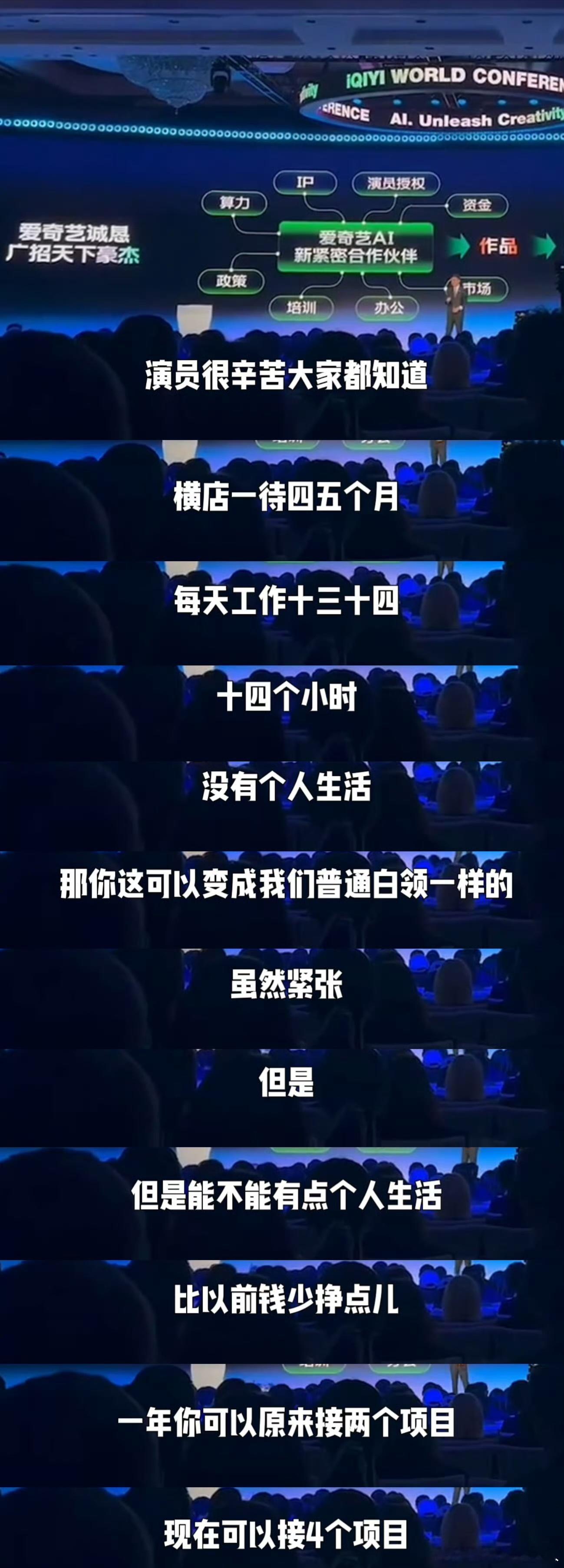 AI艺人库 自掘坟墓以前怎么也想不到,连演员都会被AI替代。说实话,爱奇艺这次搞AI艺人库,真有点杀鸡取卵的意思。看着是帮艺人多赚钱,实际上AI短剧成本那么低,直接把中下层演员的路堵住了,横店群演机会都少了一大半。如果真的能做到跟真人拍剧一样有真实情绪和感染力,那有AI艺人也无所谓。 爱奇艺疯了