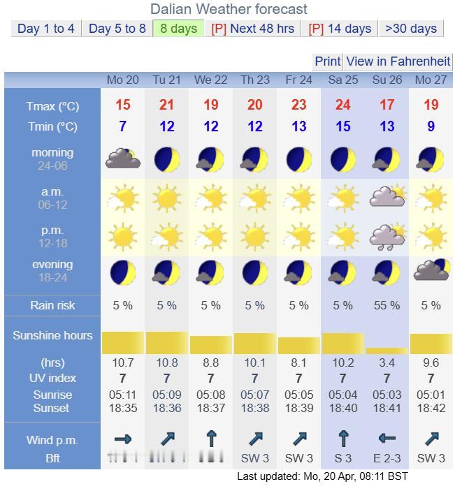 本周天气依旧是晴到多云为主,目前来看周日可能会有降雨,正值大连马拉松比赛,具体需要临近关注。本周冷空气不活跃,多数时间气温较为稳定舒适,周日或因降雨气温略回落,另外早晚和沿海局部偏凉,注意合理调整着装,谨防感冒。(图中气温和天气要素有所误差,以本文内容为准) 周二天气晴转多云,白天风力依旧稍大,气温明显回升,最高气温会来到19度附近; 周三天气多云转晴,风力不大,最高气温在18度附近; 周四天气晴好,最高气温依旧在18度附近; 周五晴间多云的天气,最高气温会来到20度附近; 周六天气晴好,气温继续上升,最高气温在22度附近,适合洗晒和出行; 目前来看周日有降雨概率,正值大连马拉松,时间尚远还需要临近关注。 最后提示一点3天以上的预报准确性低,建议大家关注临近的预报信息。