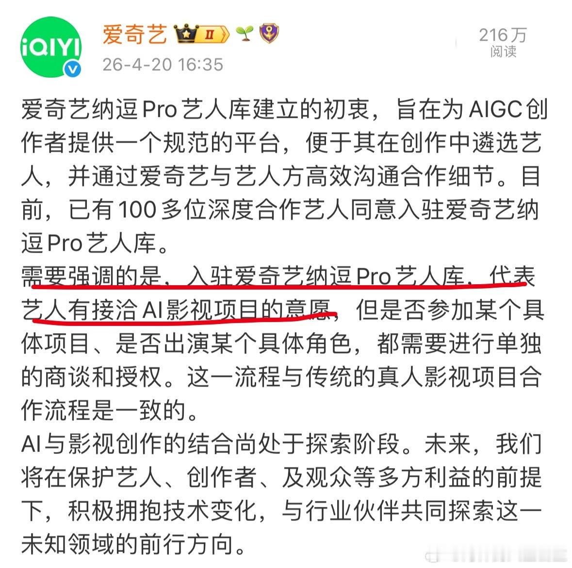 爱奇艺未授权AI艺人 爱奇艺说:需要强调的是,入驻爱奇艺纳逗Pro艺人库,代表艺人有接洽AI影视项目的意愿现在库里比较知名的艺人有:陈哲远、曾舜晞、郭俊辰、夏梦、焉栩嘉、丞磊、蒋龙、王子璇、翟潇闻、林子烨、程莉莎、马苏、方主任