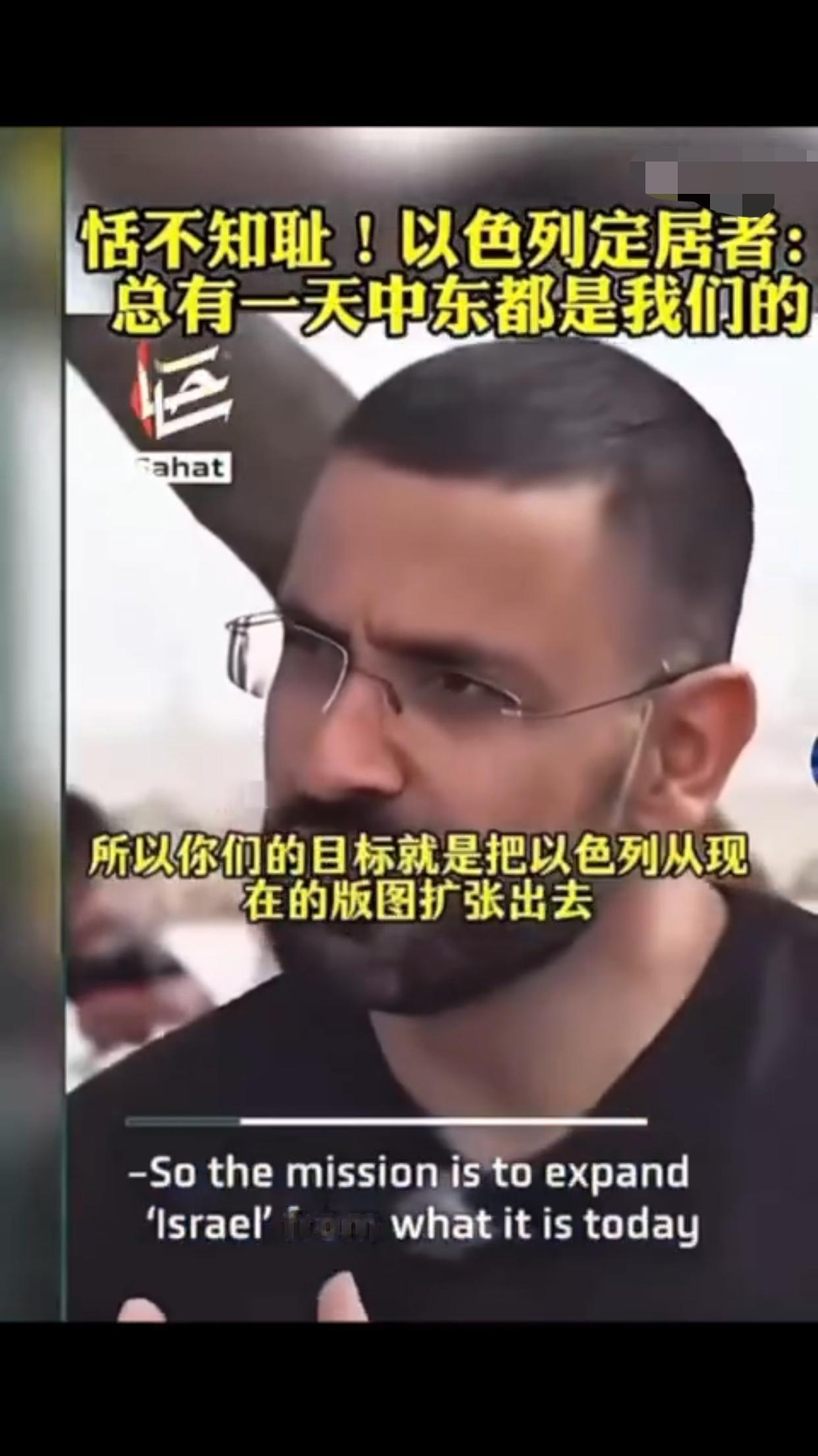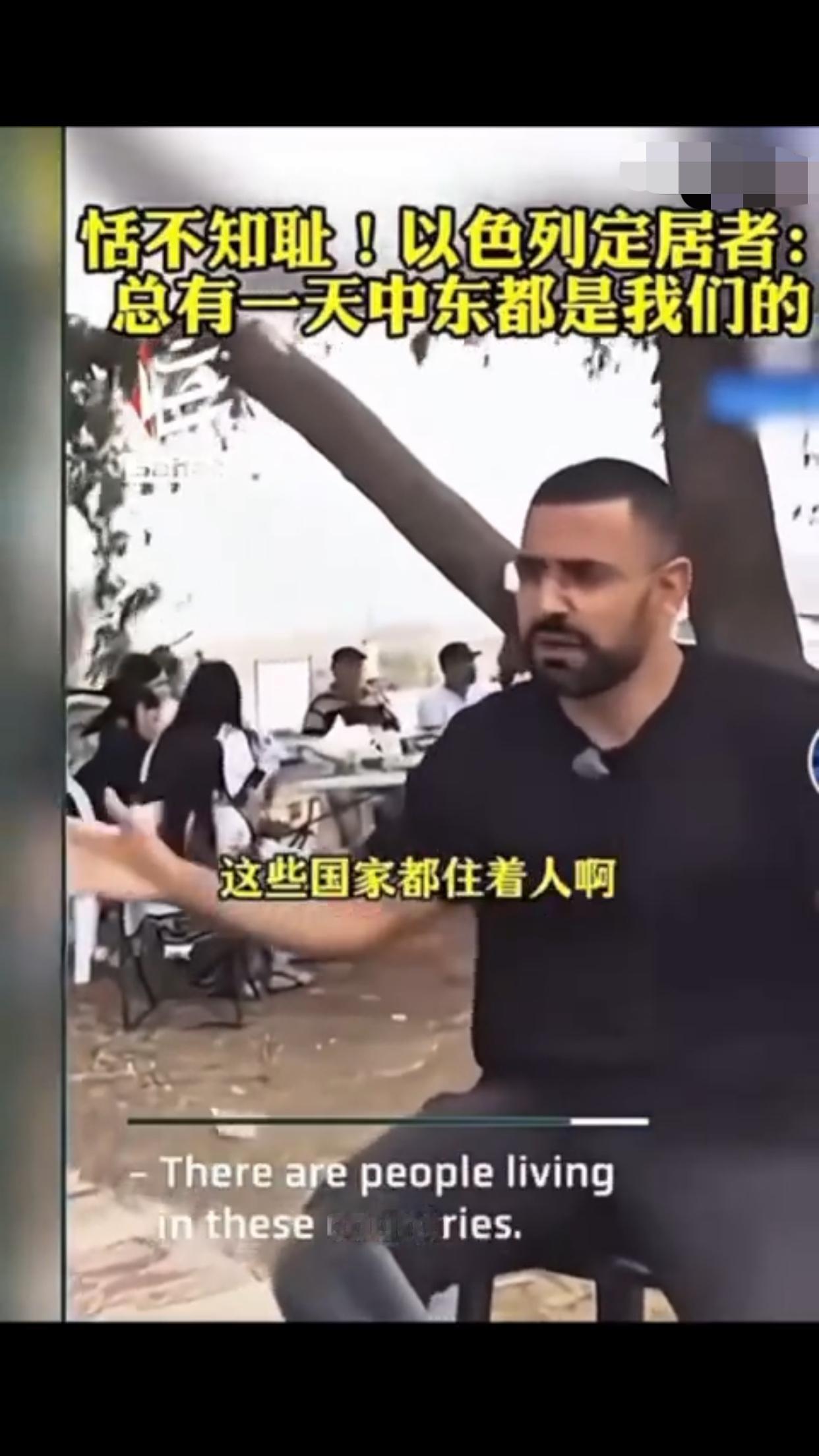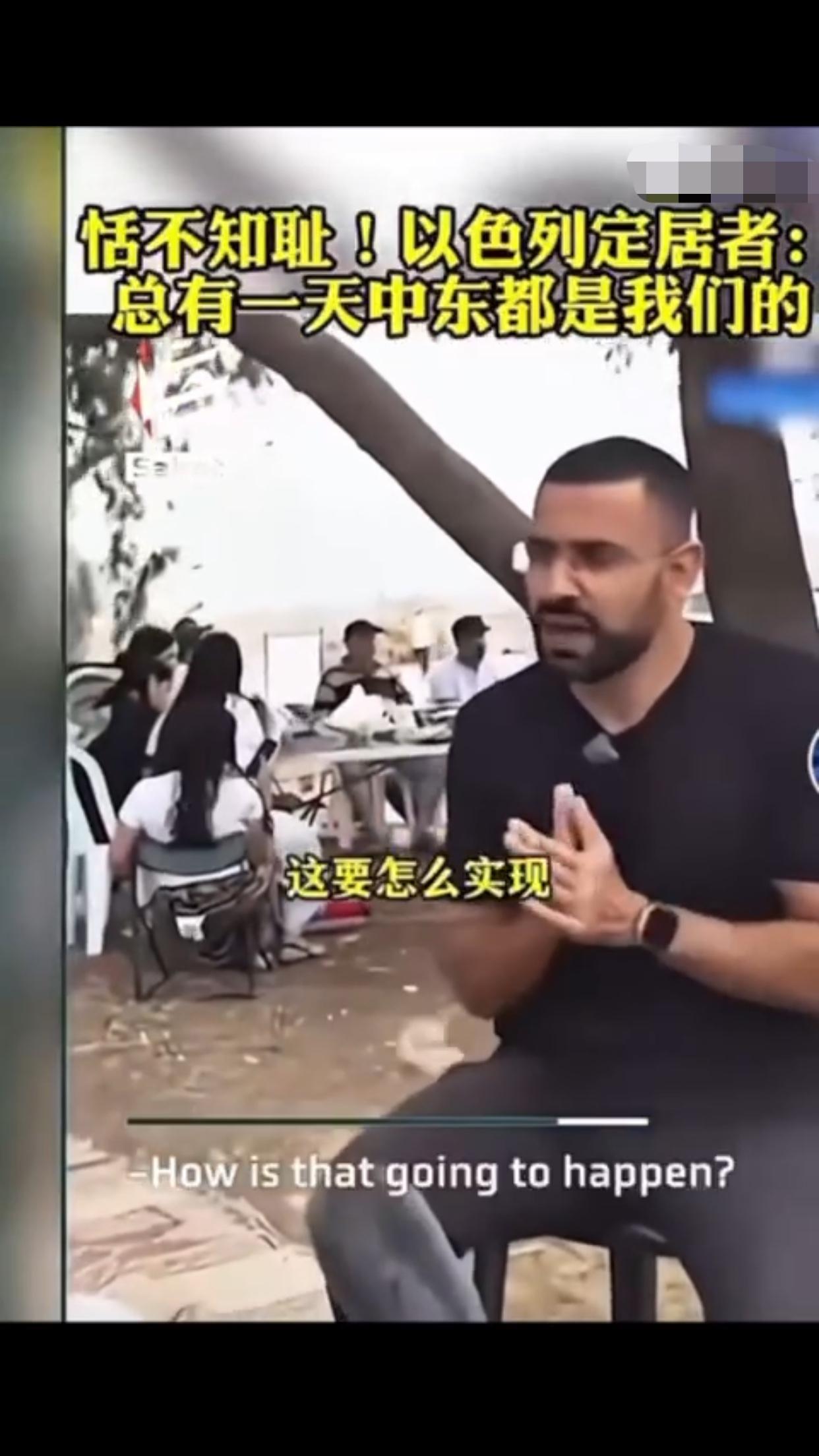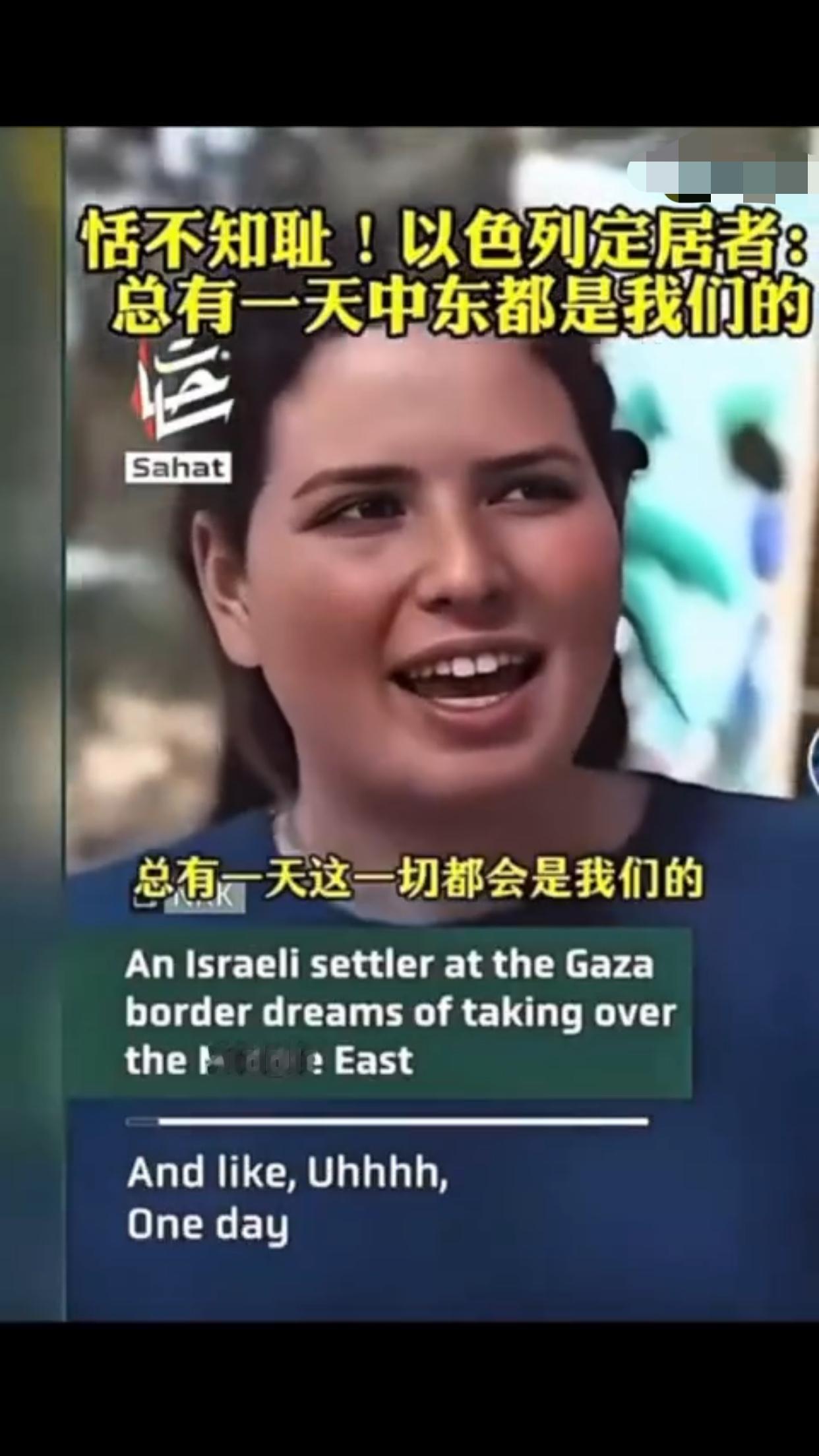 有一位以色列定居者表示:“这是犹太人的家园,总有一天这一切都会是我们的,阿拉伯人也知道,他们也有圣经,而我们的目标就是把以色列从现在的版图扩张出去,包括扩张到叙利亚、埃及、黎巴嫩、约旦的一部分,我对这些计划感到非常激动,即使这意味着我们要吞并那些已经存在的国家,这要怎么实现,这些国家住着的人会怎么样,这是个很好的问题,我不知道,但我知道这一定会实现,因为这不是你的家乡,这是犹太人的家园。”