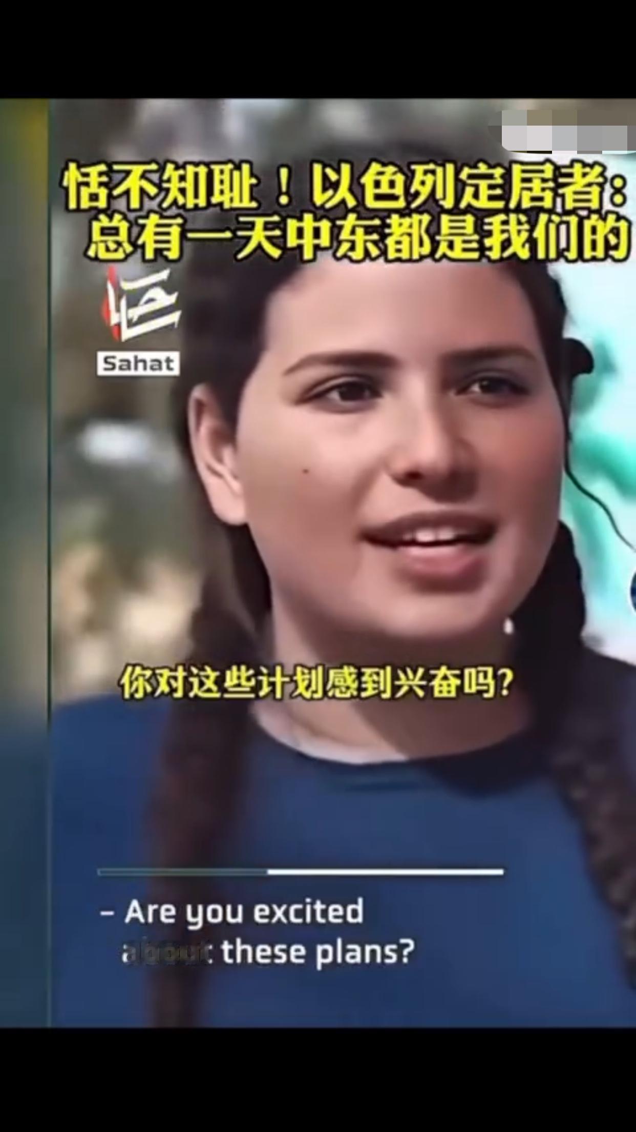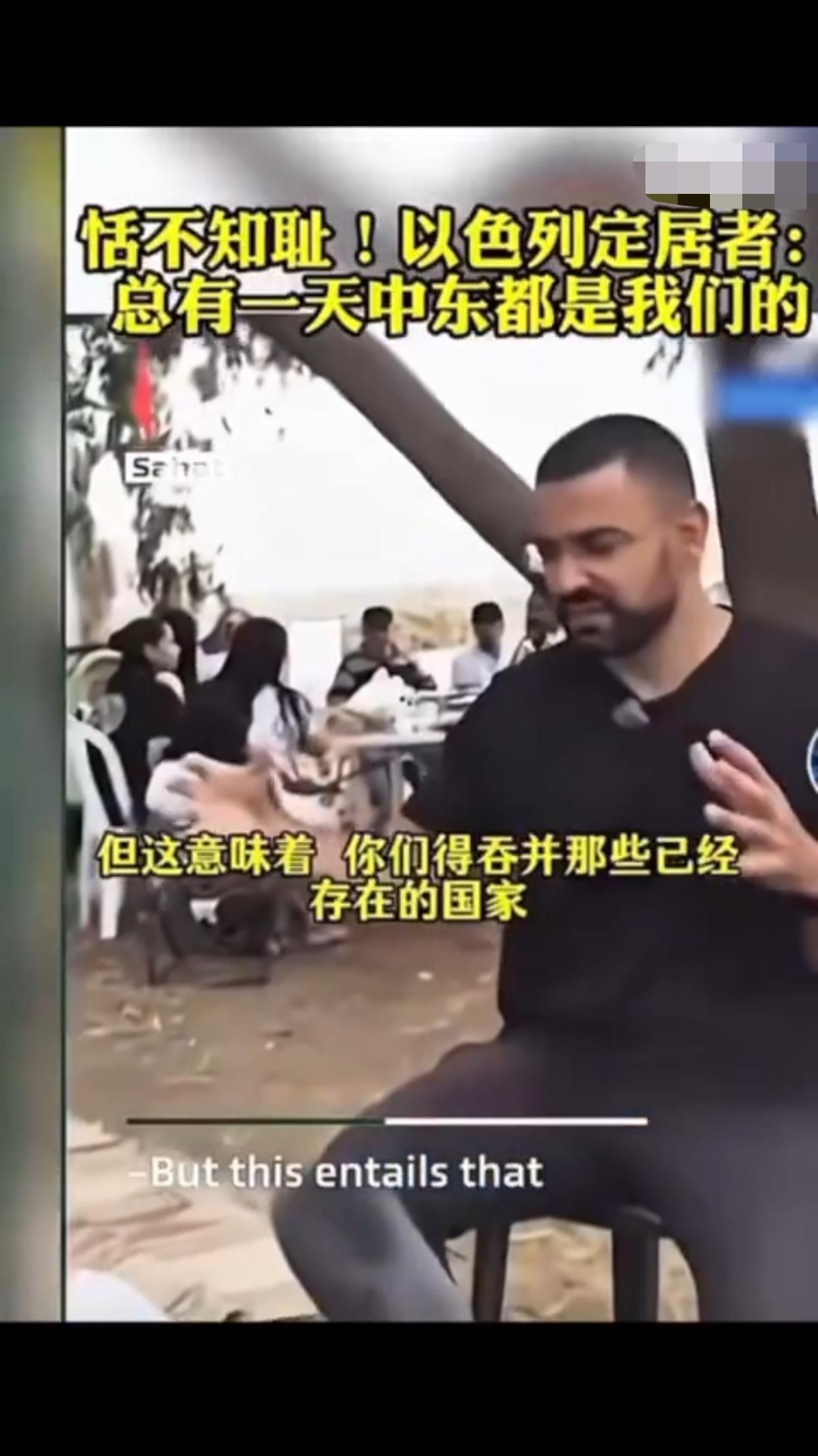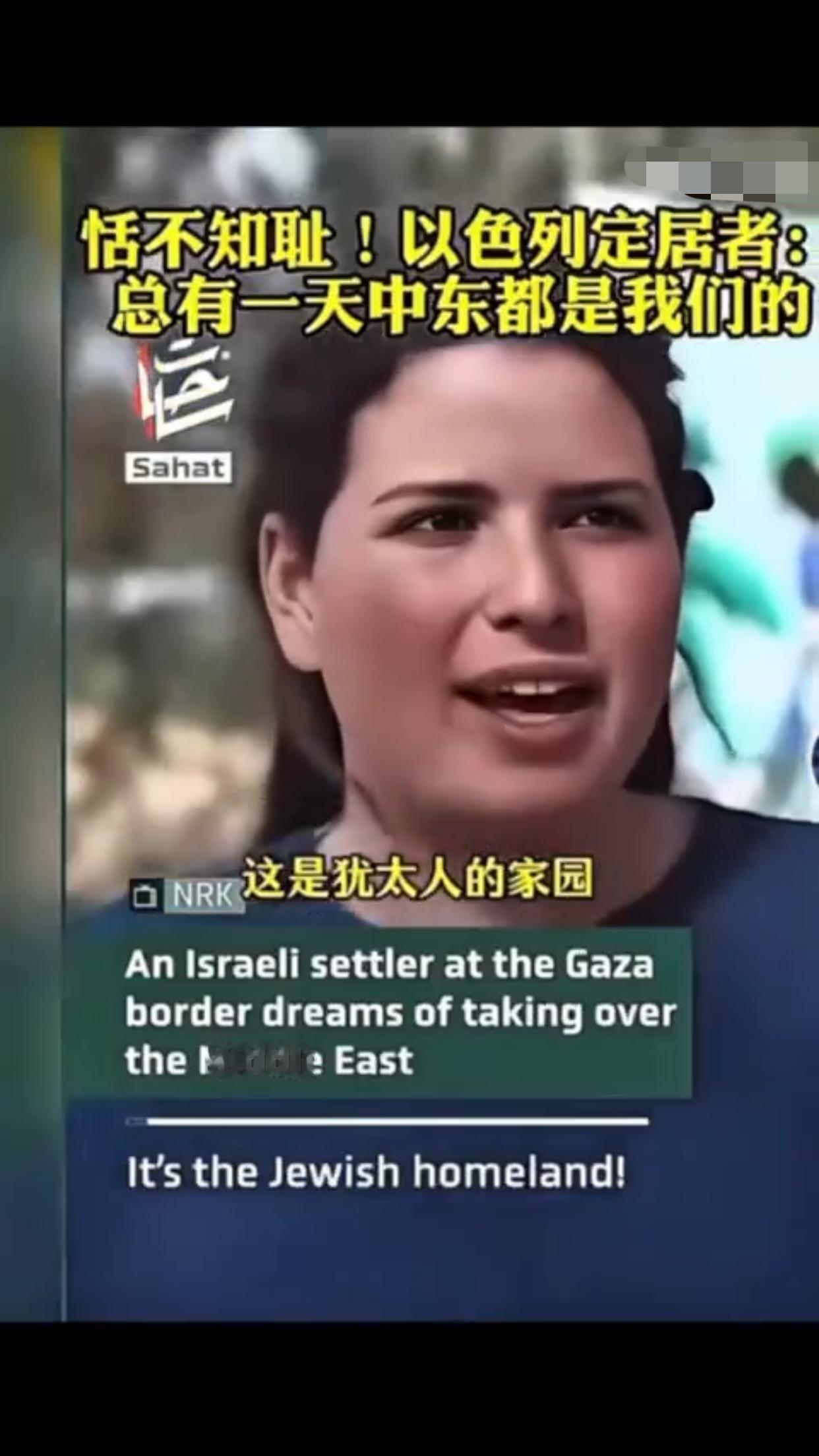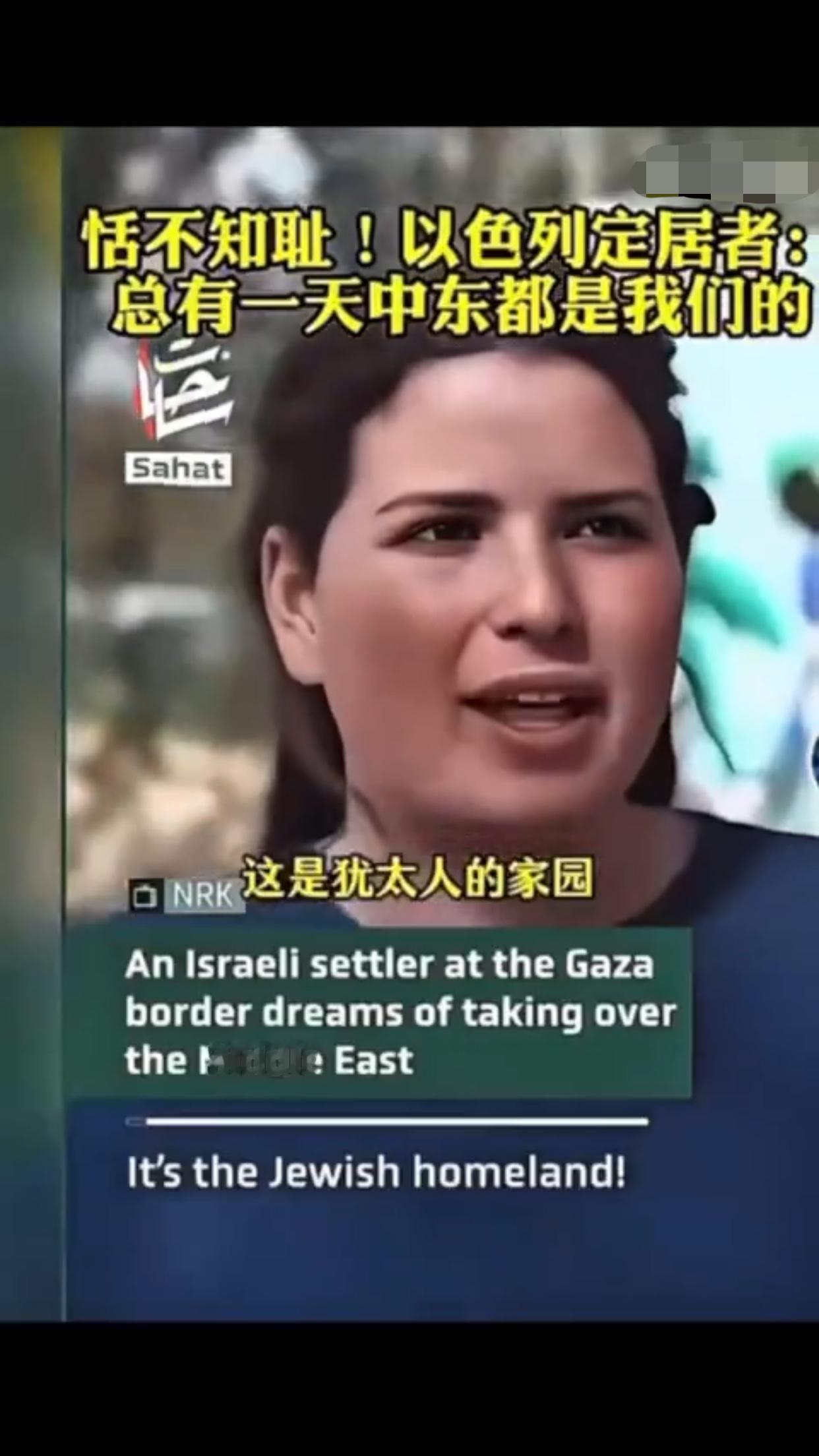 有一位以色列定居者表示:“这是犹太人的家园,总有一天这一切都会是我们的,阿拉伯人也知道,他们也有圣经,而我们的目标就是把以色列从现在的版图扩张出去,包括扩张到叙利亚、埃及、黎巴嫩、约旦的一部分,我对这些计划感到非常激动,即使这意味着我们要吞并那些已经存在的国家,这要怎么实现,这些国家住着的人会怎么样,这是个很好的问题,我不知道,但我知道这一定会实现,因为这不是你的家乡,这是犹太人的家园。”