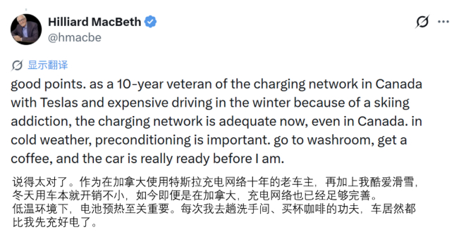 加拿大用户“hmacbe”是一位拥有十年用车经验的特斯拉老车主,同时也是冬季滑雪爱好者,他表示特斯拉超级充电网络即便在低温环境下,体验依旧出色。每次只需去趟洗手间、买杯咖啡的功夫,车辆充电就已经完成。