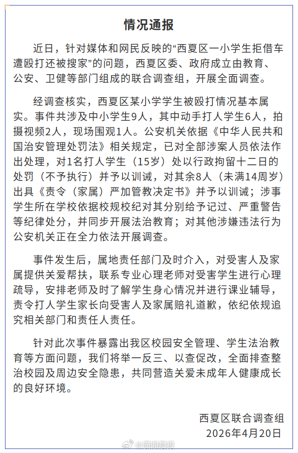 #官方通报小学生拒借车遭殴打还被搜家# 4月20日,银川市西夏区人民政府发布情况通报:近日,针对媒体和网民反映的"西夏区一小学生拒借车遭殴打还被搜家"的问题,西夏区委、政府成立由教育、公安、卫健等部门组成的联合调查组,开展全面调查。经调查核实,西夏区某小学学生被殴打情况基本属实。事件共涉及中小学生9人,其中动手打人学生6人,拍摄视频2人,现场围观1人。公安机关依据相关规定,已对全部涉案人员依法作出处理,对1名打人学生(15岁)处以行政拘留十二日的处罚(不予执行)并予以训诫,对其余8人(未满14周岁)出具并予以训诫;涉事学生所在学校依据校规校纪对其分别给予记过、严重警告等纪律处分,并同步开展法治教育;对其他涉嫌违法行为公安机关正在全力依法开展调查。事件发生后,属地责任部门及时介入,对受害人及家属提供关爱帮扶,联系专业心理老师对受害学生进行心理疏导,安排老师及时了解学生身心情况并进行课业辅导,责令打人学生家长向受害人及家属赔礼道歉,依纪依规追究相关部门和责任人责任。针对此次事件暴露出我区校园安全管理、学生法治教育等方面问题,我们将举一反三、以查促改,全面排查整治校园及周边安全隐患,共同营造关爱未成年人健康成长的良好环境。