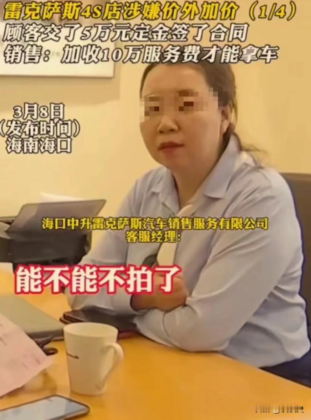 太硬气了吧!2024年,海口一男子花 93 万买雷克萨斯,竟被要求加价 10 万才能提车!男子不服,叫来市场监管局来“撑腰”!可是客服经理居然叫嚣:“那就立案吧!”网友:“如果我是4S老板,直接将这个售后客服经理给开除!这真是凭一人之力,搞坏一个公司的口碑!” 1月16日上午,王先生在海口中升雷克萨斯4S店看中了一辆新款GX550越野车。 双方谈好价格931873元,签了《购车意向合约》,当场交了5万元定金,约定5月10日前提车。 王先生心满意足地走出店门,以为接下来只需要安心等待提车,然而当天下午,4S店的电话就打来了,“王先生,您这个车还得再加10万块钱服务费,不然没法提。” 王先生当场拒绝,在他看来,合约白纸黑字写明了价格,5万定金也交了,哪有临时加价的道理?可4S店的回应简单粗暴——不交钱就不给车。 多次协商无果后,3月5日,4S店在没有征得王先生同意的情况下,直接将5万元定金原路退回,单方面终止了交易。 无奈之下,王先生向海口市商务局投诉举报,随后,商务局联同市场监管局的工作人员一同到店约谈。 面对执法人员的质询,4S店客服经理的态度令人瞠目,她先是表示购车意向合约上没有公司公章和领导签字,因此不认可上面的价格。 市场监管局的工作人员当场反驳:“销售顾问就是代表你们公司!意向协议一旦签订,双方就已经形成事实,它具有法律效力!” 当被要求出示所谓的“10万元增值服务费”具体明细时,客服经理更是语出惊人:“现在这个明细还没有制定出来。”她甚至当场放话:“那就立案吧,法律见!” 这段视频被媒体曝光后迅速引爆网络,网友们给这位客服经理取了一个外号——“立案姐”。 2024年4月,海口市市场监管局正式下达行政处罚决定书,经调查认定,海口中升雷克萨斯4S店的行为已构成价格欺诈。 依据相关法规,责令其改正违法行为,并处45万元罚款,与此同时,该4S店还被列入严重违法失信名单,列入期限为三年。 涉事的客服经理,也已被公司公开开除处理。 一场“加价提车”的闹剧,以45万罚款和“立案姐”走人画上了句号。 2024年还如此明目张胆地加价卖车,底气从何而来? 法律给出了最清楚的回答:合约不是废纸,消费者的权益,容不得任何人肆意践踏。